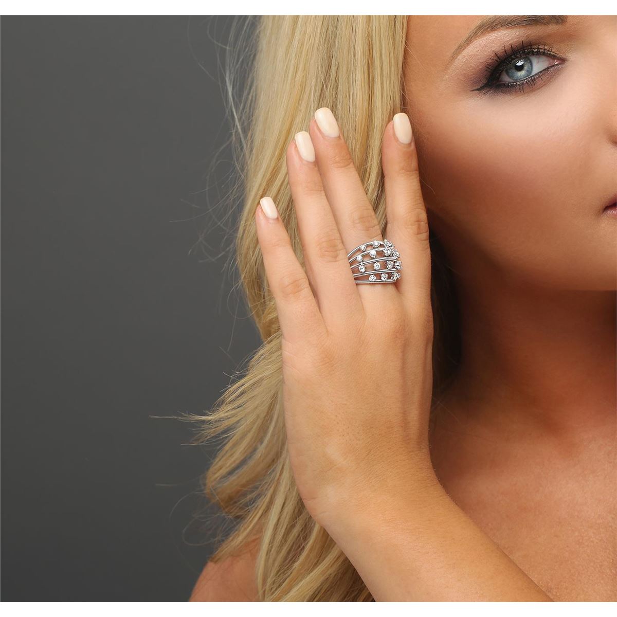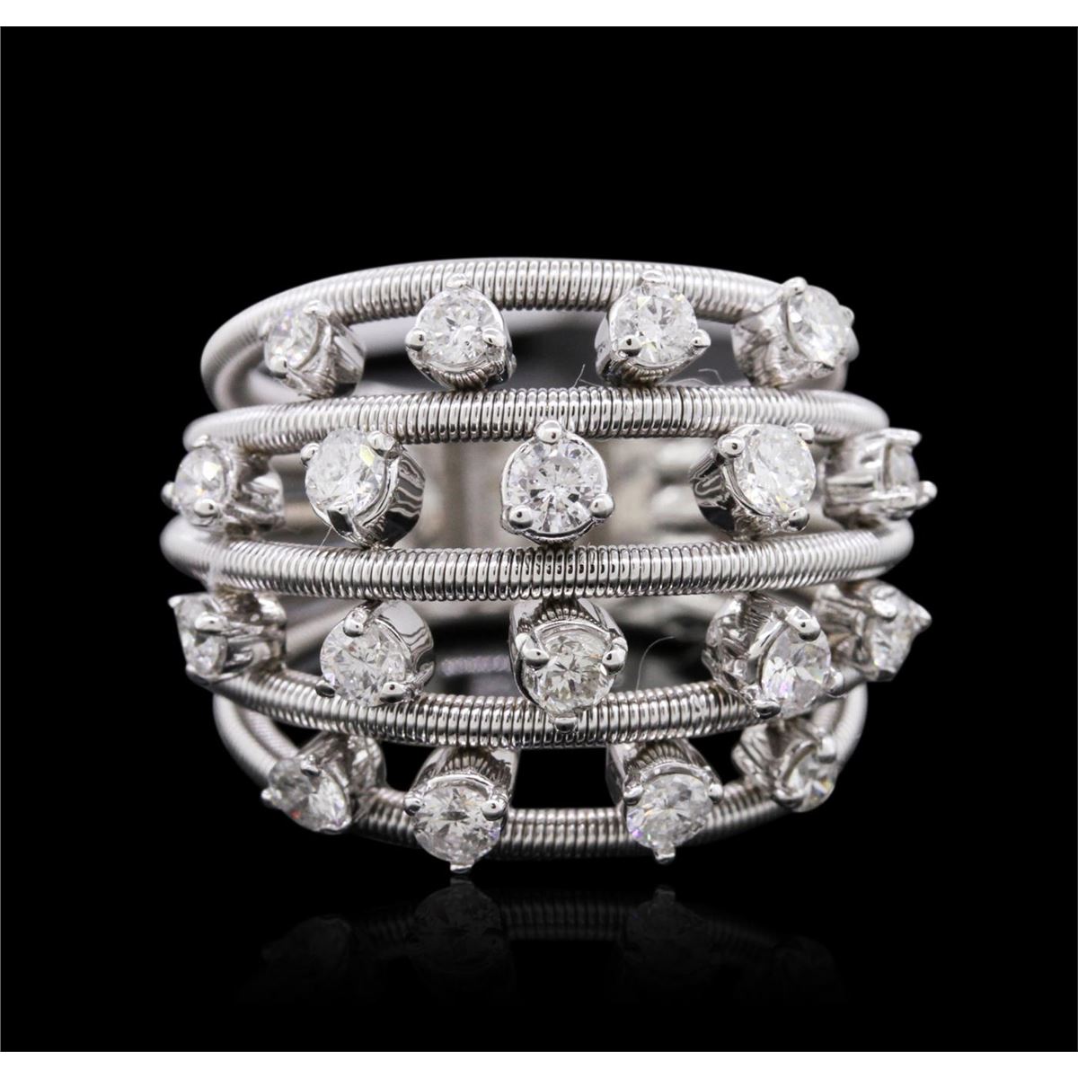 One electronically tested 14KT white gold ladies combination cast & assembled diamond ring with a bright polish finish. Identified with markings of "K14". Condition is new. Containing: Eighteen prong set round brilliant cut diamonds, measuring 2.80 - 2.50 x 1.59mm (depth est.) approximate total weight of 18 Stones = 1.23ct. Clarity: SI-2 to I-1. Color: H - I, Cut is Good. All diamonds are graded in the mounting, unless otherwise stated. Total Weight of Diamonds 1.23ct. Total Weight of Ring 10.90 grams. GGL Appraised at $5,150.00.