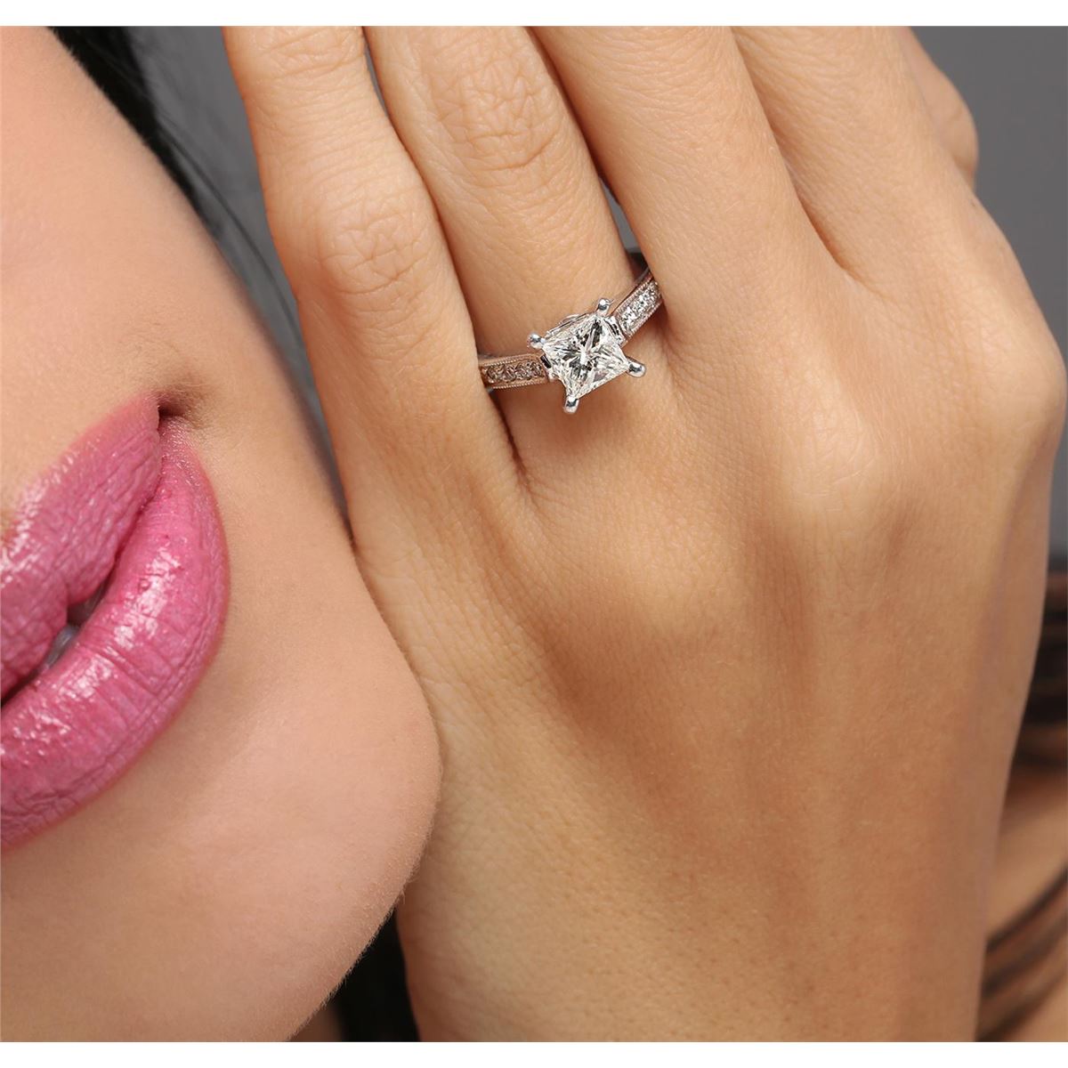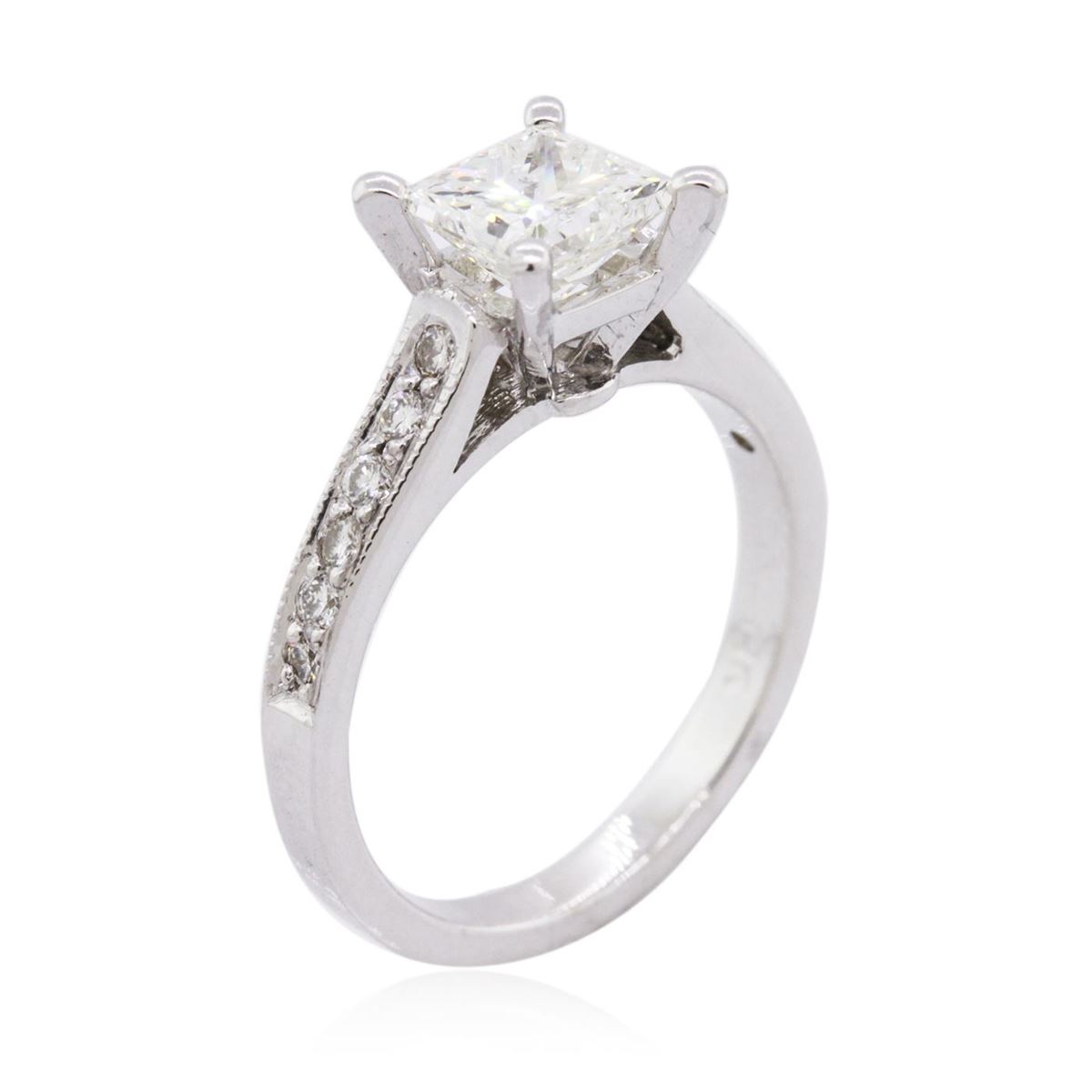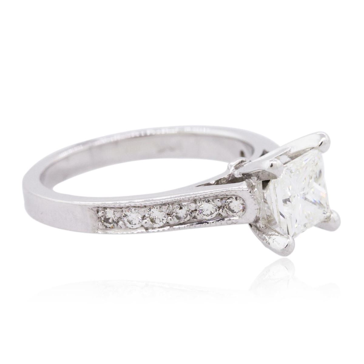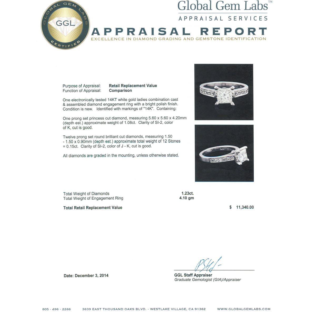 One electronically tested 14KT white gold ladies combination cast & assembled diamond engagement ring with a bright polish finish. Identified with markings of "14K". Condition is new. Containing: One prong set princess cut diamond, measuring 5.60 x 5.60 x 4.20mm (depth est.) approximate weight of 1.08ct. Clarity: SI-2. Color: K, Cut is Good. Twelve prong set round brilliant cut diamonds, measuring 1.50 - 1.50 x 0.90mm (depth est.) approximate total weight of 12 Stones = 0.15ct. Clarity: SI-2. Color: J - K, Cut is Good. All diamonds are graded in the mounting, unless otherwise stated. Total Weight of Diamonds 1.23ct. Total Weight of Engagement Ring 4.10 grams. GGL Appraised at $11,340.00.