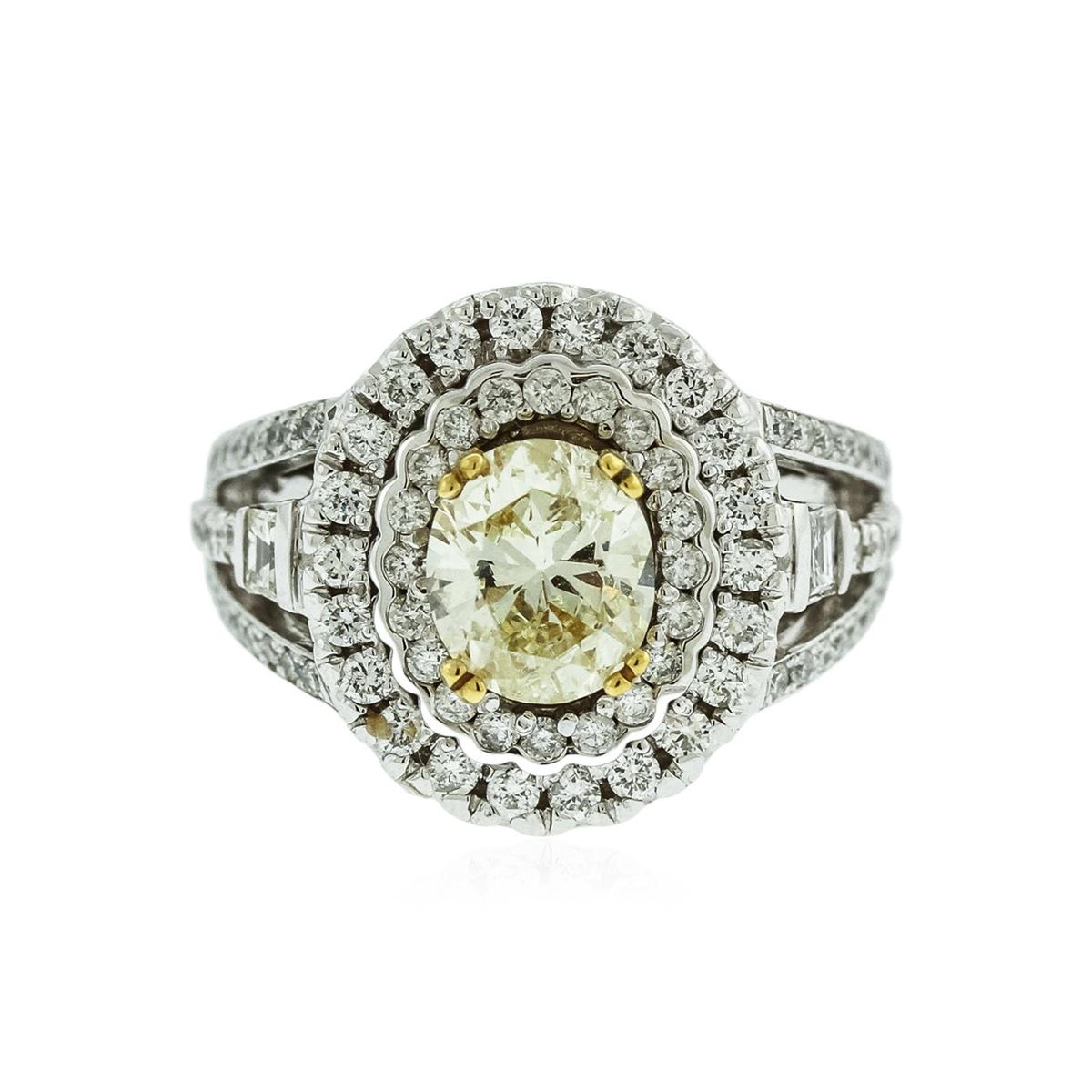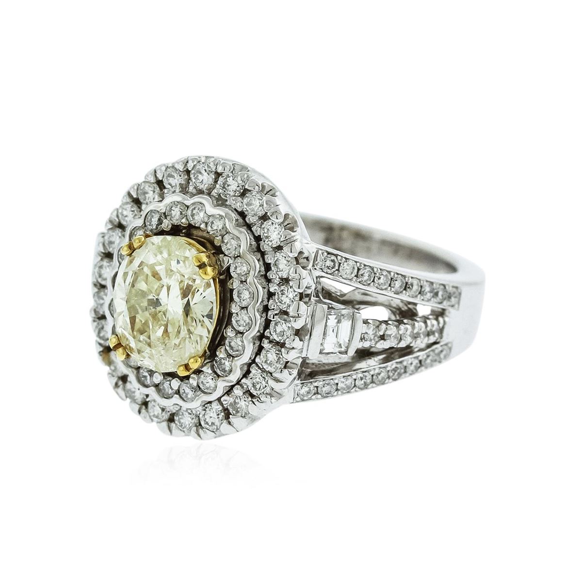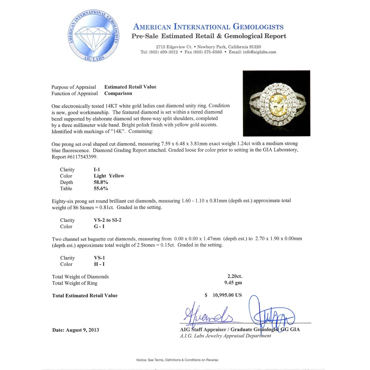 One electronically tested 14KT white gold ladies cast diamond unity ring. Condition is new, good workmanship. The featured diamond is set within a tiered diamond bezel supported by elaborate diamond set three-way split shoulders, completed by a three millimeter wide band. Bright polish finish with yellow gold accents. Identified with markings of "14K". Containing: One prong set oval shaped cut diamond, measuring 7.59 x 6.48 x 3.81mm exact weight 1.24ct with a medium strong blue fluorescence. Diamond Grading Report attached. Graded loose for color prior to setting in the GIA Laboratory, Report #6117543399. Clarity I-1. Color Light Yellow. Depth 58.8%. Table 55.6%. Eighty-six prong set round brilliant cut diamonds, measuring 1.60 - 1.10 x 0.81mm (depth est.) approximate total weight of 86 Stones = 0.81ct. Graded in the setting. Clarity VS-2 to SI - 2. Color G - I Two channel set baguette cut diamonds, measuring from 0.00 x 0.00 x 1.47mm (depth est.) to 2.70 x 1.90 x 0.00mm (depth est.) approximate total weight of 2 Stones = 0.15ct. Graded in the setting. Clarity VS-1. Color H - I. Total weight of Diamond 2.20ct. Total weight of Ring 9.45gm. AIG Appraised at $10,995.00.