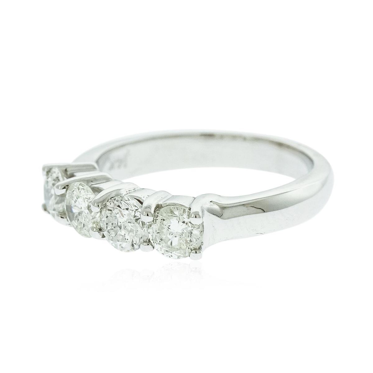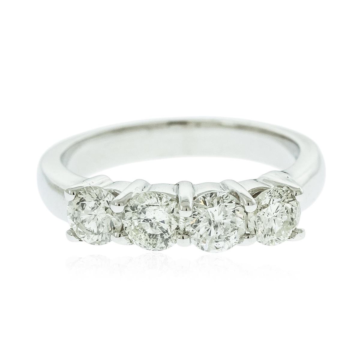 One electronically tested 14KT white gold ladies cast anniversary ring with a bright polish finish. Identified with markings of "14K". Condition is new. Containing: Four prong set round brilliant cut diamonds, measuring 4.46 - 4.32 x 2.64mm (depth est.) approximate total weight of 4 Stones = 1.24ct. Clarity: I-1 to I-2. Color: H - J, Cut is Good. All diamonds are graded in the mounting, unless otherwise stated. Total Weight of Diamonds 1.24ct. Total Weight of Ring 5.00 grams. GGL Appraised at $6,035.00.