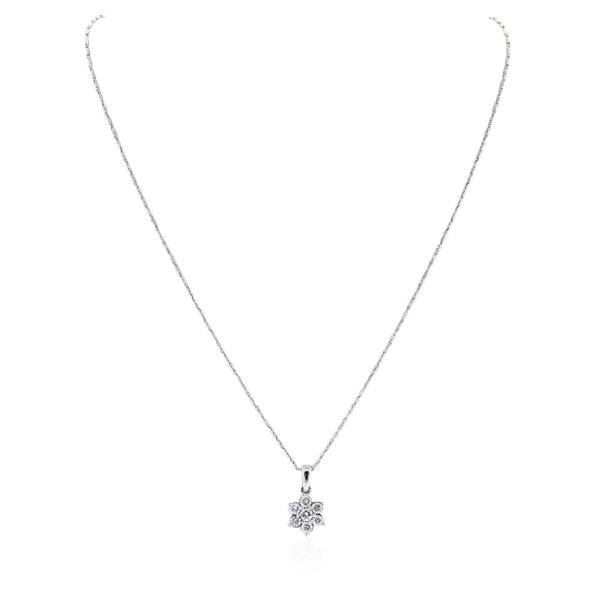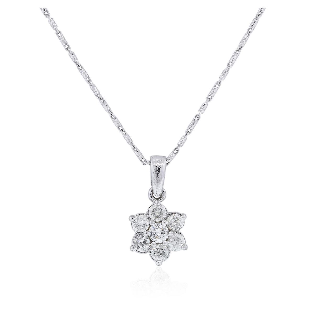 One electronically tested 14KT white gold ladies combination cast & assembled diamond pendant & chain 18.0" long, medium fancy link with a lobster claw clasp with a bright polish finish. Identified with markings of "14K". Condition is new. Containing: Seven prong set round brilliant cut diamonds, measuring 3.80 - 3.50 x 2.19mm (depth est.) approximate total weight of 7 Stones = 1.25ct. Clarity: SI-2 to I-2. Color: I - J, Cut is Good. All diamonds are graded in the mounting, unless otherwise stated. Total Weight of Diamonds 1.25ct. Total Weight of Pendant & Chain 5.90 grams. GGL Appraised at $4,800.00.