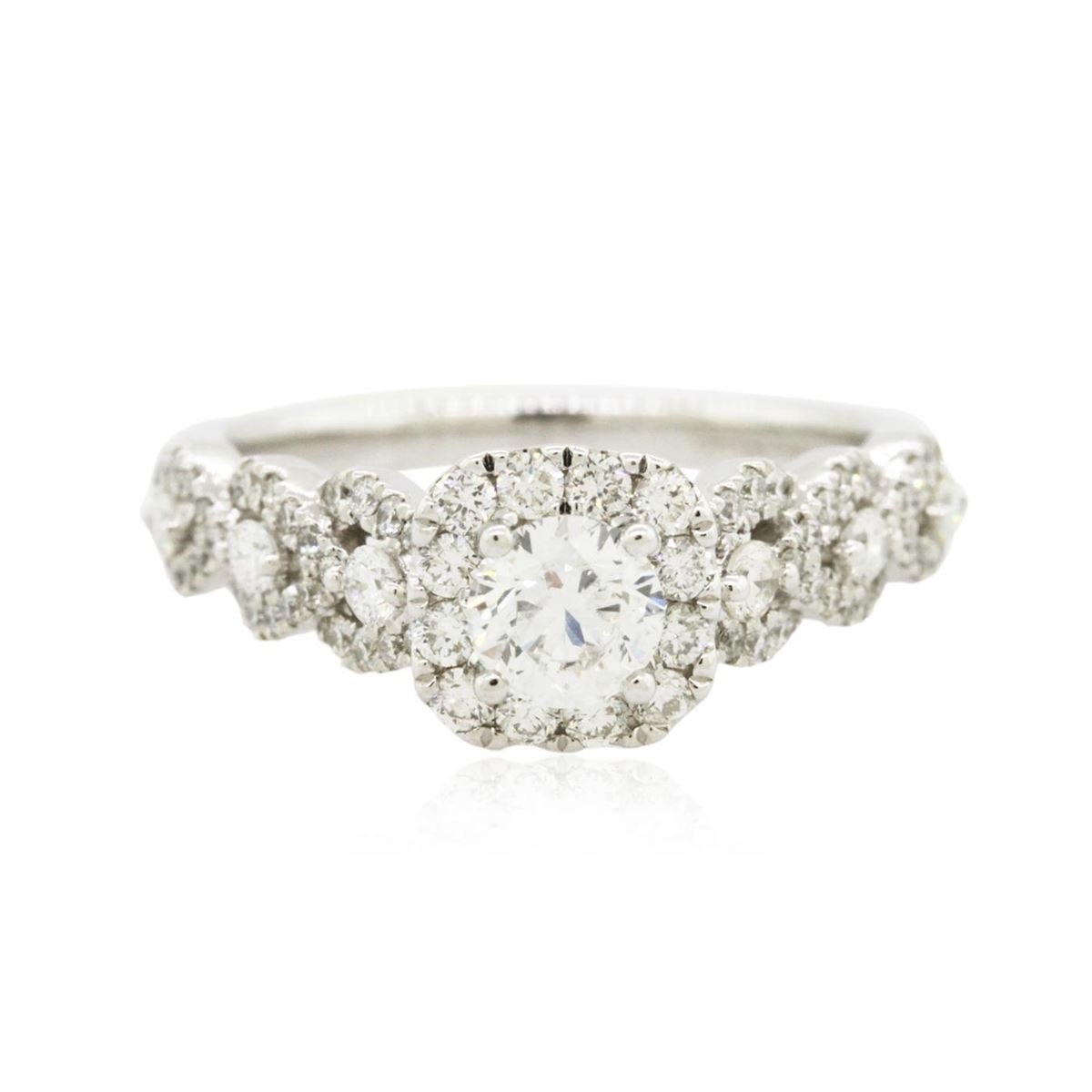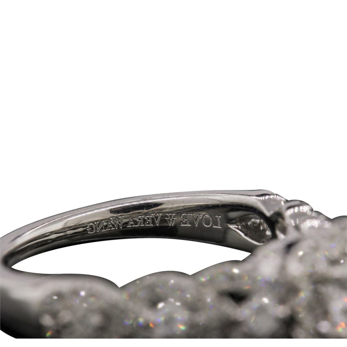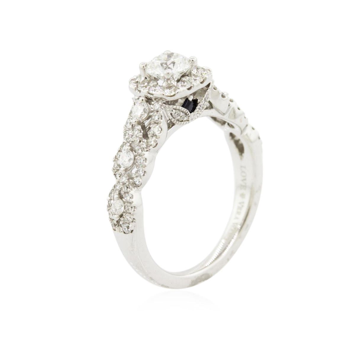 One electronically tested 14KT white gold ladies cast diamond unity ring. Condition is good. The ring is part of Vera Wang's LOVE Collection featuring a round brilliant diamond set within a diamond bezel supported by elaborate diamond set shoulders. Two princess cut blue sapphires accent the diamond set tulip under gallery, completed by a one and one-half millimeter wide band. Bright polish finish with migraine detailing. Trademark is LOVE VERA WANG. Identified with markings of "14K". Containing: One prong set round brilliant cut diamond, measuring 4.85 - 4.80 x 3.10mm (depth est.) approximate weight of 0.50ct. Graded in the setting. Clarity: I-1. Color: HDepth 64.3%. Table 78.8%. Eighty-Six prong & bead set round brilliant cut diamonds (depth est.) approximate. Total Weight of 86 Stones = 0.75ct. Graded in the setting. Clarity: SI-2 to I-1. Color: H - I. Total Weight of Diamonds 1.25ct. Total Weight of Ring 4.48 grams. AIG Appraised at $4,000.00.