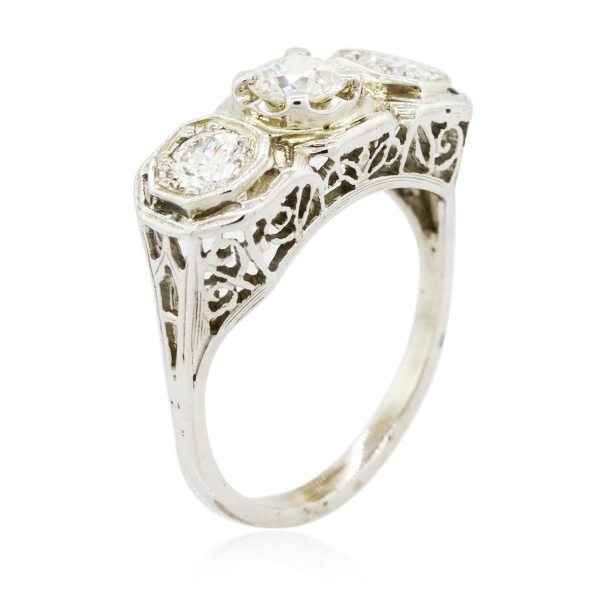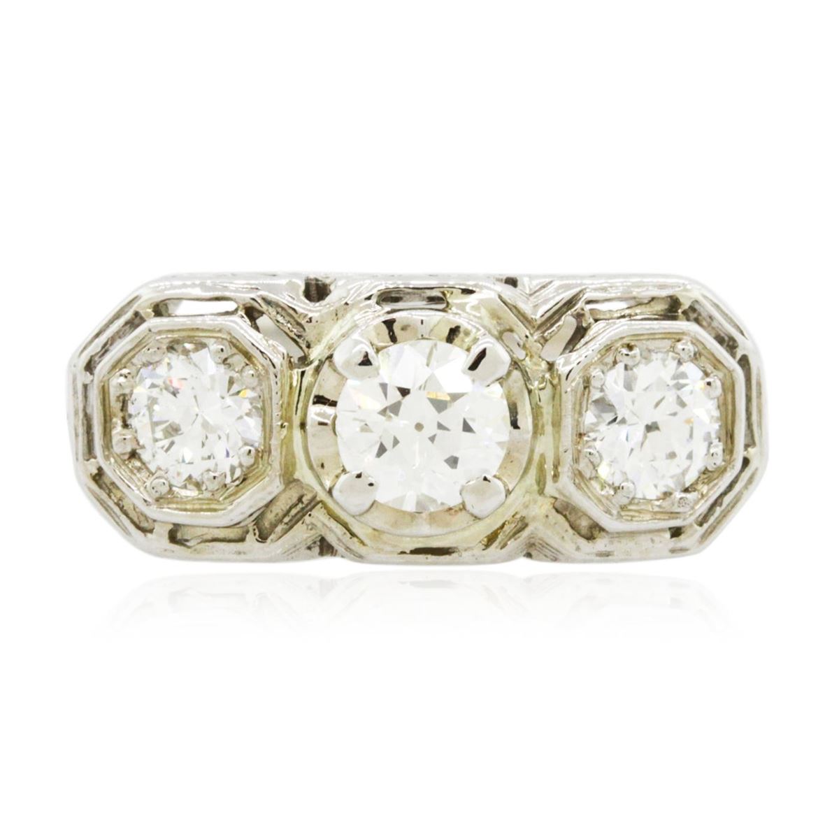 One electronically tested 14KT white gold ladies cast diamond ring with a bright polish finish. The ring features a diamond trio supported by an elaborate lattice under gallery, completed by a one and one-half millimeter wide band. The ring is reminiscent of the jewelry designs from the Edwardian Period. Lace translated into diamonds. This is the phrase used to describe Edwardian jewelry. The Edwardian Period was a short period, dating from 1901 to 1910, during the reign of King Edward VIII, son of Queen Victoria It had its roots in the final years of the Victorian period. Diamonds were made to look as fine and delicate as possible. Princess Alexandra, Edward's wife, and the Princess of Wales had a great influence on the jewelry of the period. Edwardian jewelry was the first to reflect a dramatic progress made in gem stone cutting. Condition is good. Containing: One prong set Old European cut diamond, measuring 5.26 - 5.25 x 3.00mm (depth est.) approximate weight of 0.60ct with a faint blue fluorescence. Cutting style circa early 20th century. Graded in the setting. Clarity: SI-1. Color: I Two prong set round brilliant cut diamonds, measuring 4.30 - 4.20 x 2.50mm (depth est.) approximate total weight of 2 Stones = 0.65ct. Graded in the setting. Clarity: VS-2 to SI-1. Color: H - I. Total Weight of Diamonds 1.25ct. Total Weight of Ring 3.92 grams. AIG Appraised at $7,545.00.