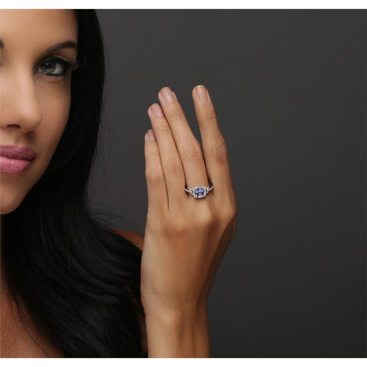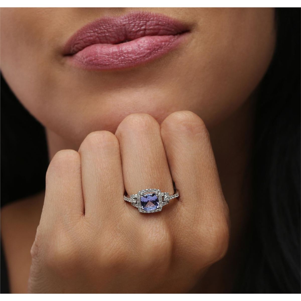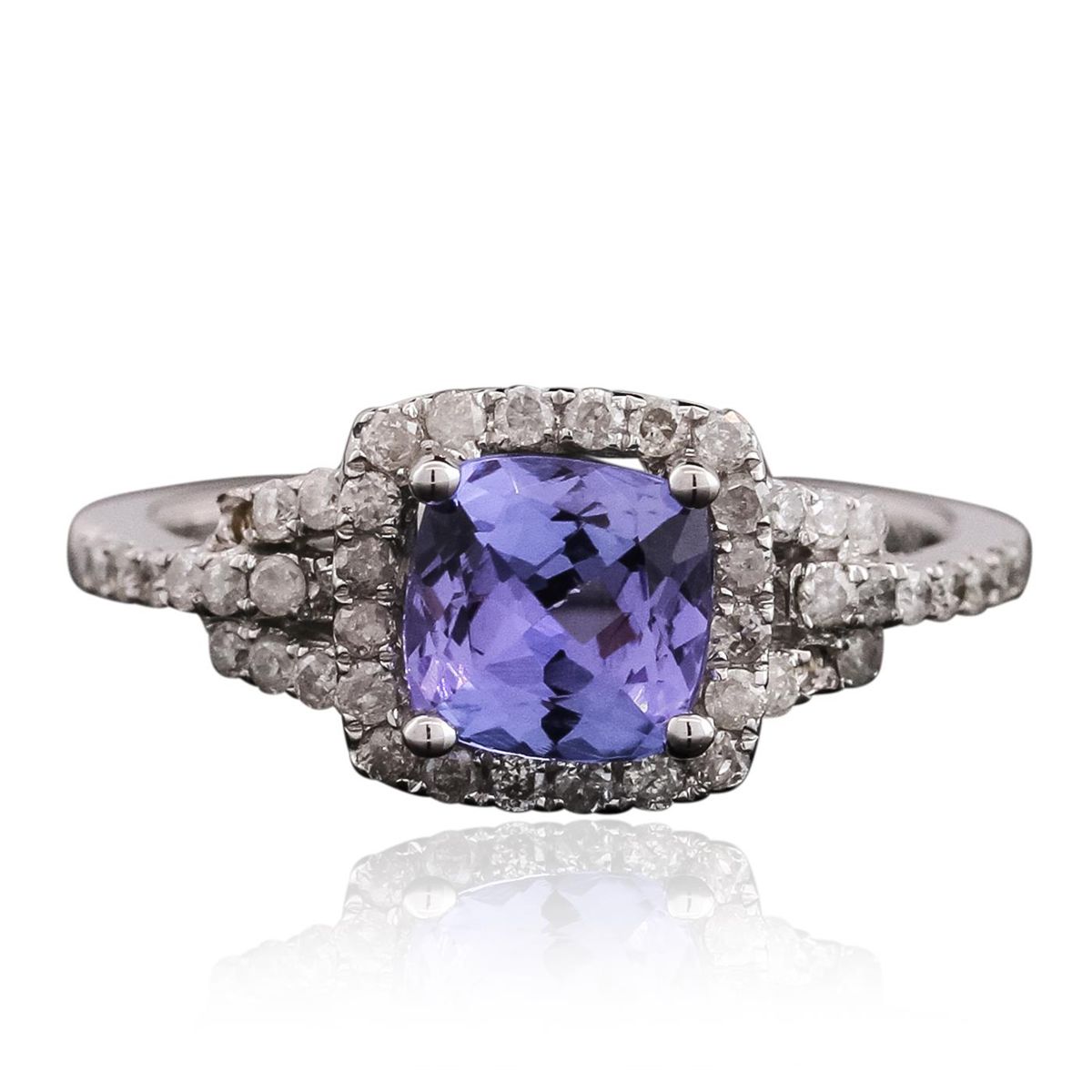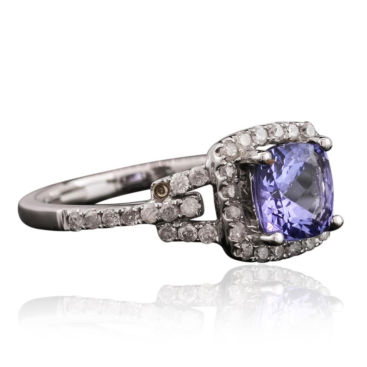 One electronically tested 14KT white gold ladies combination cast & assembled tanzanite and diamond ring with a flat shank with a bright polish finish. Identified with markings of "14K". Condition is new. Containing: One prong set square cushion modified brilliant cut natural tanzanite, measuring 6.42 x 6.42 x 3.85mm, approximate weight of 1.25ct., clarity is eye clean, type I, medium, very slightly grayish, violet color, (GIA V 5/3), cut is good. Forty-Five prong set round brilliant cut diamonds, measuring 1.10 - 1.10 x 0.66mm (depth est.) approximate total weight of 45 Stones = 0.22ct. Clarity: I-1 to I-2. Color: I - J, Cut is Good. Colored gemstones are presumed to have been subjected to commonly used enhancement processes. All diamonds and colored gemstones are graded in the mounting, unless otherwise stated. Total Weight of Colored Stones 1.25ct. Total Weight of Diamonds 0.22ct. Total Weight of Ring 3.20 grams. GGL Appraised at $3,490.00.