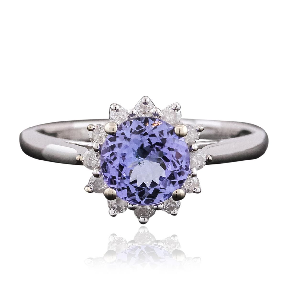 One electronically tested 14KT white gold ladies cast tanzanite and diamond ring with a bright polish finish. The featured tanzanite is set within a diamond bezel, completed by a one and one-half millimeter wide band. Trademark is Orianne. Identified with markings of "14K". Condition is new, good workmanship. Containing: One prong set round brilliant cut natural tanzanite, measuring 7.00 - 6.99 x 3.60 mm, 6% bulge factor, approximate weight of 1.25ct., clarity is eye clean, type I, medium dark, very slightly grayish, bluish violet color, (GIA bV 6/3), cut is good. Transmitting light with no distortion, transparent. Graded in the setting. Tanzanite is a very rare gemstone that is only found in the country of Tanzania. Originally discovered in 1967. Tiffany & Company, named the stone Tanzanite. It is found in the Usumburu Mountains that border the Umba Valley of northern Tanzania. Tanzanite occurs in gray, brown, violet, blue, reddish-purple, & green. The gem is interesting because of its exceptional pleochroism. Rotated in different directions a tanzanite will exhibit multiple changes of color. Tanzanite has a low tolerance to ultrasonic cleaning, and should not be cleaned using this method. Twelve prong set round brilliant cut diamonds, measuring 1.60 - 1.50 x 0.93mm (depth est.) approximate total weight of 12 Stones = 0.26ct. Graded in the setting. Clarity: I-1 to I-2. Color: G - I. Total Weight of Colored Stones 1.25ct. Total Weight of Diamonds 0.26ct. Total Weight of Ring 2.14 grams. AIG Appraised at $3,385.00.
