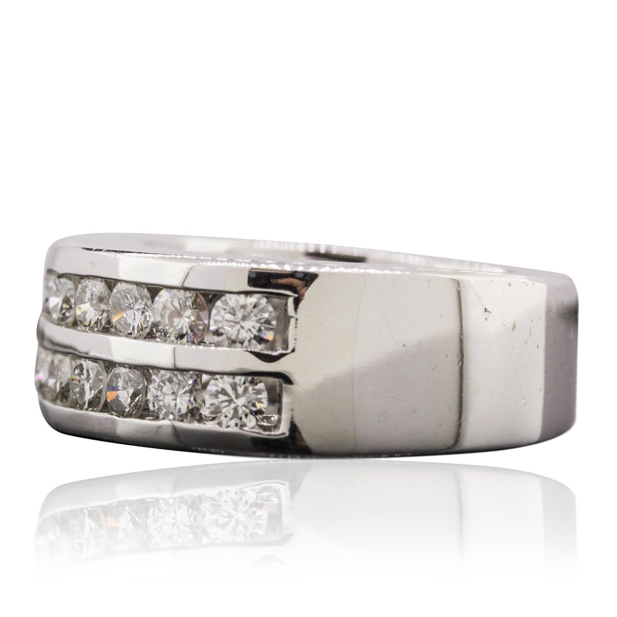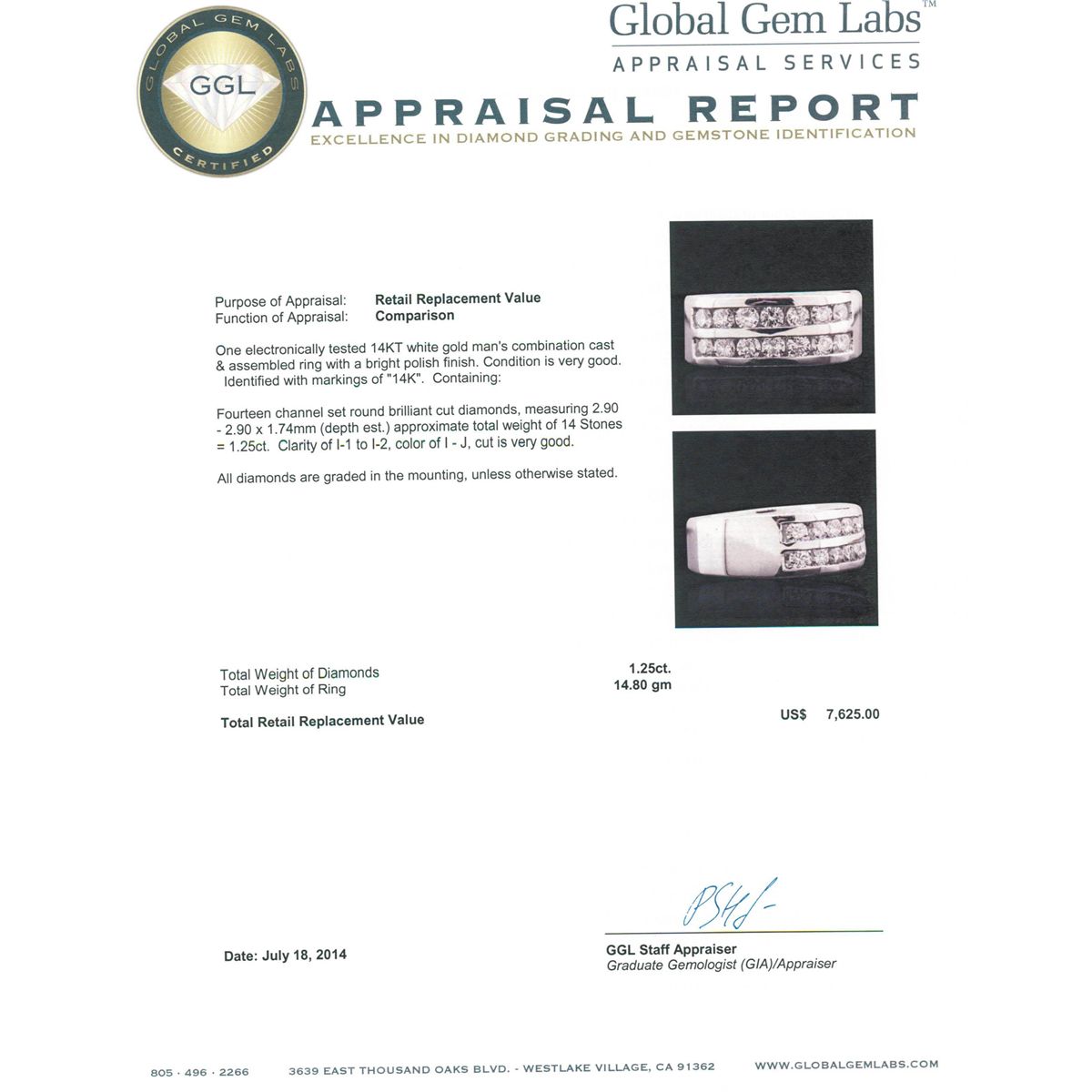 One electronically tested 14KT white gold man's combination cast & assembled ring with a bright polish finish. Condition is very good. Identified with markings of "14K". Containing: Fourteen channel set round brilliant cut diamonds, measuring 2.90 - 2.90 x 1.74mm (depth est.) approximate. Total Weight of 14 Stones = 1.25ct. Clarity: I-1 to I-2. Color: I - J, Cut is Very Good. All diamonds are graded in the mounting, unless otherwise stated. Total Weight of Diamonds 1.25ct. Total Weight of Ring 14.80 grams.. GGL Appraised at $7,625.00.