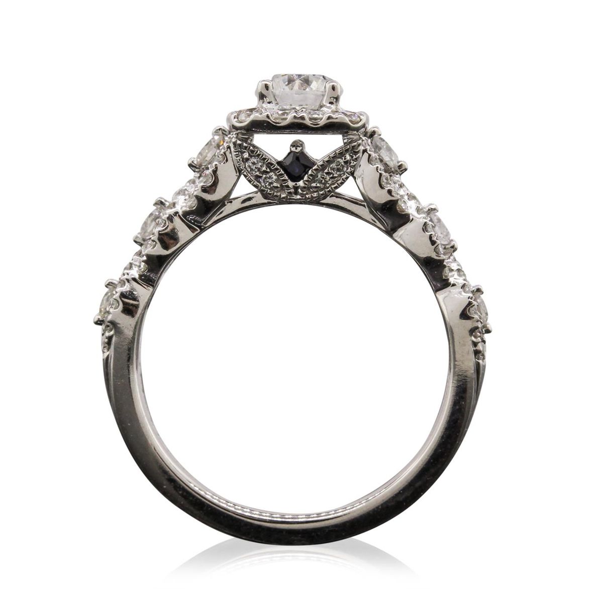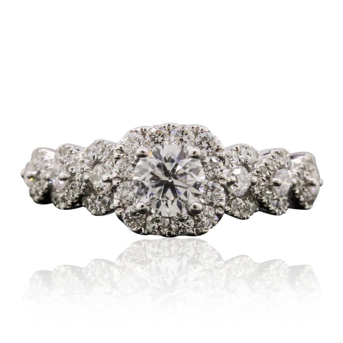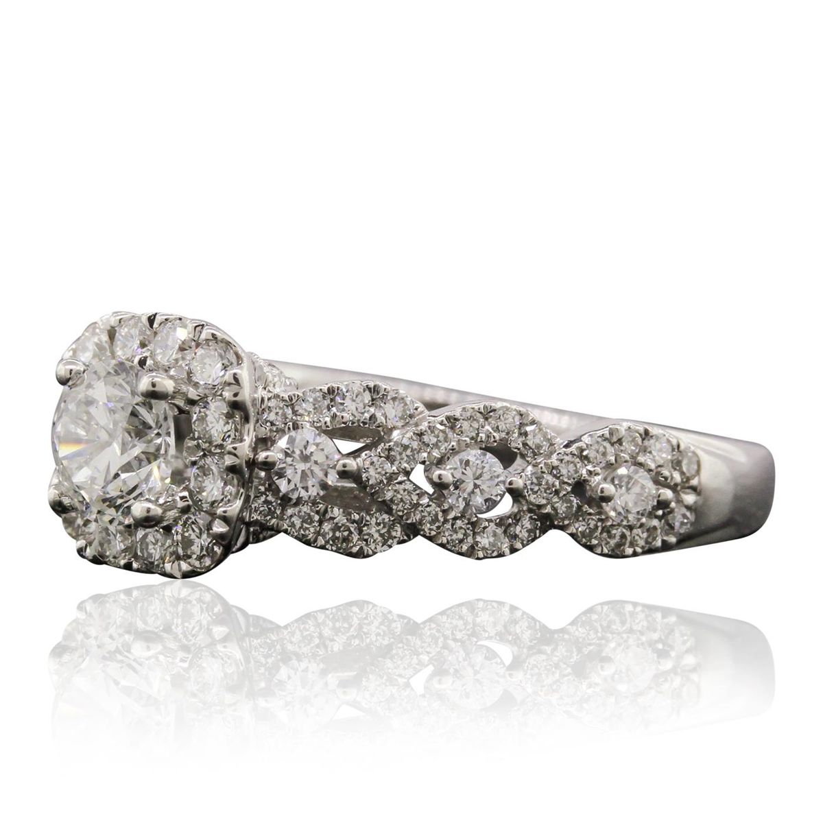 One electronically tested 14KT white gold ladies cast diamond unity ring. Condition is good. The ring is part of Vera Wang's LOVE Collection featuring a round brilliant diamond set within a diamond bezel supported by elaborate diamond set shoulders. Two princess cut blue sapphires accent the diamond set tulip under gallery, completed by a one and one-half millimeter wide band. Bright polish finish with migraine detailing. Trademark is LOVE VERA WANG. Identified with markings of "14K". Containing: One prong set round brilliant cut diamond, measuring 4.85 - 4.80 x 3.10mm (depth est.) approximate weight of 0.50ct. Graded in the setting. Clarity: I-1. Color: HDepth 64.3%. Table 78.8%. Eighty-Six prong & bead set round brilliant cut diamonds (depth est.) approximate. Total Weight of 86 Stones = 0.75ct. Graded in the setting. Clarity: SI-2 to I-1. Color: H - I. Total Weight of Diamonds 1.25ct. Total Weight of Ring 4.48 grams. AIG Appraised at $4,000.00.