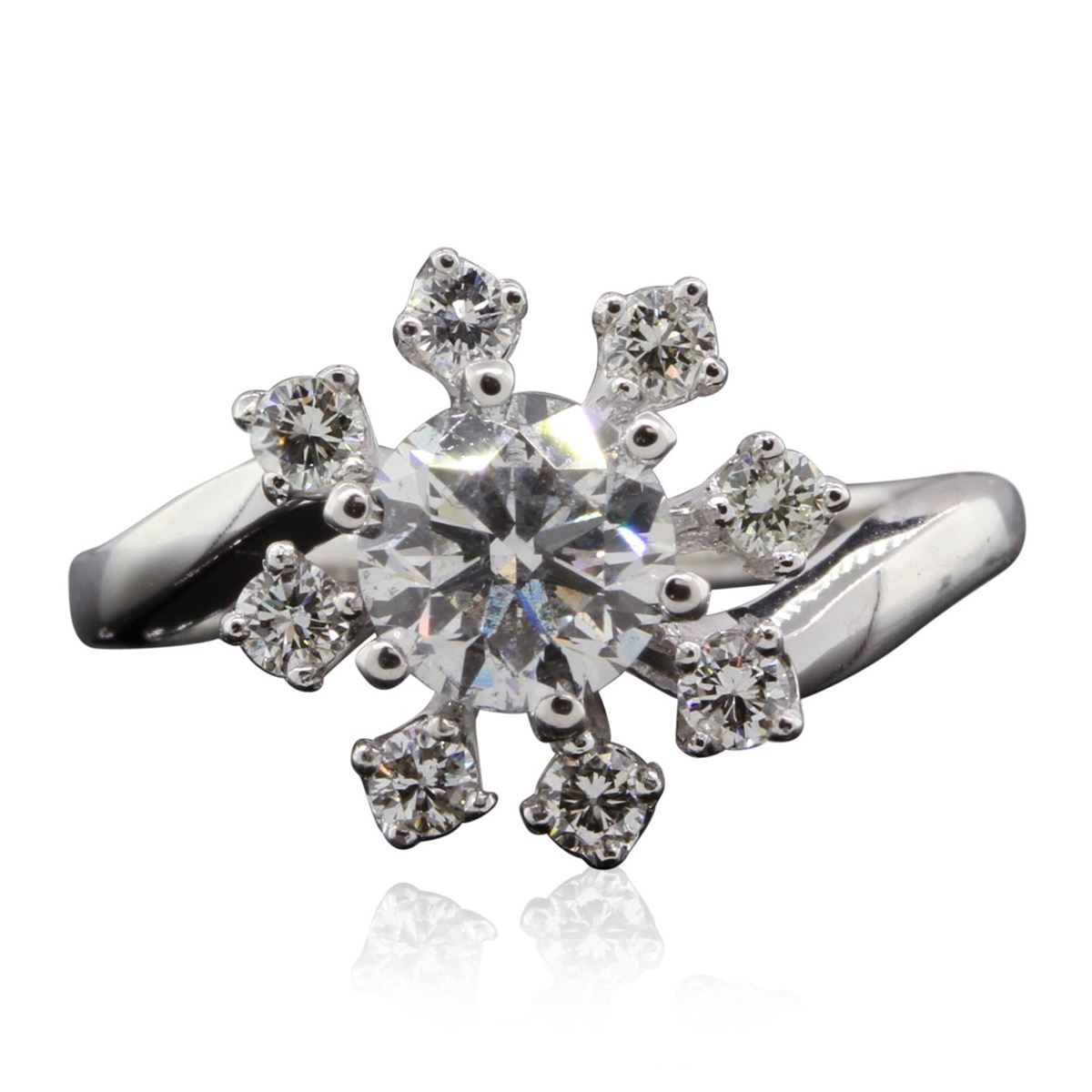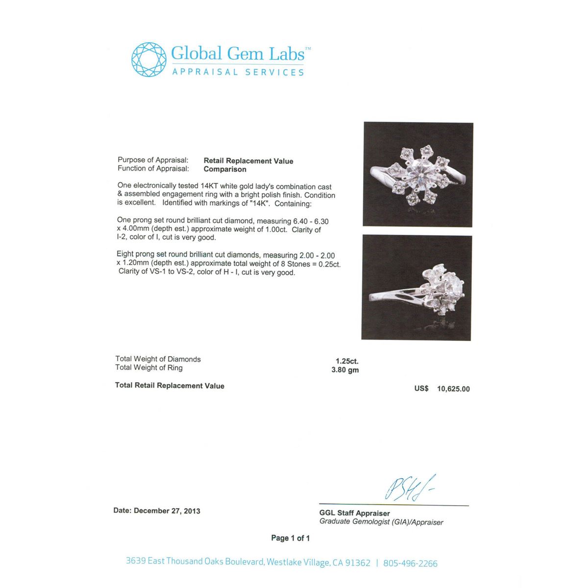 One electronically tested 14KT white gold Ladies combination cast & assembled engagement ring with a bright polish finish. Identified with markings of "14K". Condition is excellent. Containing: One prong set round brilliant cut diamond, measuring 6.40 - 6.30 x 4.00mm (depth est.) approximate weight of 1.00ct. Clarity of I-2, Color of I, Cut is Very Good. Eight prong set round brilliant cut diamonds, measuring 2.00 - 2.00 x 1.20mm (depth est.) approximate total weight of 8 Stones = 0.25ct. Clarity of VS-1 to VS-2, Color of H - I, Cut is Very Good. Total Weight of Diamonds 1.25ct. Total Weight of Ring 3.80gm. GGL Appraised at $10,625.00.