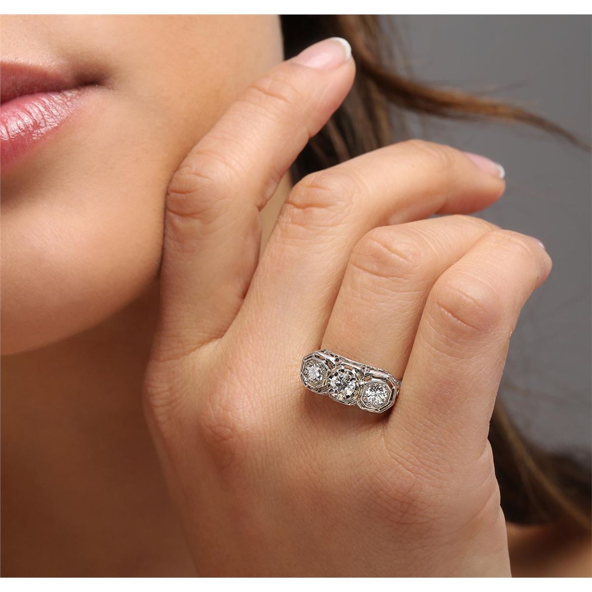 One electronically tested 14KT white gold ladies cast diamond ring with a bright polish finish. The ring features a diamond trio supported by an elaborate lattice under gallery, completed by a one and one-half millimeter wide band. The ring is reminiscent of the jewelry designs from the Edwardian Period. Lace translated into diamonds. This is the phrase used to describe Edwardian jewelry. The Edwardian Period was a short period, dating from 1901 to 1910, during the reign of King Edward VIII, son of Queen Victoria It had its roots in the final years of the Victorian period. Diamonds were made to look as fine and delicate as possible. Princess Alexandra, Edward's wife, and the Princess of Wales had a great influence on the jewelry of the period. Edwardian jewelry was the first to reflect a dramatic progress made in gem stone cutting. Condition is good. Containing: One prong set Old European cut diamond, measuring 5.26 - 5.25 x 3.00mm (depth est.) approximate weight of 0.60ct with a faint blue fluorescence. Cutting style circa early 20th century. Graded in the setting. Clarity: SI-1. Color: I Two prong set round brilliant cut diamonds, measuring 4.30 - 4.20 x 2.50mm (depth est.) approximate total weight of 2 Stones = 0.65ct. Graded in the setting. Clarity: VS-2 to SI-1. Color: H - I. Total Weight of Diamonds 1.25ct. Total Weight of Ring 3.92 grams. AIG Appraised at $7,545.00.