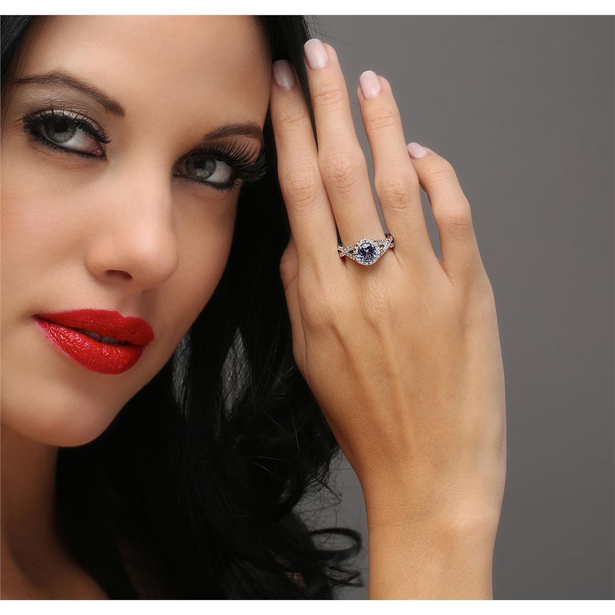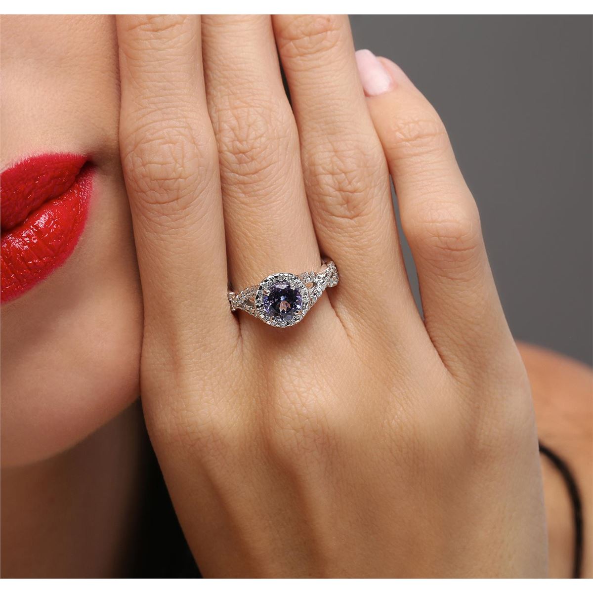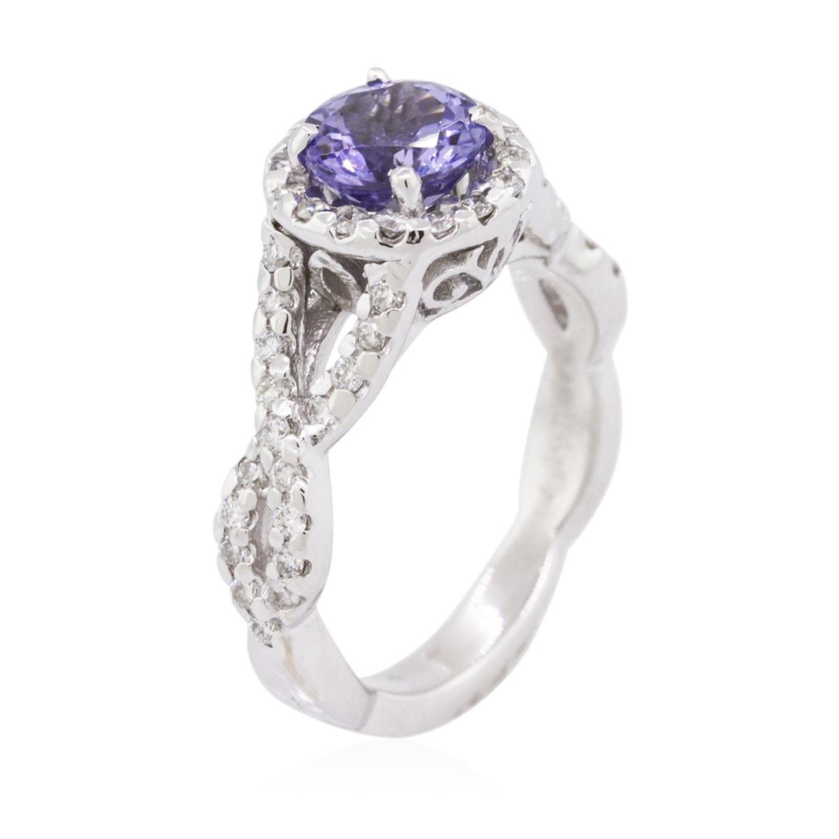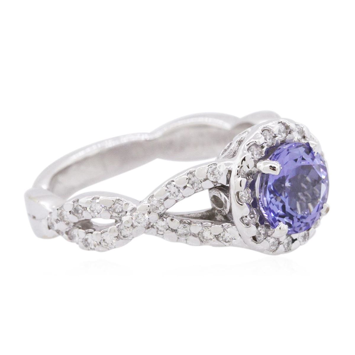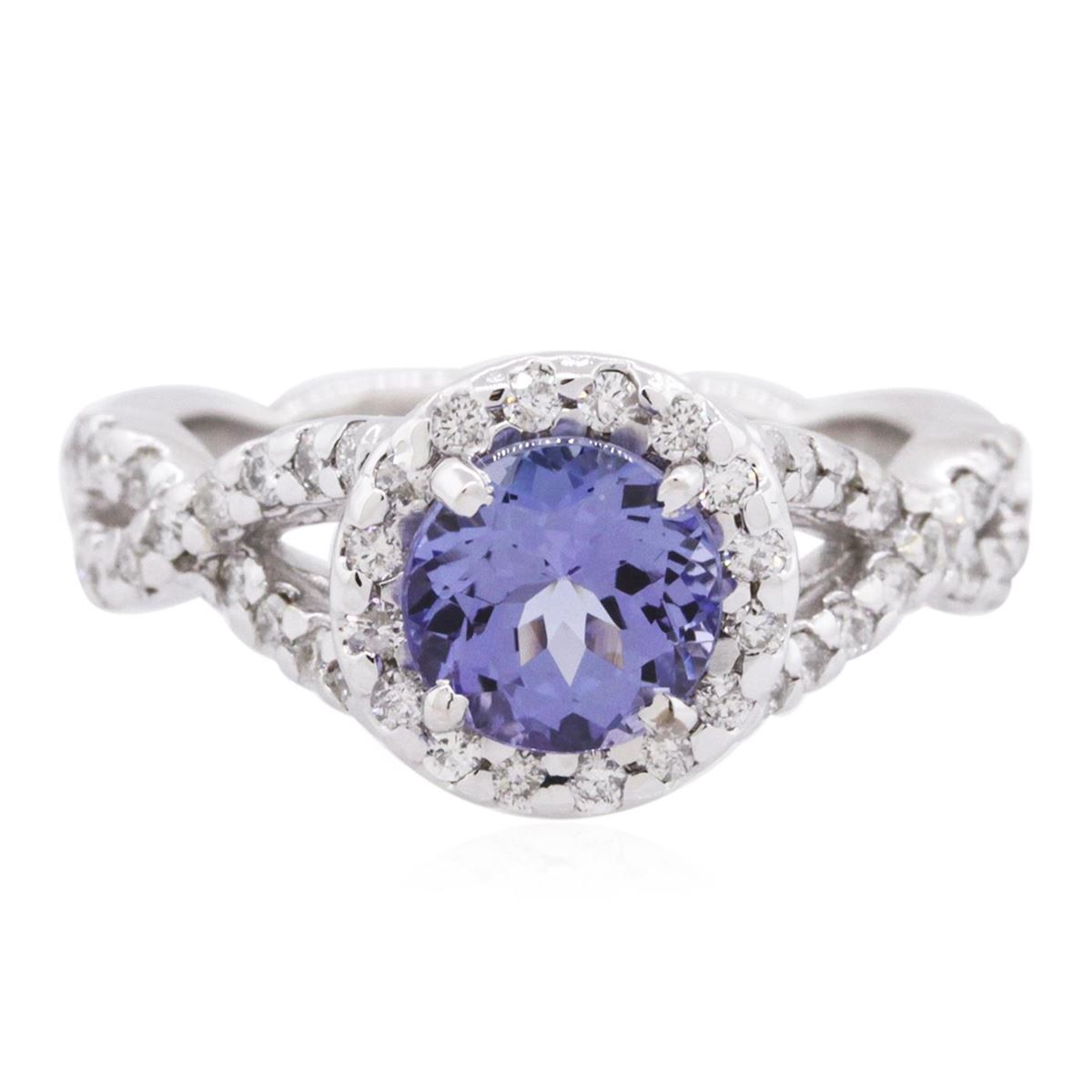 One electronically tested 14KT white gold ladies cast tanzanite & diamond ring with a bright finish. The featured tanzanite is set within a diamond bezel, supported by an elaborate lattice, and intertwined diamond set shoulders, completed by a three millimeter wide band. Identified with markings of "14K". Condition is new, good workmanship. Containing: One prong set round mixed cut natural tanzanite, measuring 6.55 - 6.55 x 4.40 mm, approximate weight of 1.26ct., clarity is eye clean, type I, dark, grayish, violet color, (GIA V 7/1), cut is good. Transmitting light with no distortion, transparent. Graded in the setting. Tanzanite is a very rare gemstone that is only found in the country of Tanzania. Originally discovered in 1967. Tiffany & Company, named the stone Tanzanite. It is found in the Usumburu Mountains that border the Umba Valley of northern Tanzania. Tanzanite occurs in gray, brown, violet, blue, reddish-purple, & green. The gem is interesting because of its exceptional pleochroism. Rotated in different directions a tanzanite will exhibit multiple changes of color. Tanzanite has a low tolerance to ultrasonic cleaning, and should not be cleaned using this method. Fifty-Two prong set round brilliant cut diamonds, measuring 1.50 - 1.40 x 0.88mm (depth est.) approximate total weight of 52 Stones = 0.58ct. Graded in the setting. Clarity: SI-2 to I-1. Color: H - J. Total Weight of Colored Stones 1.26ct. Total Weight of Diamonds 0.58ct. Total Weight of Ring 5.44 grams. AIG Appraised at $3,740.00.