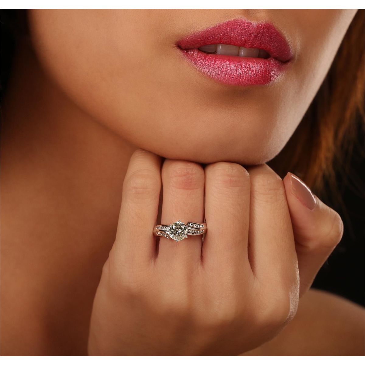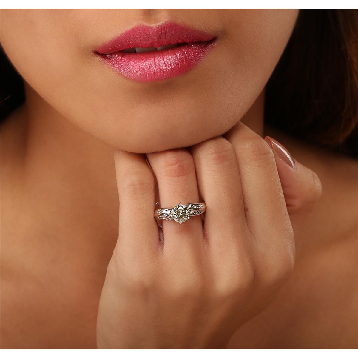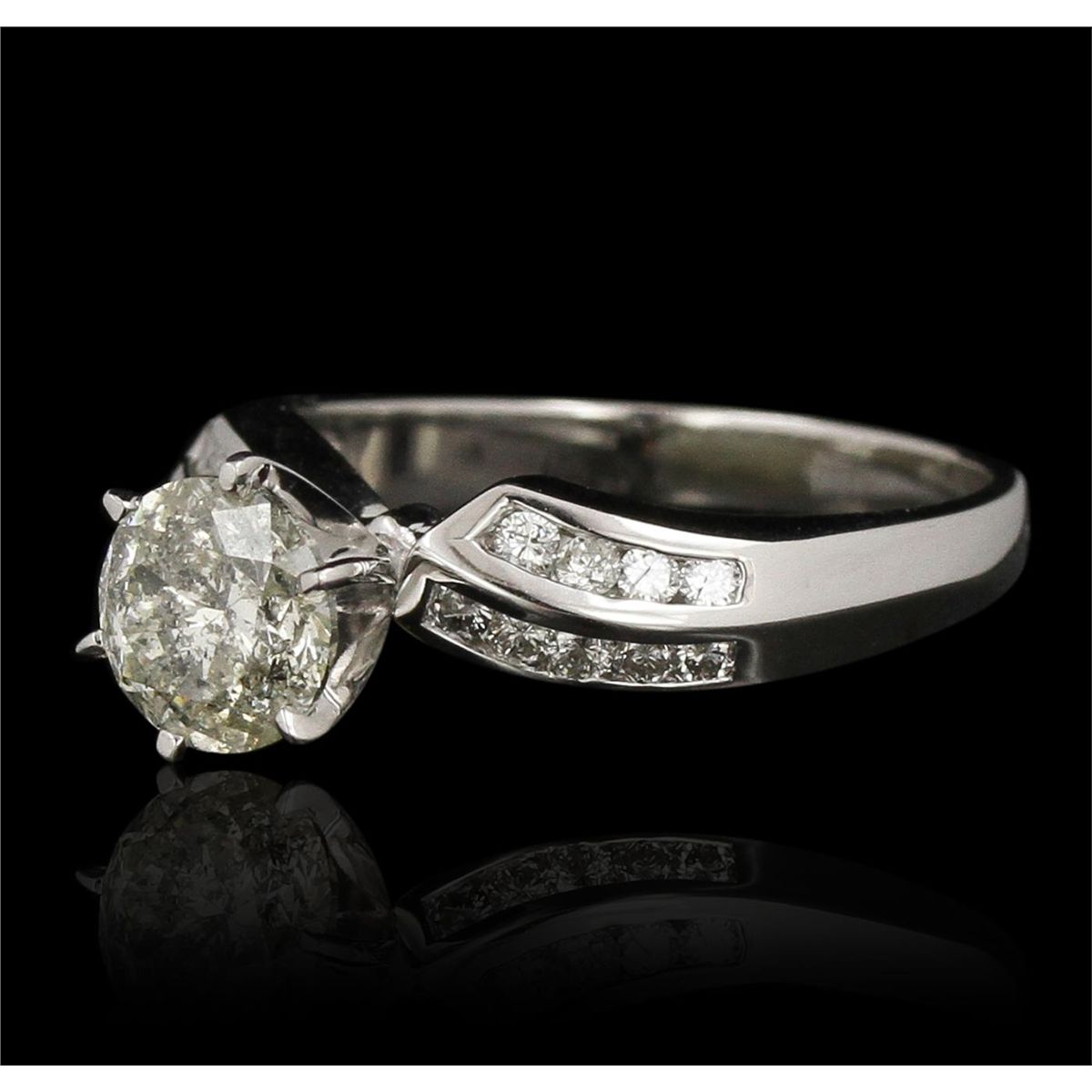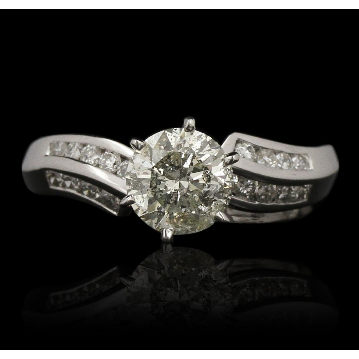 One electronically tested 14KT white gold ladies cast & assembled diamond unity ring with a bright polish finish. Condition is good. The featured diamond is cathedral set supported by a diamond set stylized bypass design, completed by a two and one-half millimeter wide band. Identified with markings of "14K". Containing: One prong set round brilliant cut diamond, measuring 6.80 - 6.70 x 4.50mm (depth est.) approximate weight of 1.26ct with a medium strong green blue fluorescence. Graded in the setting. Clarity I-1. Color J. Depth 66.7%. Table 60.7%. Eighteen channel set round brilliant cut diamonds, measuring 1.70 - 1.60 x 0.99mm (depth est.) approximate total weight of 18 Stones = 0.30ct. Graded in the setting. Clarity SI-2 to I-1. Color G - I. Total Weight of Diamonds 1.56ct. Total Weight of Ring 4.25gm. AIG Appraised at $16,065.00.