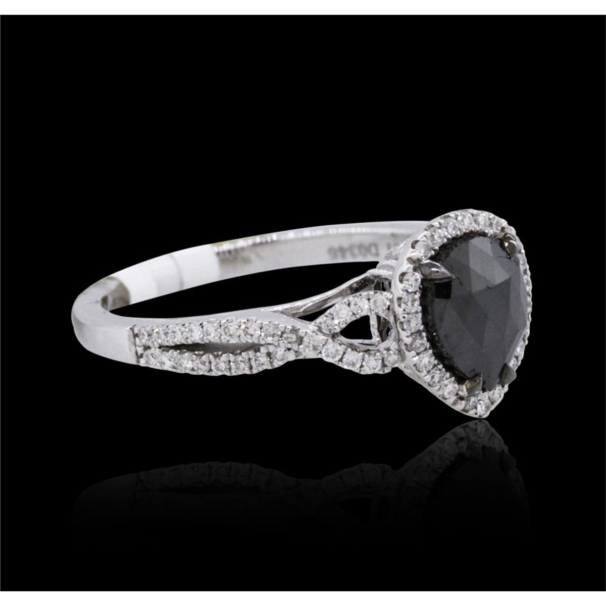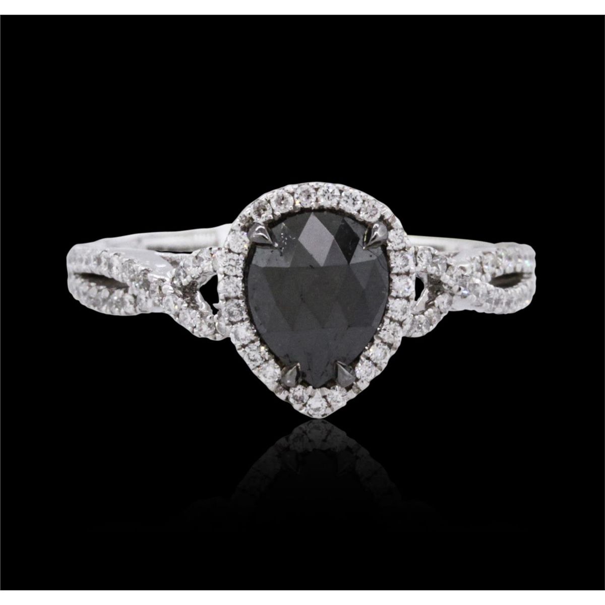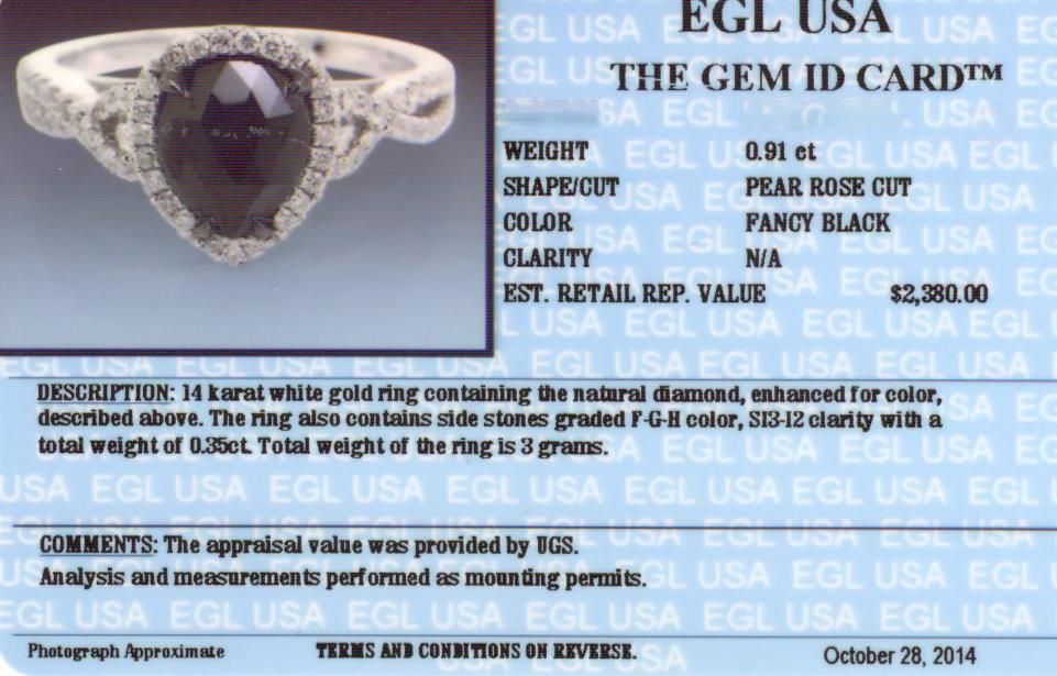 One 14KT white gold ring containing one natural pear rose cut fancy black diamond, enhanced for color, with a total weight of 0.91ct. The ring also contains side stones graded F-G-H color, SI3-I2 clarity with a total weight of 0.35ct. Total weight of the ring is 3.00 grams. EGL USA Appraised.