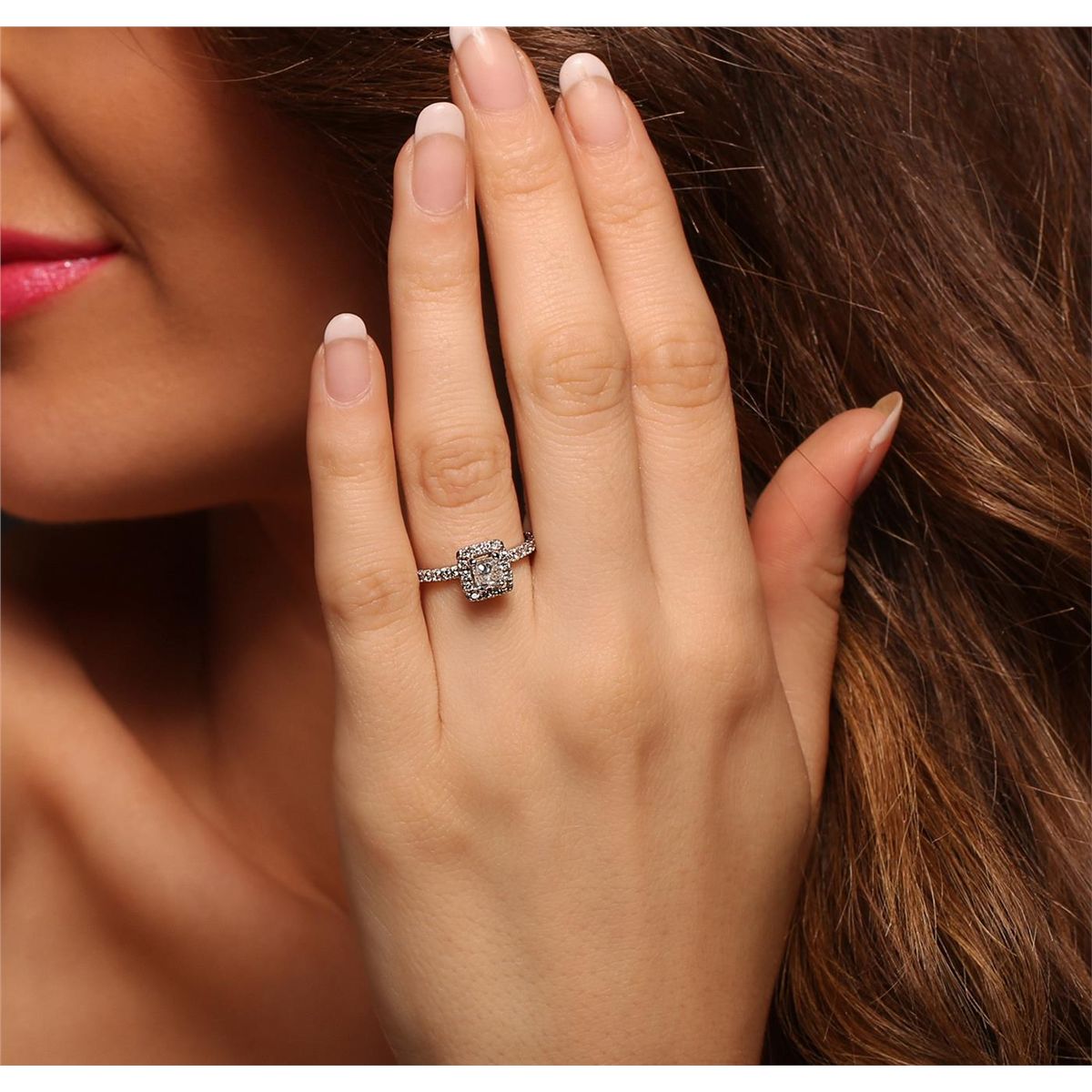 One electronically tested 14KT white gold ladies cast diamond unity ring with a bright polish finish. Condition is new, good workmanship. The featured diamond is set within a diamond bezel supported by diamond set shoulders, completed by a one and one-half millimeter wide band. Identified with markings of "14K". Containing: One prong set princess cut diamond, measuring 4.30 x 4.20 x 3.15mm (depth est.) approximate weight of 0.55ct with a faint orange fluorescence. Graded in the setting. Clarity: I-1. Color: IDepth 75.0%. Table 78.6%. Thirty-Six prong set round brilliant cut diamonds, measuring 1.80 - 1.60 x 1.02mm (depth est.) approximate. Total Weight of 36 Stones = 0.71ct. Graded in the setting. Clarity: I-1 to I-2. Color: H - J. Total Weight of Diamonds 1.26ct. Total Weight of Ring 2.66 grams. AIG Appraised at $4,895.00.