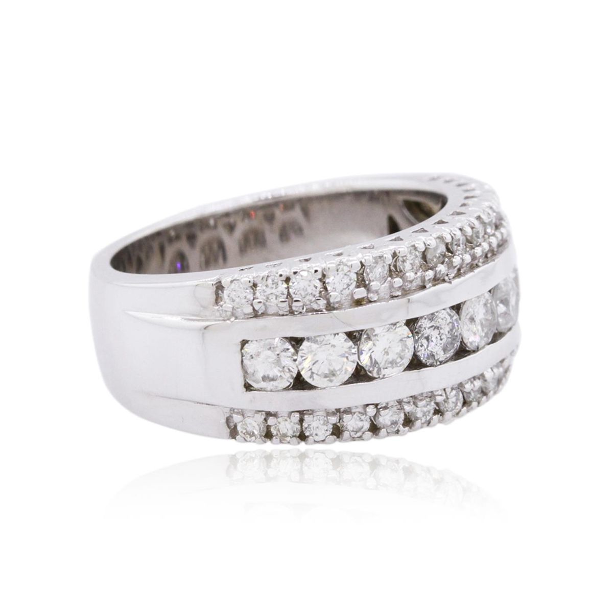 One electronically tested 14KT white gold ladies combination cast & assembled diamond ring with a bright polish finish. Identified with markings of "14K". Condition is new. Containing: Nine channel set round brilliant cut diamonds, measuring 3.00 - 3.00 x 1.80mm (depth est.) approximate total weight of 9 Stones = 0.89ct. Clarity: I-1 to I-2. Color: H - I, Cut is Good. Thirty prong set round brilliant cut diamonds, measuring 1.50 - 1.50 x 0.90mm (depth est.) approximate total weight of 30 Stones = 0.37ct. Clarity: SI-2 to I-1. Color: I - J, Cut is Good. All diamonds are graded in the mounting, unless otherwise stated. Total Weight of Diamonds 1.26ct. Total Weight of Ring 9.10 grams. GGL Appraised at $4,955.00.