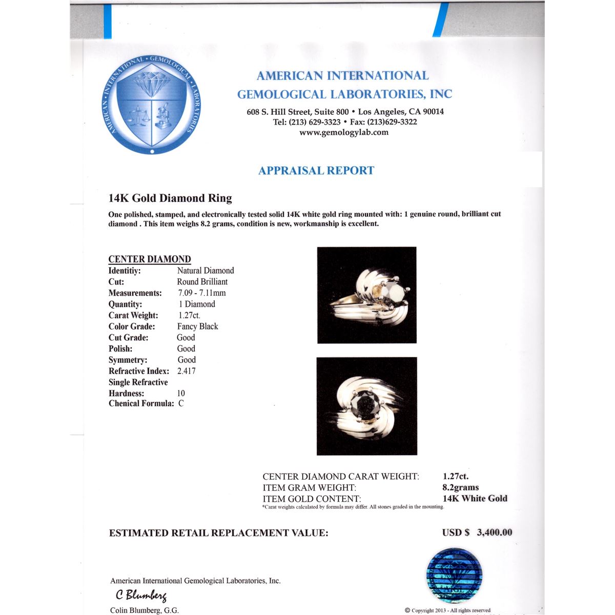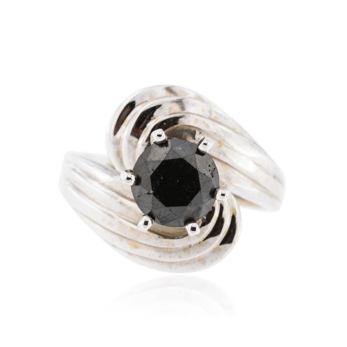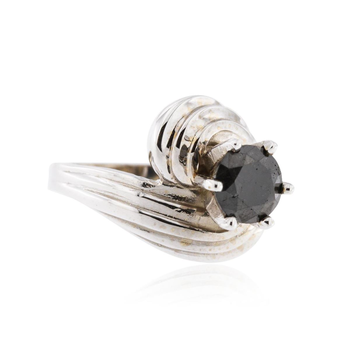 One polished, stamped, and electronically tested solid 14KT White Gold ring mounted with: 1 genuine round, brilliant cut diamond, condition is new, workmanship is excellent. Featuring 8.2 grams of 14KT White Gold, (1) black diamond with a total weight of 1.27ct. Total weight of diamonds 1.27ctw. AIGL Appraised at $3,400.00.