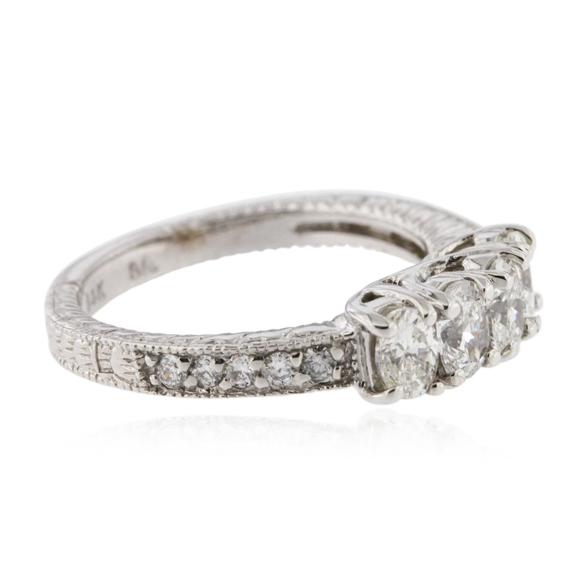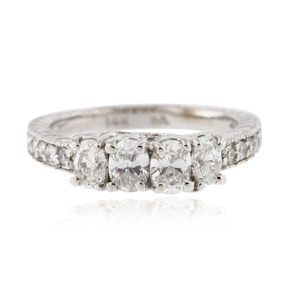 One electronically tested 14KT White Gold ladies cast diamond ring. Condition is new, good workmanship. The ring features a series of four oval shaped diamonds supported by round brilliant diamond set shoulders, completed by a patterned two and one-half millimeter wide band. Bright polish finish with milgrain detailing throughout. Identified with markings of "14K". Containing: Two prong set oval shaped cut diamonds, measuring 4.80 x 3.80 x 2.39mm (depth est.) approximate. Total Weight of 2 Stones = 0.56ct. Graded in the setting. Clarity: VS-2 to SI-2. Color: H - I. Two prong set oval shaped cut diamonds, measuring 4.50 x 3.30 x 2.08mm (depth est.) approximate. Total Weight of 2 Stones = 0.42ct. Graded in the setting. Clarity: VS-2 to SI-1. Color: H - I. Ten bead set round brilliant cut diamonds, measuring 1.80 - 1.70 x 1.05mm (depth est.) approximate. Total Weight of 10 Stones = 0.29ct. Graded in the setting. Clarity: SI-1 to SI-2. Color: H - J. Total Weight of Diamonds 1.27ct. Total Weight of Ring 4.75gm. AIG Appraised at $5,785.00.