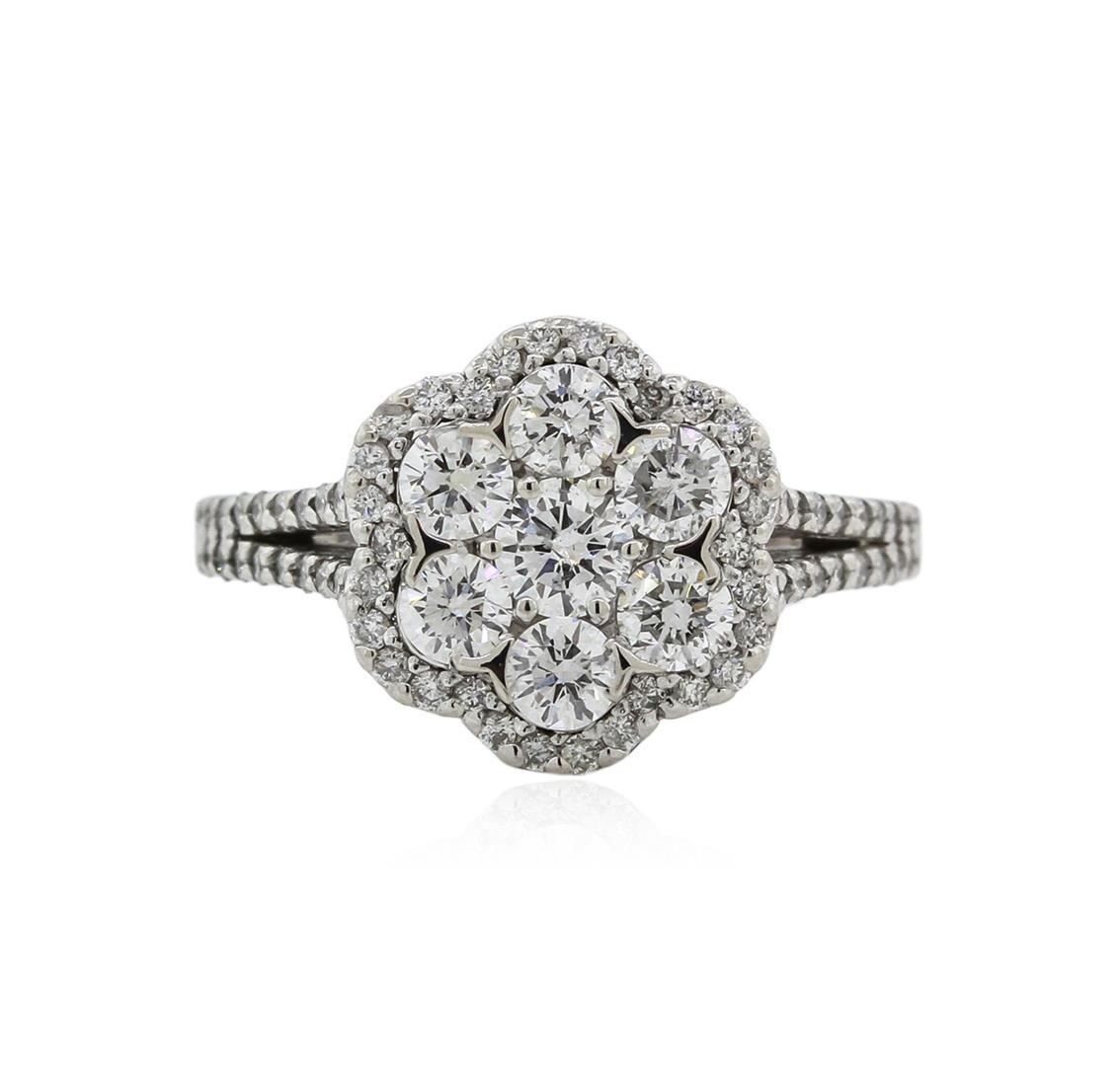 One electronically tested 14KT white gold ladies cast diamond ring with a bright polish finish. Identified with markings of "14K". Condition is new. Containing: One prong set round brilliant cut diamond, measuring 4.00 - 4.00 x 2.40mm (depth est.) approximate weight of 0.23ct. Clarity: SI-2. Color: I, Cut is Good. Seventy-One prong set round brilliant cut diamonds, measuring 2.80 - 1.10 x 1.17mm (depth est.) approximate total weight of 71 Stones = 1.04ct. Clarity: SI-1 to I-1. Color: I - J, Cut is Good. All diamonds are graded in the mounting, unless otherwise stated. Total Weight of Diamonds 1.27ct. Total Weight of Ring 4.50 grams. GGL Appraised at $3,450.00.