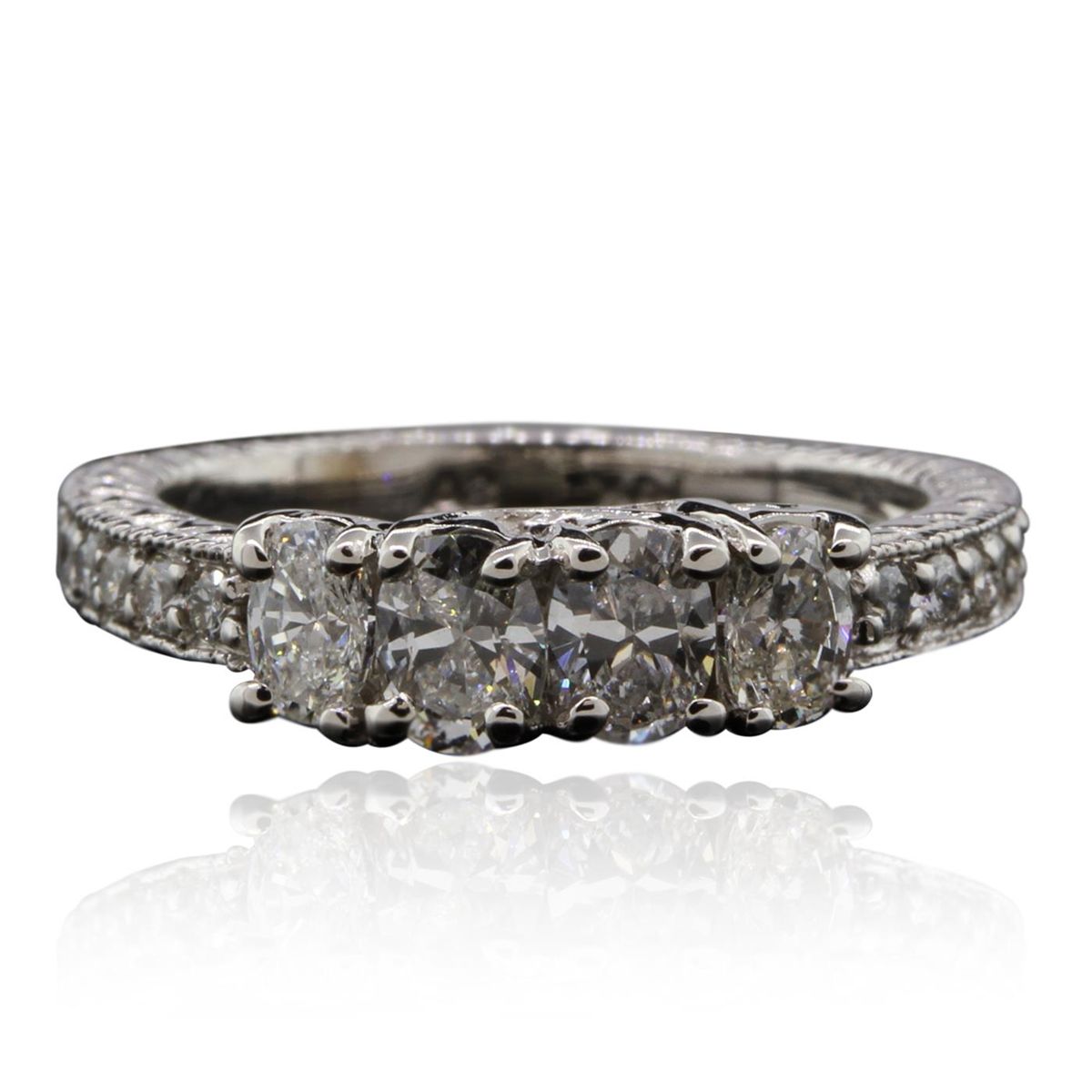 One electronically tested 14KT White Gold ladies cast diamond ring. Condition is new, good workmanship. The ring features a series of four oval shaped diamonds supported by round brilliant diamond set shoulders, completed by a patterned two and one-half millimeter wide band. Bright polish finish with milgrain detailing throughout. Identified with markings of "14K". Containing: Two prong set oval shaped cut diamonds, measuring 4.80 x 3.80 x 2.39mm (depth est.) approximate. Total Weight of 2 Stones = 0.56ct. Graded in the setting. Clarity: VS-2 to SI-2. Color: H - I. Two prong set oval shaped cut diamonds, measuring 4.50 x 3.30 x 2.08mm (depth est.) approximate. Total Weight of 2 Stones = 0.42ct. Graded in the setting. Clarity: VS-2 to SI-1. Color: H - I. Ten bead set round brilliant cut diamonds, measuring 1.80 - 1.70 x 1.05mm (depth est.) approximate. Total Weight of 10 Stones = 0.29ct. Graded in the setting. Clarity: SI-1 to SI-2. Color: H - J. Total Weight of Diamonds 1.27ct. Total Weight of Ring 4.75gm. AIG Appraised at $5,785.00.