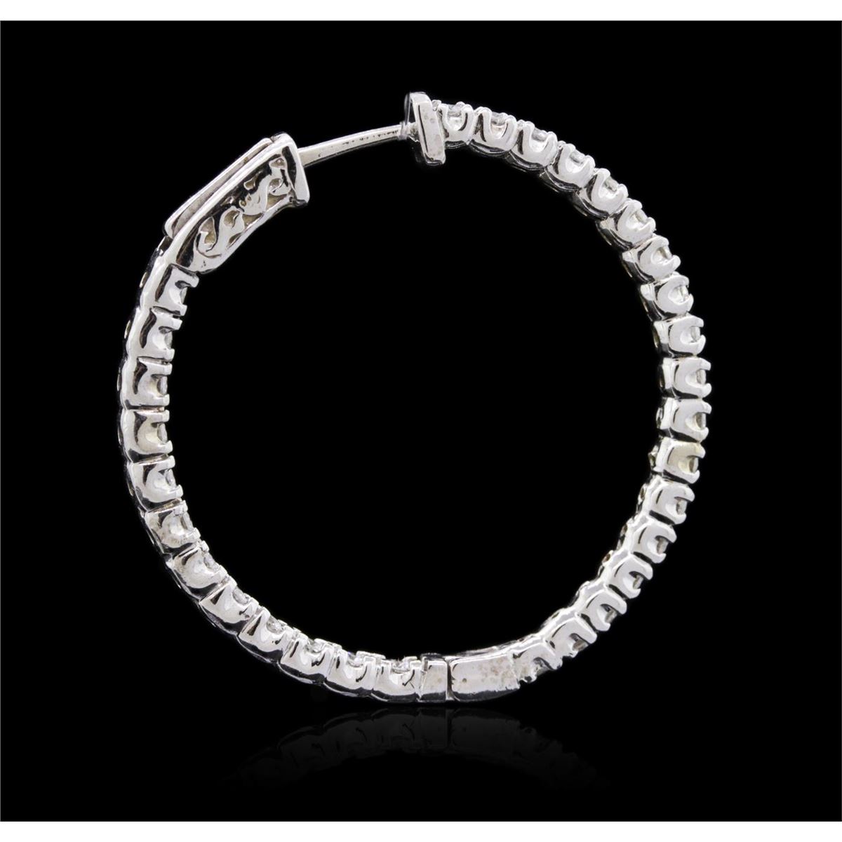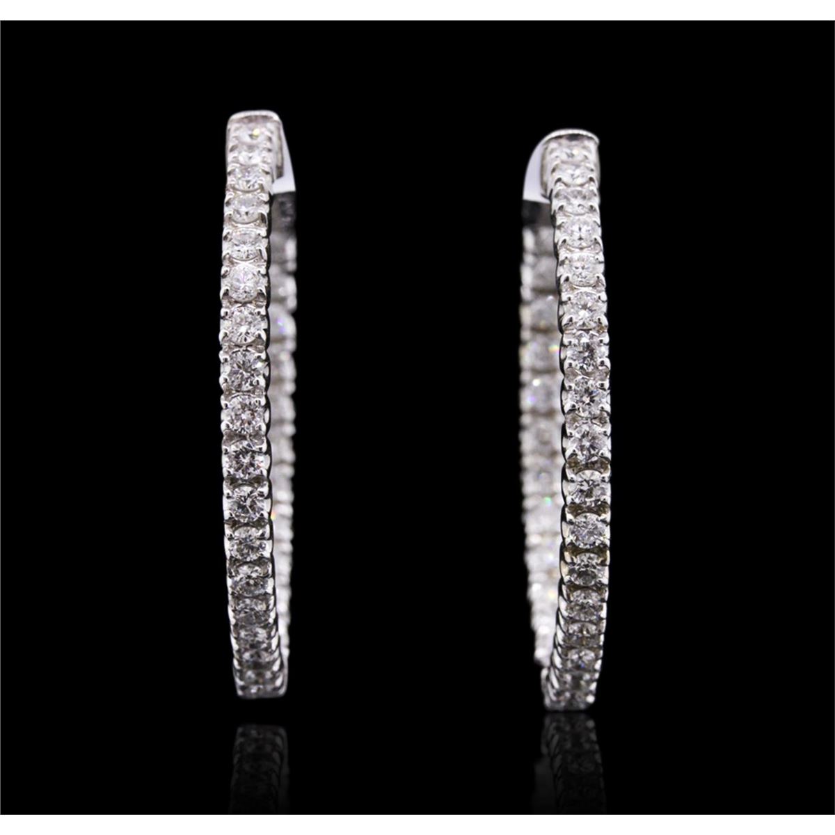One pair electronically tested 14KT white gold ladies combination cast & assembled hoop earrings with hinged clip backs with a bright polish finish. Identified with markings of "14K". Condition is new. Containing: Sixty prong set round brilliant cut diamonds, measuring 1.80 - 1.80 x 1.08mm (depth est.) approximate total weight of 60 Stones = 1.28ct. Clarity: SI-2 to I-2. Color: I - J, Cut is Good. All diamonds are graded in the mounting, unless otherwise stated. Total Weight of Diamonds 1.28ct. Total Weight of Earrings 10.20 grams. GGL Appraised at $4,385.00.