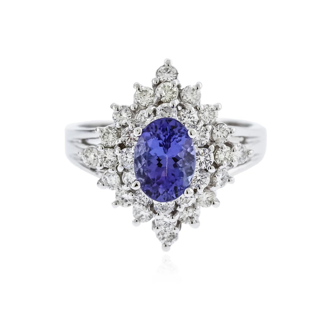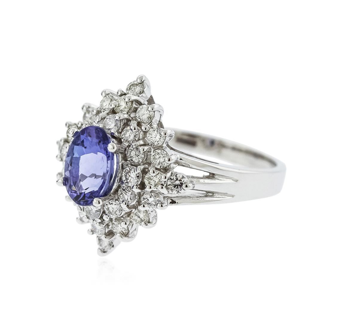 One electronically tested 14KT white gold ladies cast tanzanite and diamond ring with a bright polish finish. Identified with markings of "14K". Condition is new. Containing: One prong set oval modified brilliant cut natural tanzanite, measuring 7.80 x 6.00 x 3.90mm, approximate weight of 1.28ct., clarity is eye clean, type I, medium light, very slightly grayish, violet color, (GIA V 4/3), cut is good. Thirty-Two prong set round brilliant cut diamonds, measuring 1.90 - 1.90 x 1.14mm (depth est.) approximate total weight of 32 Stones = 0.80ct. Clarity: SI-1 to SI-2. Color: H - I, Cut is Good. Colored gemstones are presumed to have been subjected to commonly used enhancement processes. All diamonds and colored gemstones are graded in the mounting, unless otherwise stated. Total Weight of Colored Stones 1.28ct. Total Weight of Diamonds 0.80ct. Total Weight of Ring 5.40 grams. GGL Appraised at $3,825.00.