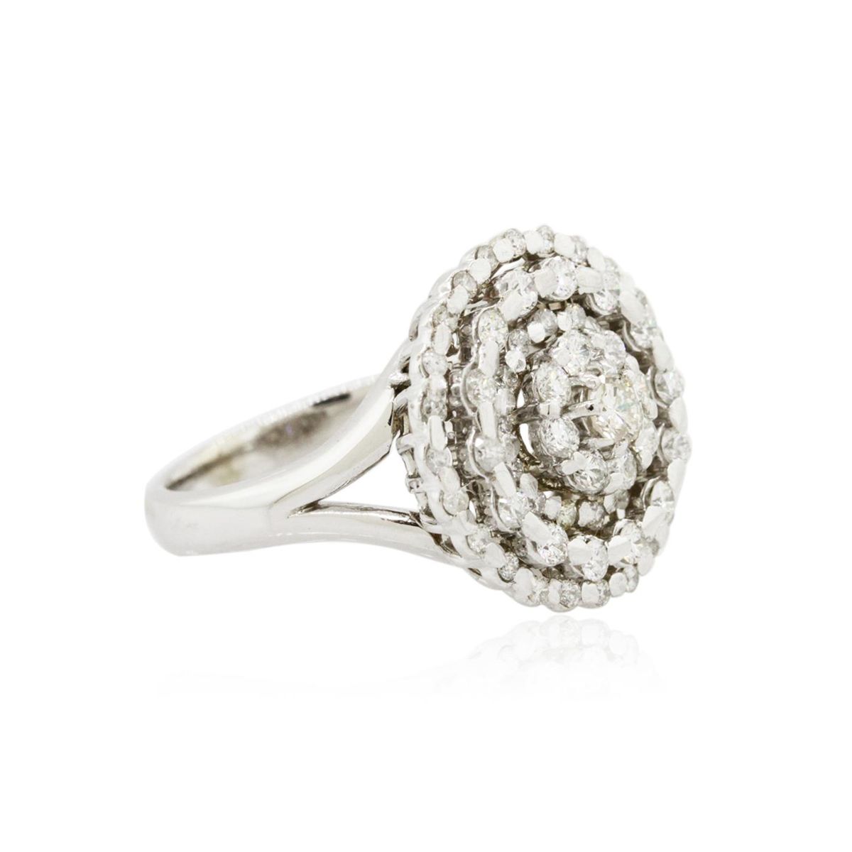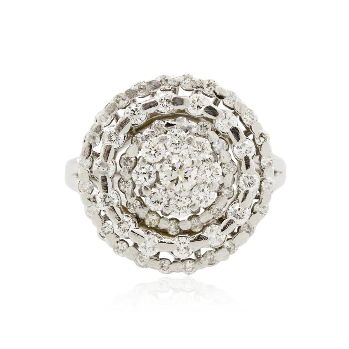 One electronically tested 14KT white gold ladies cast diamond ring with a bright polish finish. The ring features a multi-tier diamond cluster, completed by a two and one-half millimeter wide band. Identified with markings of "K14". Condition is new, good workmanship. Containing: One prong set round brilliant cut diamond, measuring 3.40 - 3.35 x 2.03mm (depth est.) approximate weight of 0.15ct. Graded in the setting. Clarity: SI-2. Color: J Twenty-Two prong set round brilliant cut diamonds, measuring 2.00 - 1.90 x 1.17mm (depth est.) approximate total weight of 22 Stones = 0.69ct. Graded in the setting. Clarity: SI-1 to SI-2. Color: G - I Thirty-Eight prong set round brilliant cut diamonds, measuring 1.40 - 1.30 x 0.81mm (depth est.) approximate total weight of 38 Stones = 0.44ct. Graded in the setting. Clarity: SI-1 to I-1. Color: H - J. Total Weight of Diamonds 1.28ct. Total Weight of Ring 7.46 grams. AIG Appraised at $5,425.00.