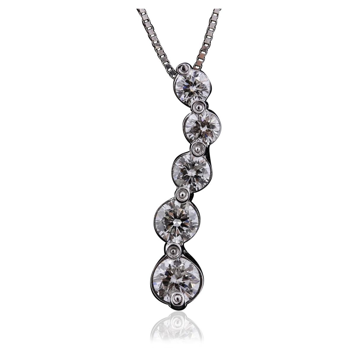 One electronically tested 14KT white gold ladies combination cast & assembled pendant & chain 16.0" long, light box link with a spring ring clasp with a bright polish finish. Condition is new. Identified with markings of "14K". Containing: One prong set round brilliant cut diamond, measuring 5.00 - 5.00 x 3.00mm (depth est.) approximate weight of 0.46ct. Clarity: I-1. Color: J, Cut is Good. One prong set round brilliant cut diamond, measuring 4.30 - 4.30 x 2.58mm (depth est.) approximate weight of 0.29ct. Clarity: SI-1. Color: J, Cut is Good. Three prong set round brilliant cut diamonds, measuring 3.80 - 3.50 x 2.19mm (depth est.) approximate. Total Weight of 3 Stones = 0.53ct. Clarity: SI-1 to SI-2. Color: J, Cut is Good. All diamonds are graded in the mounting, unless otherwise stated. Total Weight of Diamonds 1.28ct. Total Weight of Pendant & Chain 3.80 grams. GGL Appraised at $5,660.00.