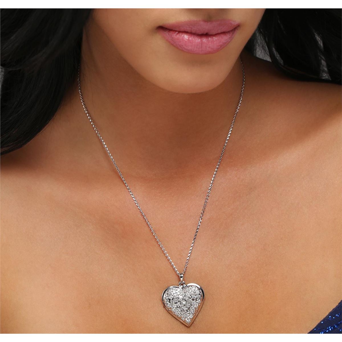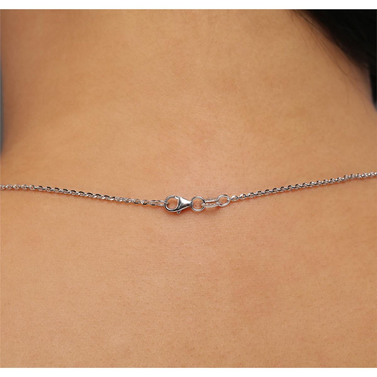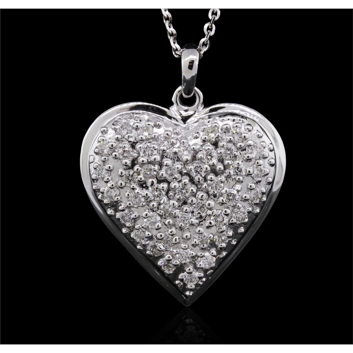 One electronically tested 14KT white gold ladies cast diamond pendant & chain 18.3" long, cable link with a lobster claw clasp with a bright polish finish. Identified with markings of "14K". Condition is new. Containing: Forty-Four prong set round brilliant cut diamonds, measuring 2.00 - 2.00 x 1.20mm (depth est.) approximate total weight of 44 Stones = 1.29ct. Clarity: SI-2 to I-1. Color: J - K, Cut is Good. All diamonds are graded in the mounting, unless otherwise stated. Total Weight of Diamonds 1.29ct. Total Weight of Pendant & Chain 13.60 grams. GGL Appraised at $5,230.00.