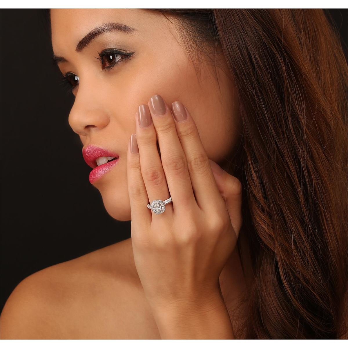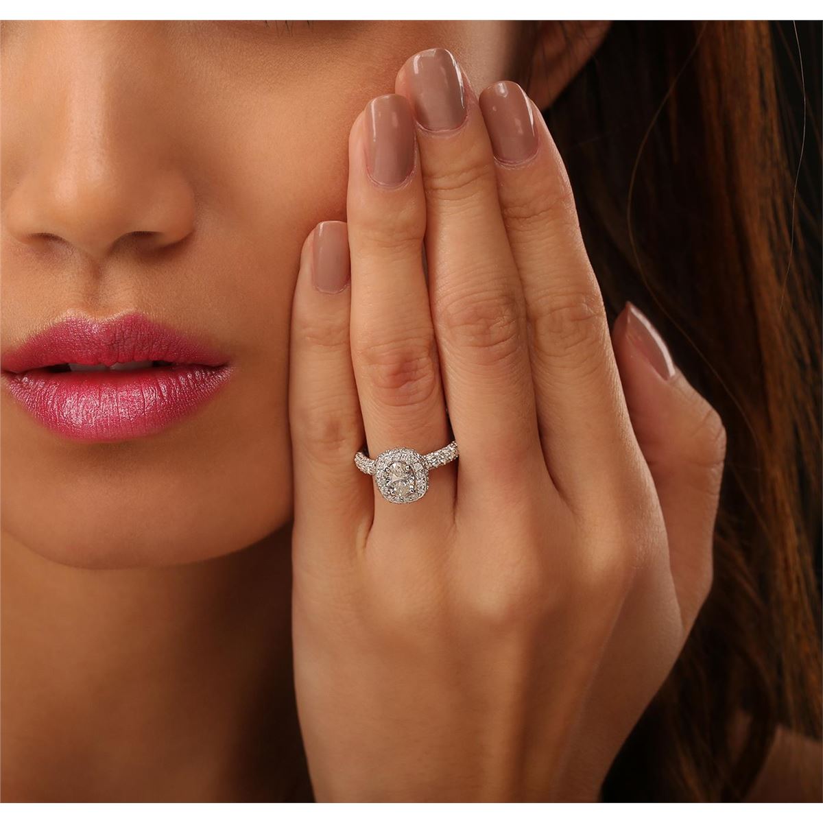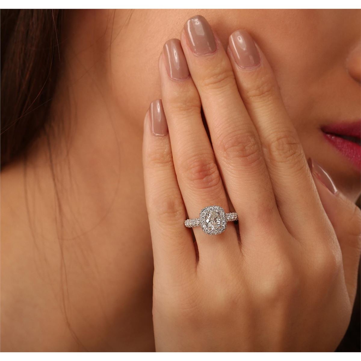 One electronically tested 14KT white gold ladies combination cast & assembled engagement ring with a bright polish finish. Condition is new. Identified with markings of "K14". Containing: One prong set oval shaped cut diamond, measuring 6.50 x 5.00 x 3.15mm (depth est.) approximate weight of 0.65ct. Clarity: I-2. Color: J, Cut is Good. Eighty prong set round brilliant cut diamonds, measuring 1.30 - 1.30 x 0.78mm (depth est.) approximate total weight of 80 Stones = 0.64ct. Clarity: I-1 to I-2. Color: I - J, Cut is Good. All diamonds are graded in the mounting, unless otherwise stated. Total Weight of Diamonds 1.29ct. Total Weight of Engagement Ring 3.80 grams. GGL Appraised at $5,030.00.