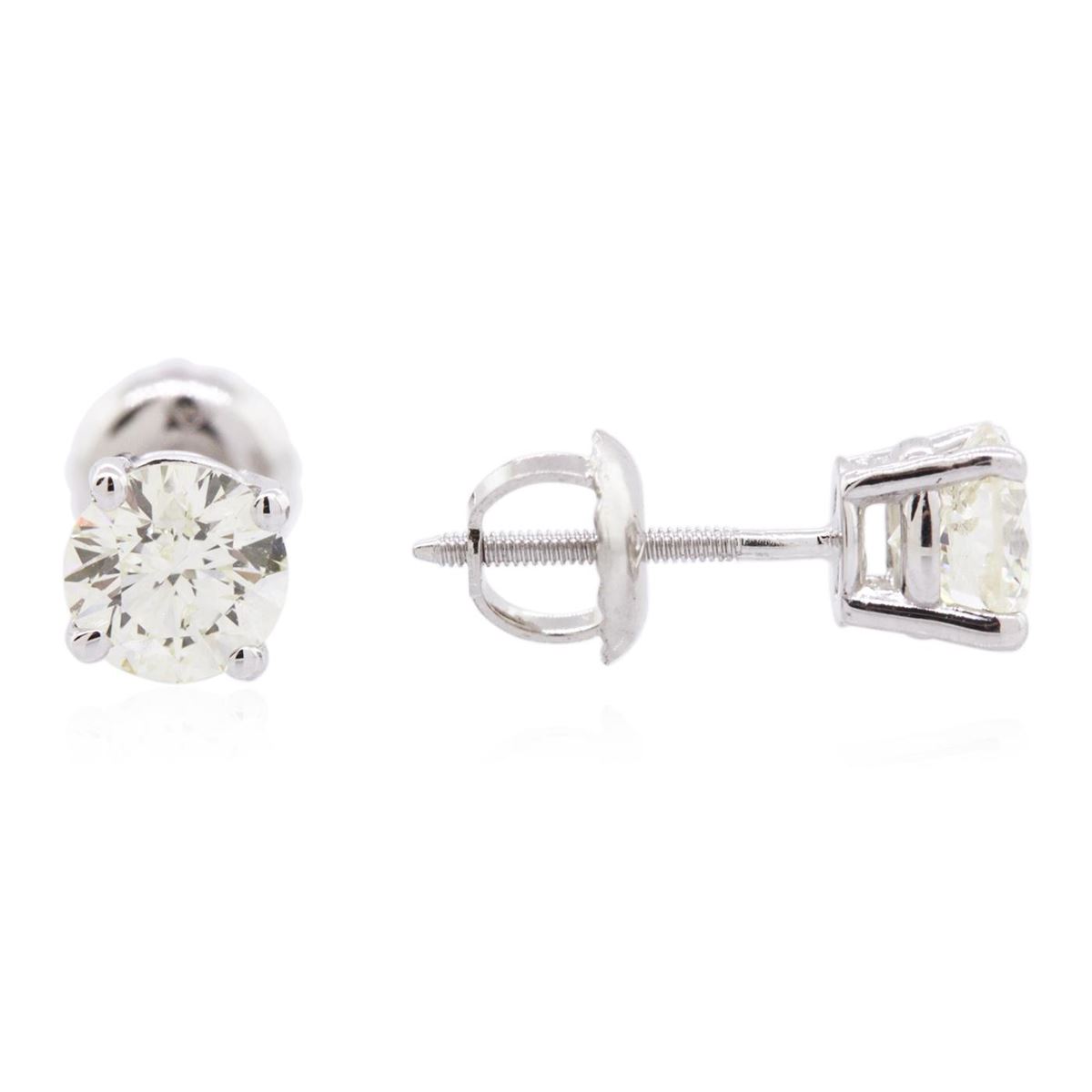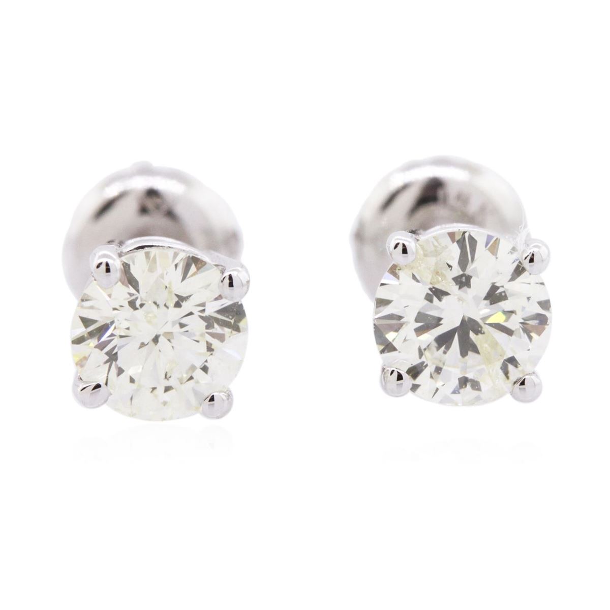 One pair electronically tested 14KT white gold cast & assembled diamond solitaire earrings with screw backs. Bright polish finish. Condition is new, good workmanship. Containing: One prong set round brilliant cut diamond, measuring 5.11 - 5.10 x 3.30mm (depth est.), 4.00% GTCF approximate weight of 0.64ct with a medium blue fluorescence. Graded in the setting. Clarity: I-1. Depth: 64.6%. Table 58.7%. One prong set round brilliant cut diamond, measuring 5.09 - 5.08 x 3.40mm (depth est.), 3.00% GTCF approximate weight of 0.65ct with a medium blue fluorescence. Graded in the setting. Clarity: SI-2. Depth: 66.8%. Table 57.0%. Total Weight of Diamonds 1.29ct. Total Weight of Earrings 0.96 grams. AIG Appraised at $4,290.00.