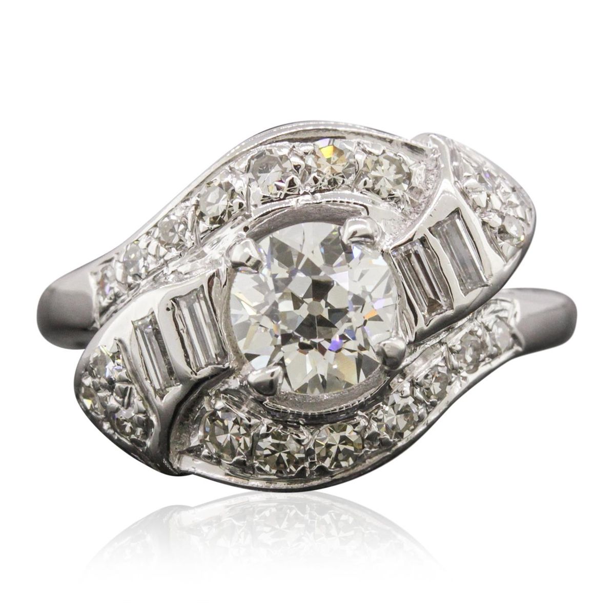One electronically tested 14KT white gold ladies combination cast & assembled engagement ring with a bright polish finish. Condition is very good. Identified with markings of "14K". Containing: One prong set Old European cut diamond, measuring 6.20 - 6.00 x 3.90mm (depth est.) approximate weight of 0.89ct. Clarity: SI-1. Color: J, Cut is Good. Twenty prong set single cut diamonds, measuring 2.00 - 1.30 x 0.99mm (depth est.) approximate. Total Weight of 20 Stones = 0.33ct. Clarity: VS-2. Color: G - H, Cut is Good. Four gypsy set baguette cut diamonds, measuring 2.50 x 1.00 x 0.85mm (depth est.) approximate. Total Weight of 4 Stones = 0.08ct. Clarity: SI-1. Color: H - I, Cut is Good. All diamonds are graded in the mounting, unless otherwise stated. Total Weight of Diamonds 1.29ct. Total Weight of Ring 5.30 grams. GGL Appraised at $11,315.00.