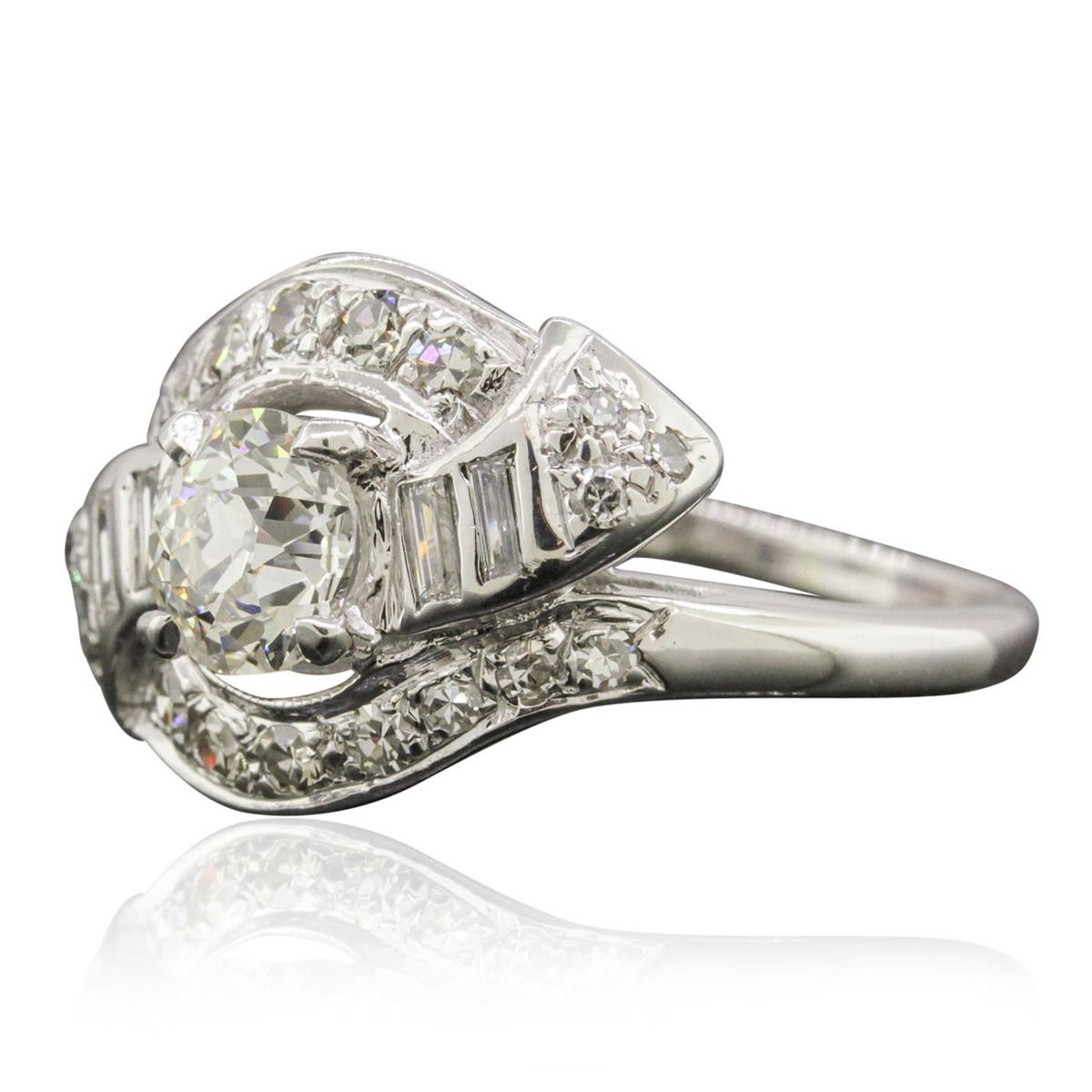 One electronically tested 14KT white gold ladies combination cast & assembled engagement ring with a bright polish finish. Condition is very good. Identified with markings of "14K". Containing: One prong set Old European cut diamond, measuring 6.20 - 6.00 x 3.90mm (depth est.) approximate weight of 0.89ct. Clarity: SI-1. Color: J, Cut is Good. Twenty prong set single cut diamonds, measuring 2.00 - 1.30 x 0.99mm (depth est.) approximate. Total Weight of 20 Stones = 0.33ct. Clarity: VS-2. Color: G - H, Cut is Good. Four gypsy set baguette cut diamonds, measuring 2.50 x 1.00 x 0.85mm (depth est.) approximate. Total Weight of 4 Stones = 0.08ct. Clarity: SI-1. Color: H - I, Cut is Good. All diamonds are graded in the mounting, unless otherwise stated. Total Weight of Diamonds 1.29ct. Total Weight of Ring 5.30 grams. GGL Appraised at $11,315.00.