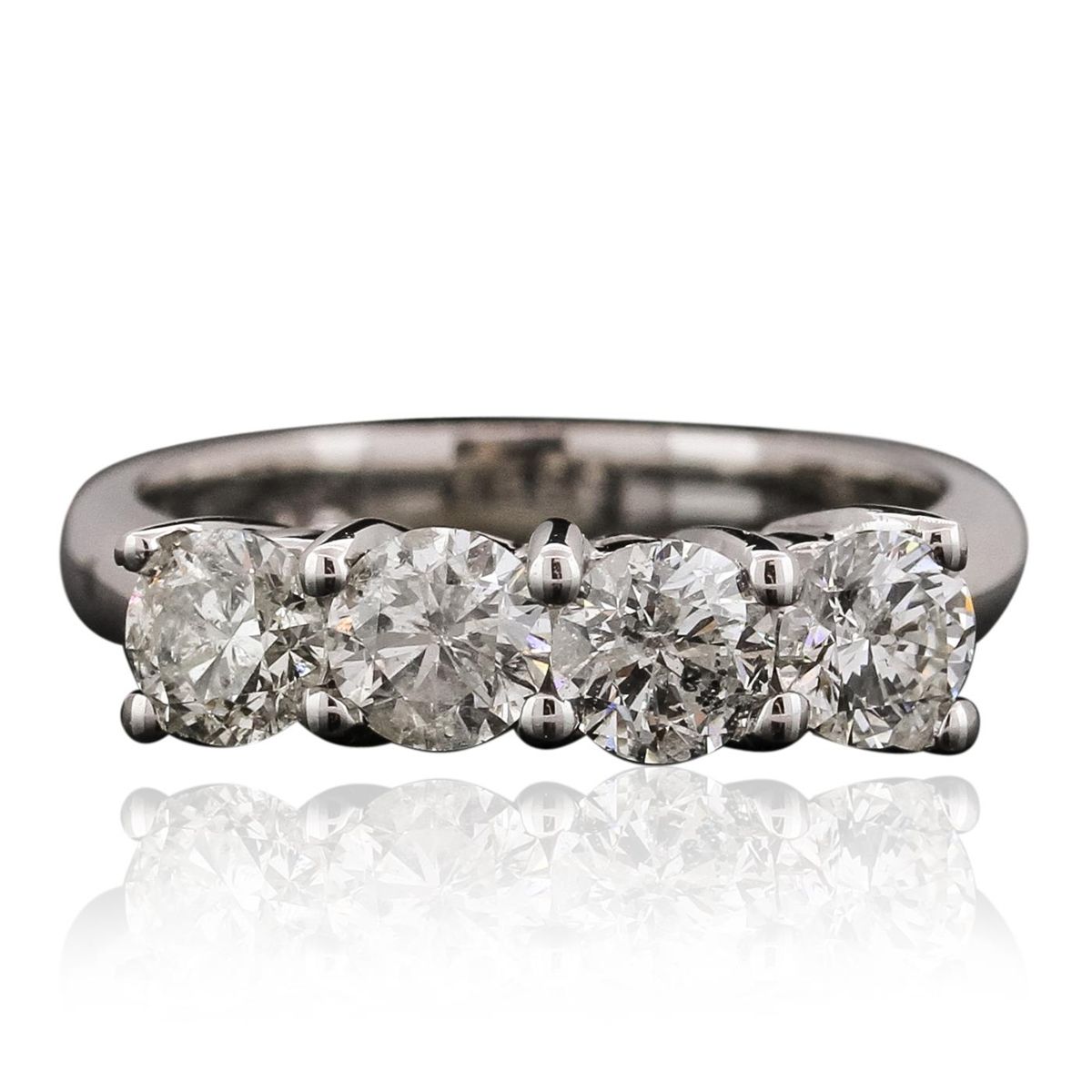 One electronically tested 14KT white gold ladies cast anniversary ring with a bright polish finish. Identified with markings of "14K". Condition is new. Containing: Four prong set round brilliant cut diamonds, measuring 4.50 - 4.40 x 2.67mm (depth est.) approximate total weight of 4 Stones = 1.29ct. Clarity: I-1 to I-2. Color: J, Cut is Good. All diamonds are graded in the mounting, unless otherwise stated. Total Weight of Diamonds 1.29ct. Total Weight of Ring 5.10 grams. GGL Appraised at $5,990.00.