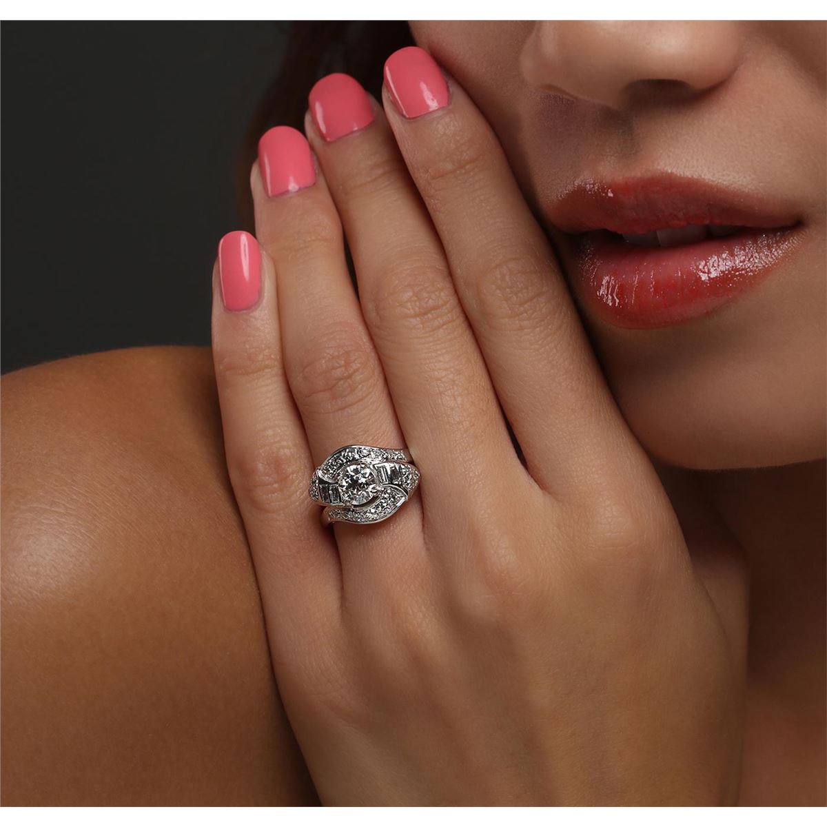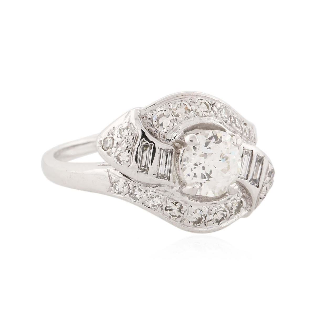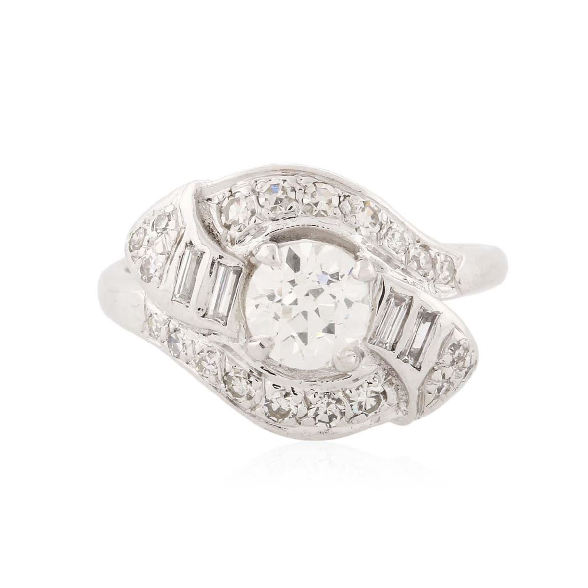 One electronically tested 14KT white gold ladies combination cast & assembled engagement ring with a bright polish finish. Condition is very good. Identified with markings of "14K". Containing: One prong set Old European cut diamond, measuring 6.20 - 6.00 x 3.90mm (depth est.) approximate weight of 0.89ct. Clarity: SI-1. Color: J, Cut is Good. Twenty prong set single cut diamonds, measuring 2.00 - 1.30 x 0.99mm (depth est.) approximate. Total Weight of 20 Stones = 0.33ct. Clarity: VS-2. Color: G - H, Cut is Good. Four gypsy set baguette cut diamonds, measuring 2.50 x 1.00 x 0.85mm (depth est.) approximate. Total Weight of 4 Stones = 0.08ct. Clarity: SI-1. Color: H - I, Cut is Good. All diamonds are graded in the mounting, unless otherwise stated. Total Weight of Diamonds 1.29ct. Total Weight of Ring 5.30 grams. GGL Appraised at $11,315.00.