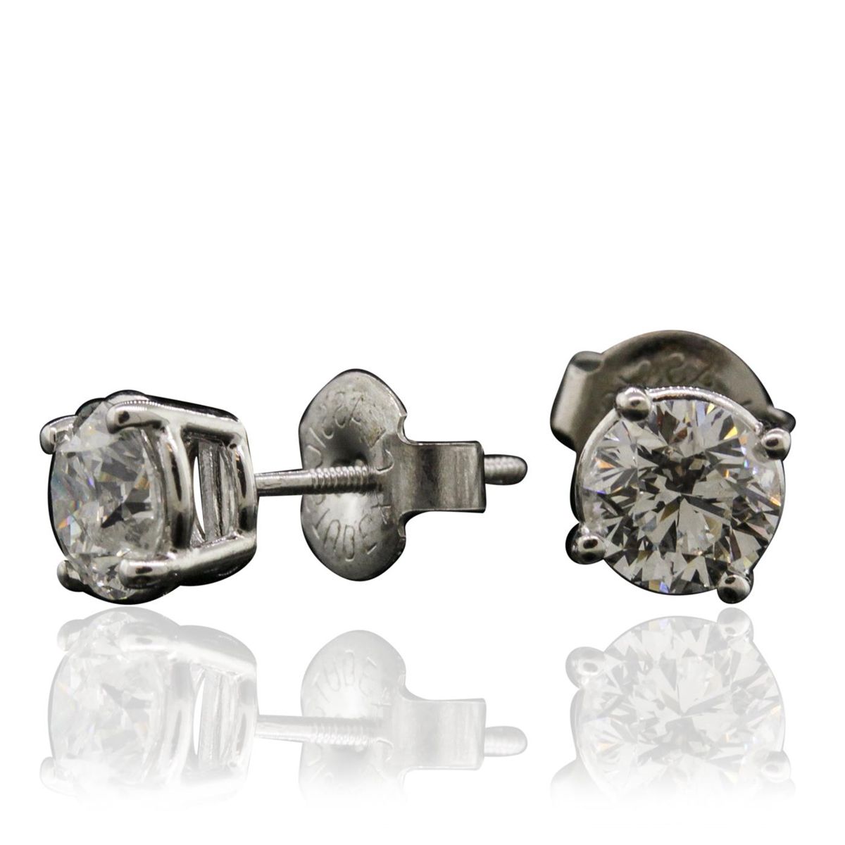One pair electronically tested 14KT white gold Ladies combination cast & assembled stud earrings with screw backs with a bright polish finish. Condition is very good. Containing: One prong set round brilliant cut diamond, measuring 5.60 - 5.60 x 3.36mm (depth est.) approximate weight of 0.64ct. Clarity: SI-1. Color: I, Cut is Good. One prong set round brilliant cut diamond, measuring 5.60 - 5.60 x 3.36mm (depth est.) approximate weight of 0.64ct. Clarity: SI-2. Color: J, Cut is Good. All diamonds are graded in the mounting, unless otherwise stated. Total Weight of Diamonds 1.29ct. Total Weight of Earrings 1.30 grams. GGL Appraised at $9,370.00.