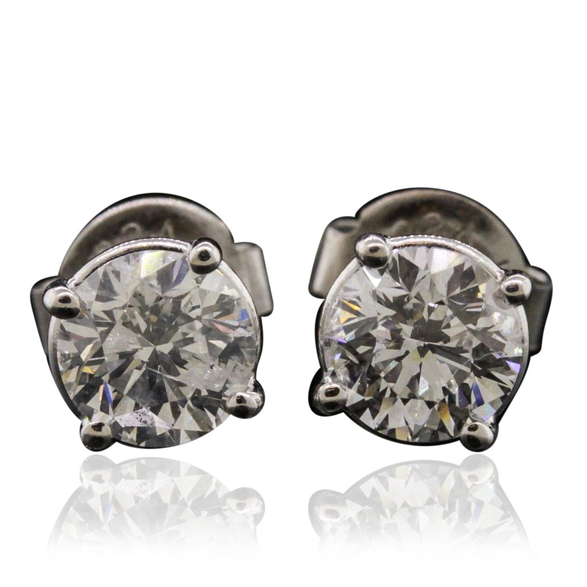 One pair electronically tested 14KT white gold Ladies combination cast & assembled stud earrings with screw backs with a bright polish finish. Condition is very good. Containing: One prong set round brilliant cut diamond, measuring 5.60 - 5.60 x 3.36mm (depth est.) approximate weight of 0.64ct. Clarity: SI-1. Color: I, Cut is Good. One prong set round brilliant cut diamond, measuring 5.60 - 5.60 x 3.36mm (depth est.) approximate weight of 0.64ct. Clarity: SI-2. Color: J, Cut is Good. All diamonds are graded in the mounting, unless otherwise stated. Total Weight of Diamonds 1.29ct. Total Weight of Earrings 1.30 grams. GGL Appraised at $9,370.00.