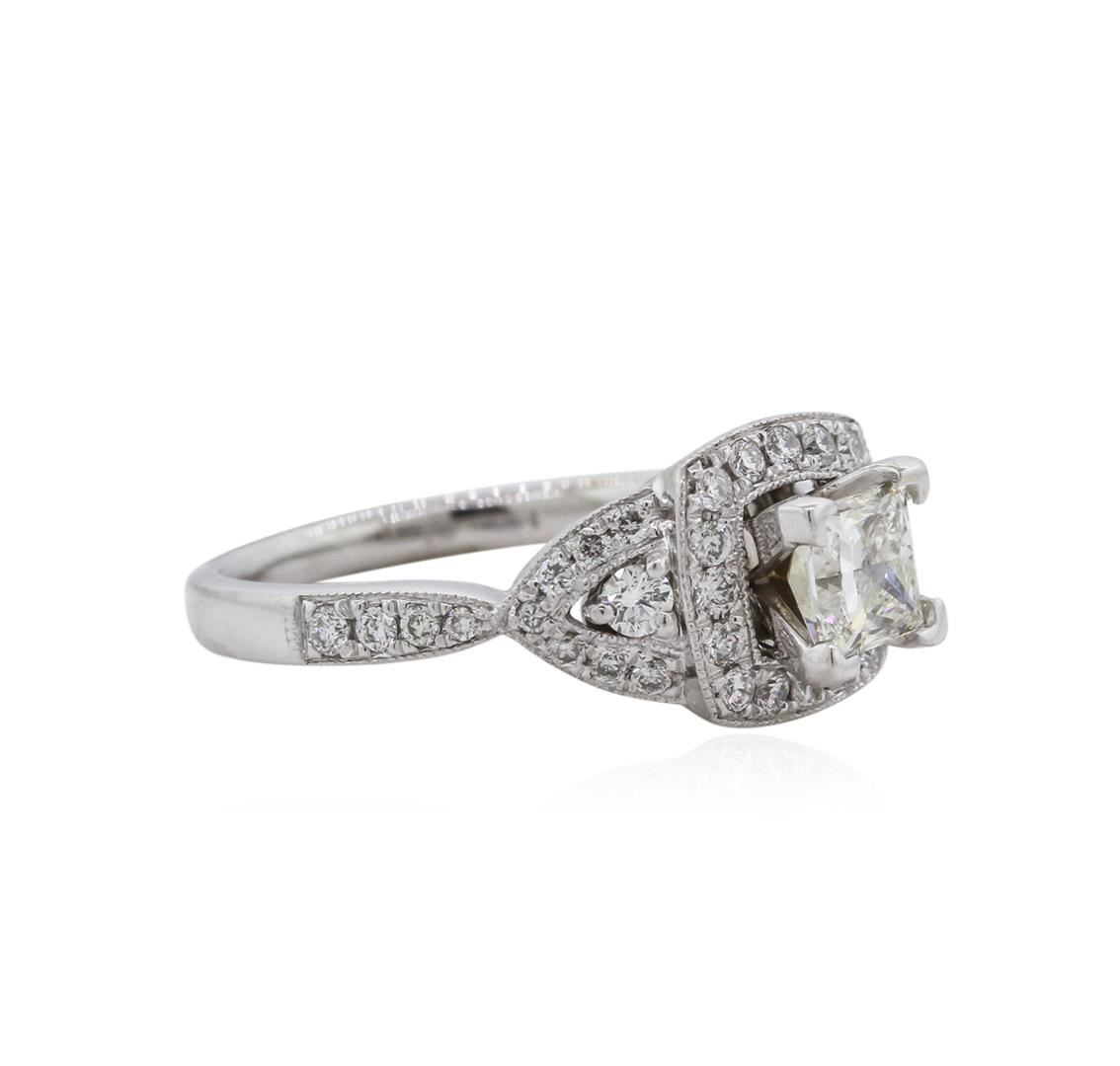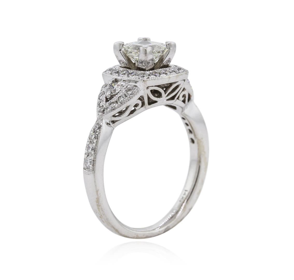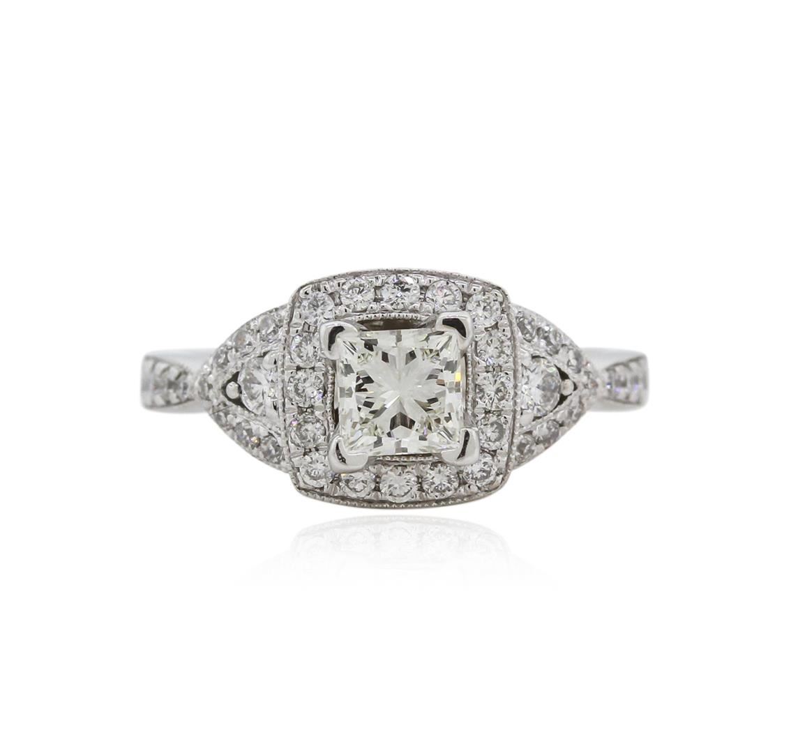 One electronically tested 14KT white gold ladies cast diamond engagement ring with a bright polish finish. Identified with markings of "14K". Condition is new. Containing: One prong set princess cut diamond, measuring 4.70 x 4.60 x 3.45mm (depth est.) approximate weight of 0.61ct. Clarity: VS-2. Color: L, Cut is Good. Forty-Two prong set round brilliant cut diamonds, measuring 2.00 - 1.30 x 0.99mm (depth est.) approximate total weight of 42 Stones = 0.69ct. Clarity: SI-1 to I-1. Color: I - J, Cut is Good. All diamonds are graded in the mounting, unless otherwise stated. Total Weight of Diamonds 1.30ct. Total Weight of Engagement Ring 4.30 grams. GGL Appraised at $4,510.00.
