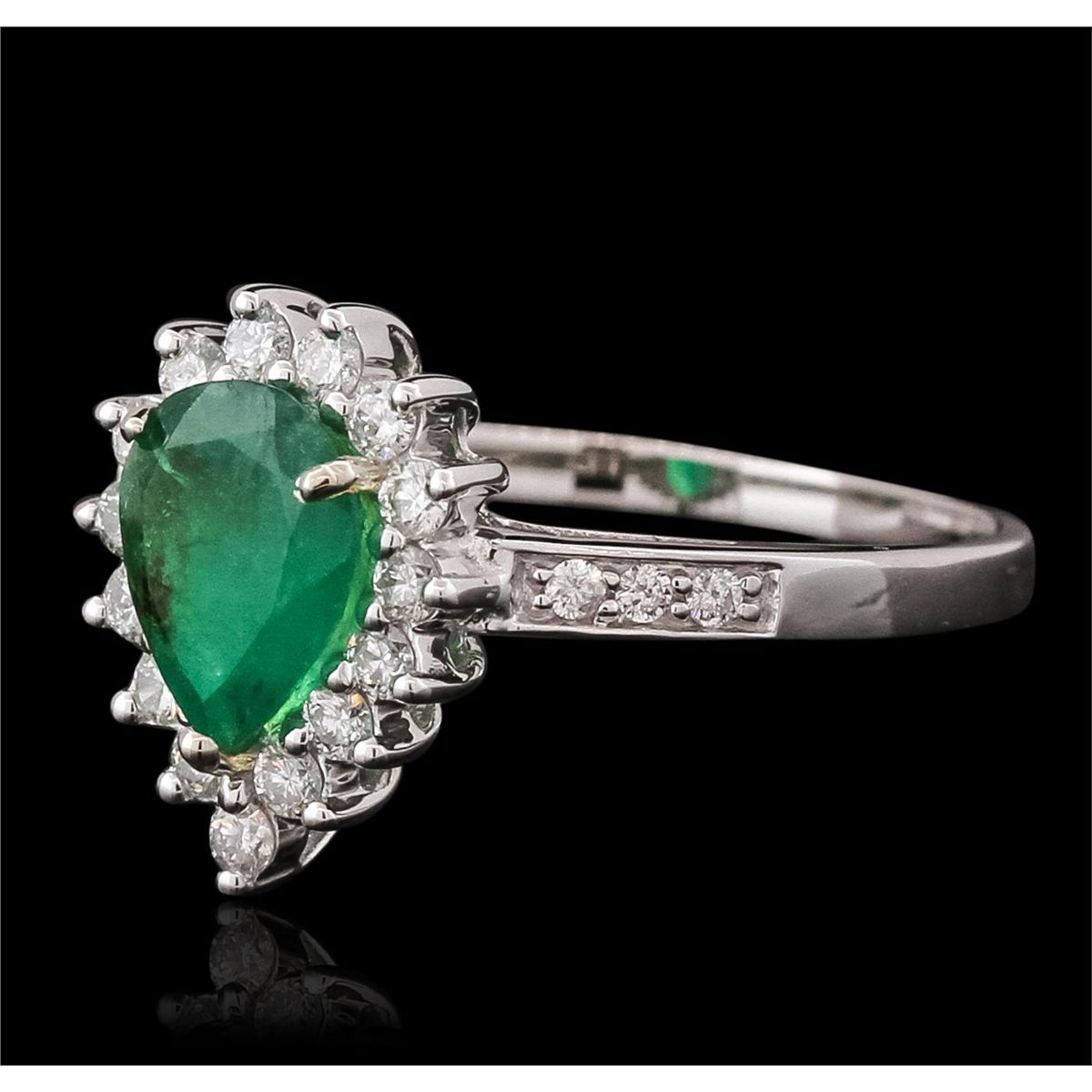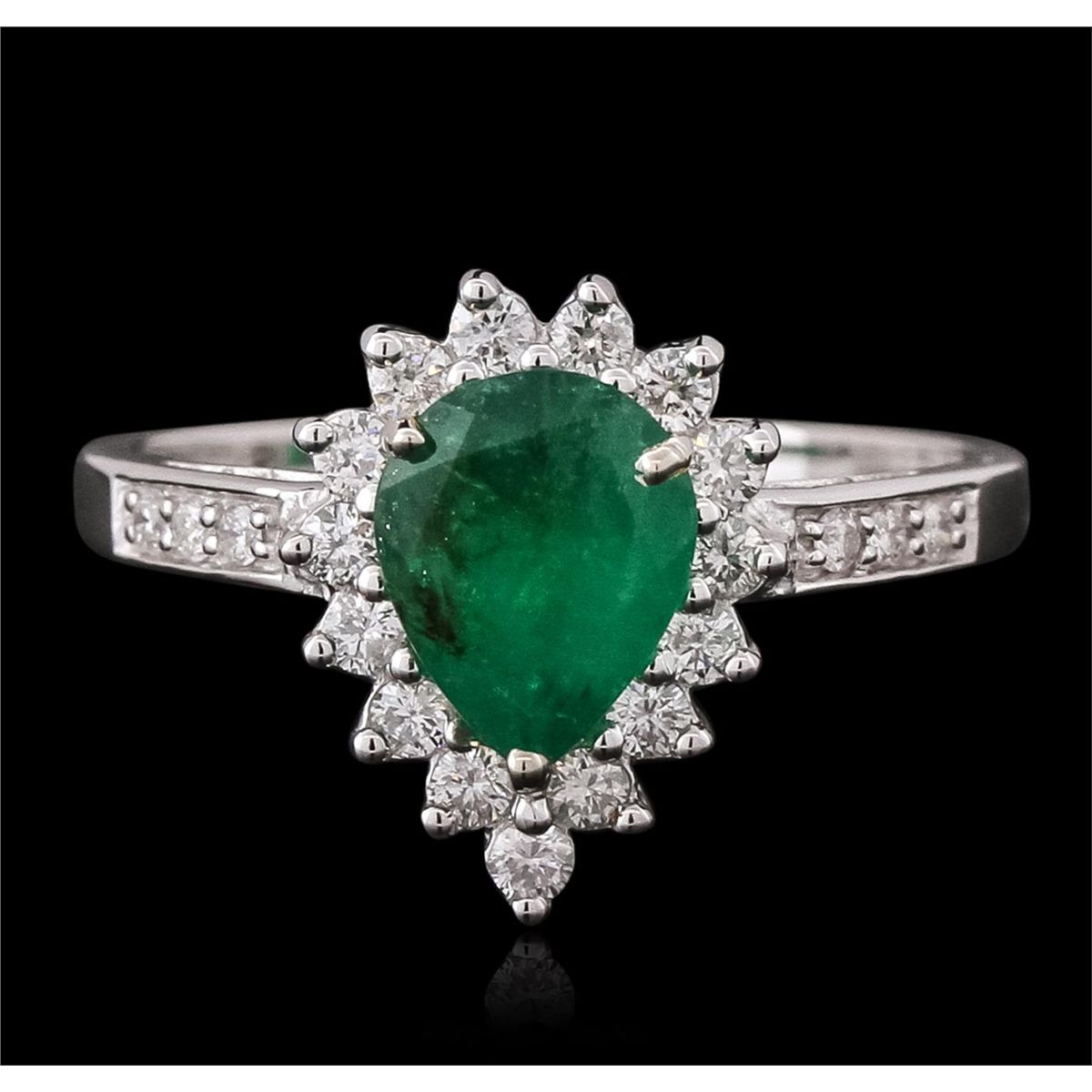 One electronically tested 14KT white gold ladies combination cast & assembled emerald and diamond ring with a flat shank with a bright polish finish. Identified with markings of "14K". Condition is new. Containing: One prong set pear modified brilliant cut natural emerald, measuring 8.73 x 6.58 x 4.17mm, approximate weight of 1.30ct., clarity is heavily included, type III, medium, moderately strong, green color, (GIA G 5/4), cut is good. Twenty prong set round brilliant cut diamonds, measuring 1.60 - 1.10 x 0.81mm (depth est.) approximate total weight of 20 Stones = 0.18ct. Clarity: I-1 to I-2. Color: I - J, Cut is Good. Colored gemstones are presumed to have been subjected to commonly used enhancement processes. All diamonds and colored gemstones are graded in the mounting, unless otherwise stated total weight of Colored Stones 1.30ct. Total Weight of Diamonds 0.18ct. Total Weight of Ring 3.50 grams. GGL Appraised at $4,620.00.