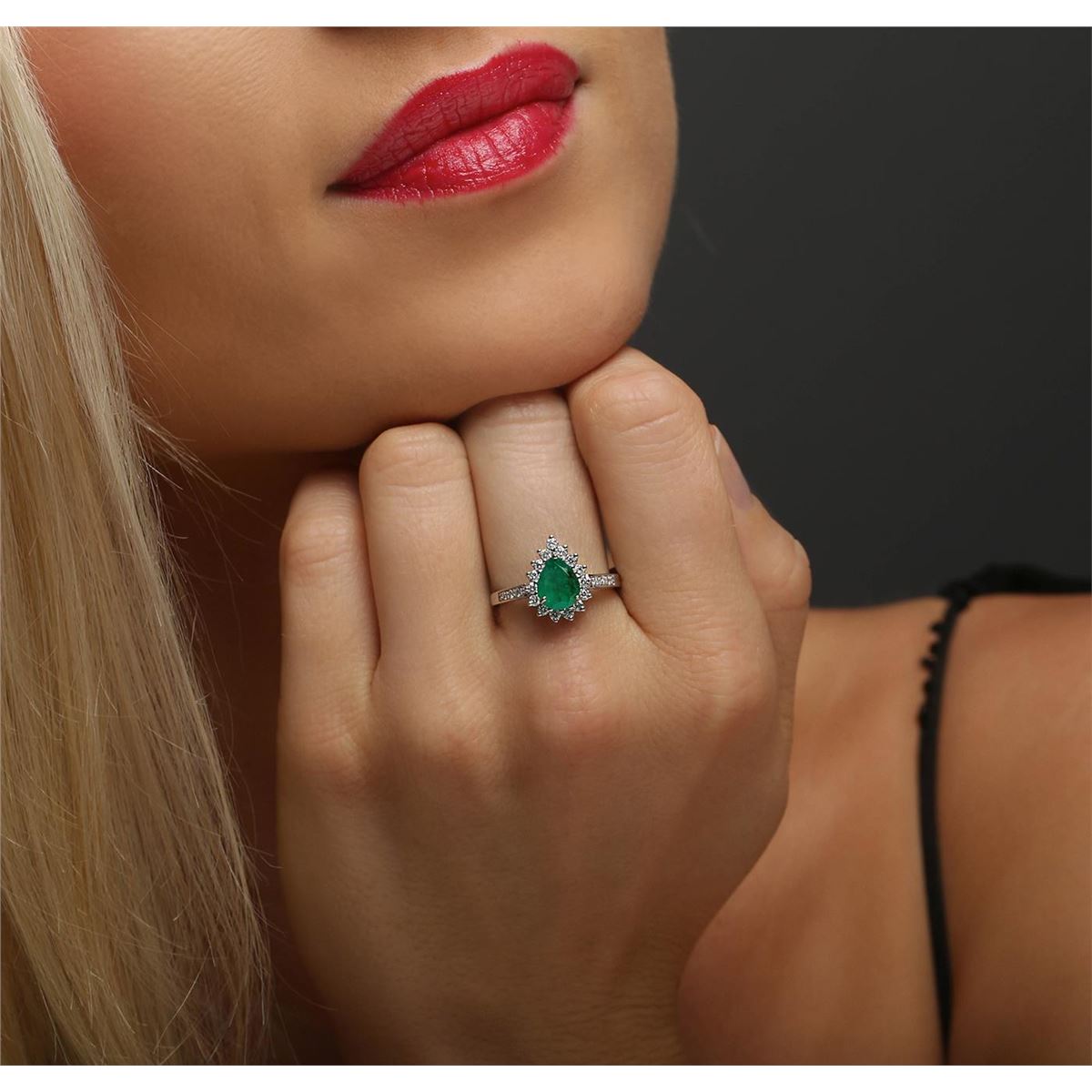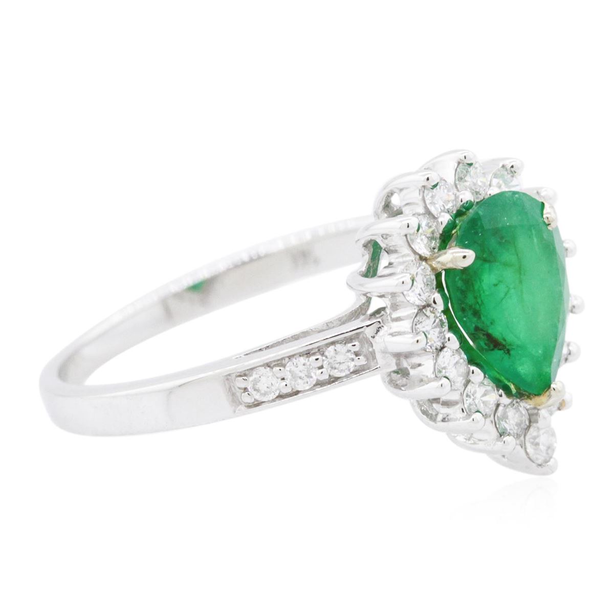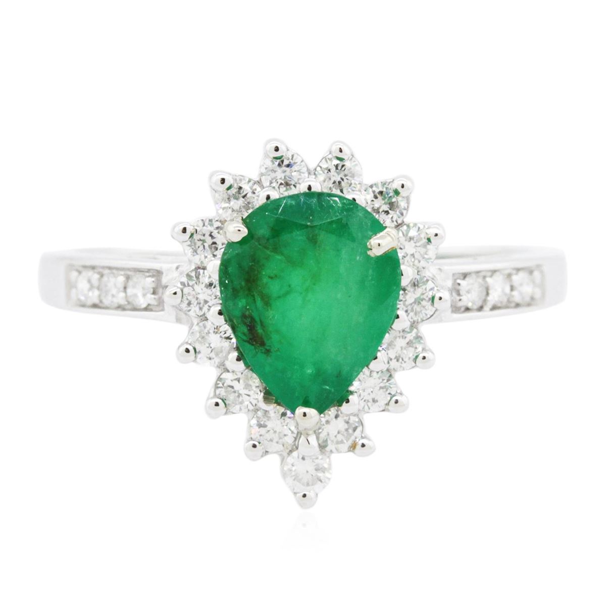 One electronically tested 14KT white gold ladies combination cast & assembled emerald and diamond ring with a flat shank with a bright polish finish. Identified with markings of "14K". Condition is new. Containing: One prong set pear modified brilliant cut natural emerald, measuring 8.73 x 6.58 x 4.17mm, approximate weight of 1.30ct., clarity is heavily included, type III, medium, moderately strong, green color, (GIA G 5/4), cut is good. Twenty prong set round brilliant cut diamonds, measuring 1.60 - 1.10 x 0.81mm (depth est.) approximate total weight of 20 Stones = 0.18ct. Clarity: I-1 to I-2. Color: I - J, Cut is Good. Colored gemstones are presumed to have been subjected to commonly used enhancement processes. All diamonds and colored gemstones are graded in the mounting, unless otherwise stated total weight of Colored Stones 1.30ct. Total Weight of Diamonds 0.18ct. Total Weight of Ring 3.50 grams. GGL Appraised at $4,620.00.