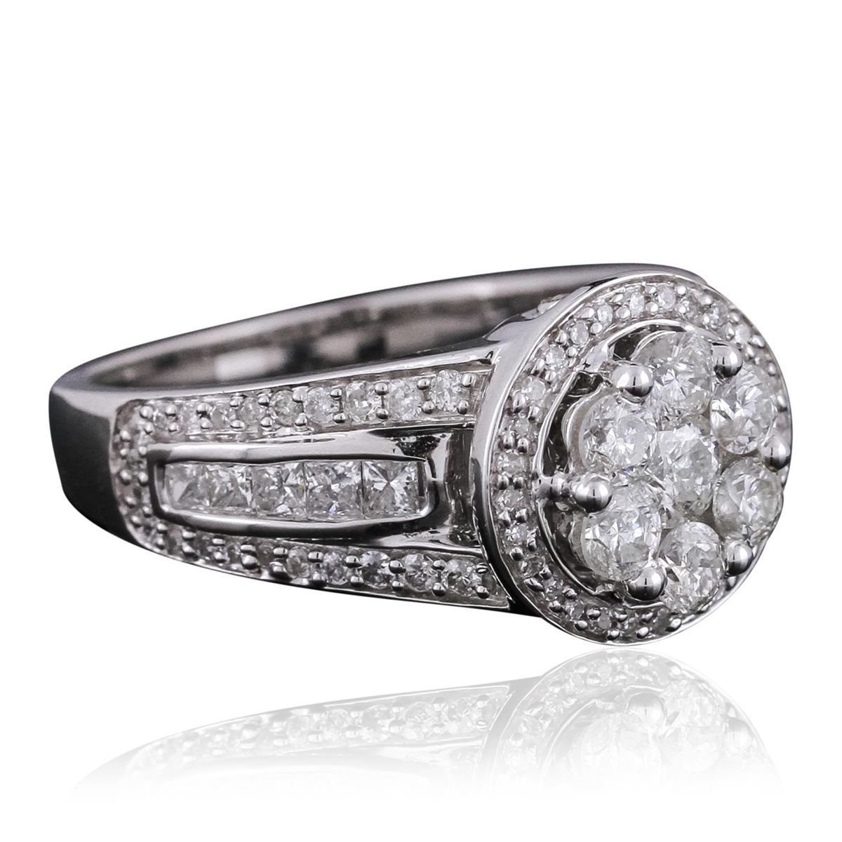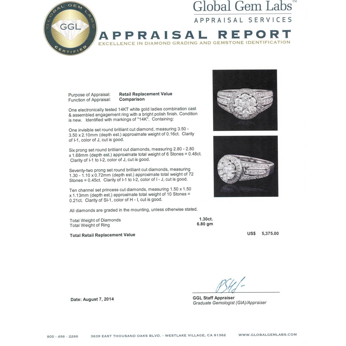 One electronically tested 14KT white gold ladies combination cast & assembled engagement ring with a bright polish finish. Identified with markings of "14K". Condition is new. Containing: One invisible set round brilliant cut diamond, measuring 3.50 - 3.50 x 2.10mm (depth est.) approximate weight of 0.16ct. Clarity: I-1. Color: J, Cut is Good. Six prong set round brilliant cut diamonds, measuring 2.80 - 2.80 x 1.68mm (depth est.) approximate total weight of 6 Stones = 0.48ct. Clarity: I-1 to I-2. Color: J, Cut is Good. Seventy-Two prong set round brilliant cut diamonds, measuring 1.30 - 1.10 x 0.72mm (depth est.) approximate total weight of 72 Stones = 0.45ct. Clarity: I-1 to I-2. Color: I - J, Cut is Good. Ten channel set princess cut diamonds, measuring 1.50 x 1.50 x 1.13mm (depth est.) approximate total weight of 10 Stones = 0.21ct. Clarity: SI-1. Color: H - I, Cut is Good. All diamonds are graded in the mounting, unless otherwise stated. Total Weight of Diamonds 1.30ct. Total Weight of Ring 6.80 grams. GGL Appraised at $5,375.00.