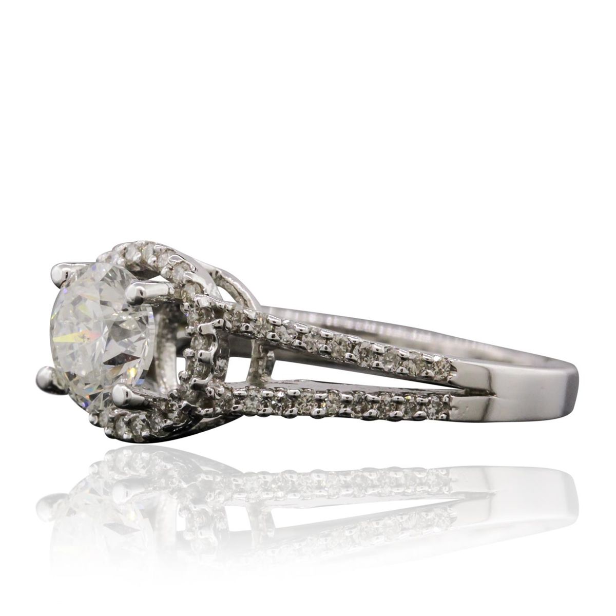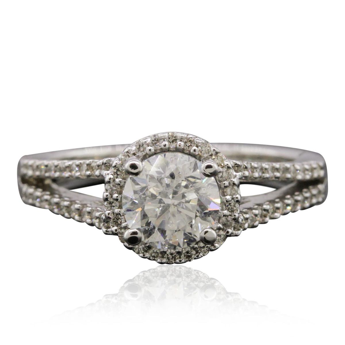 One electronically tested 14KT white gold Ladies combination cast & assembled engagement ring with a bright polish finish. Condition is new. Identified with markings of "14K". Containing: One prong set round brilliant cut diamond, measuring 6.20 - 6.14 x 4.06mm (depth est.) approximate weight of 1.03ct. Clarity: I-1. Color: F, Cut is Good. Fifty-Eight prong set round brilliant cut diamonds, measuring 1.10 - 1.10 x 0.66mm (depth est.) approximate. Total Weight of 58 Stones = 0.27ct. Clarity: SI-1 to SI-3. Color: D - E, Cut is Good. EGL USA GEM ID# US 911348404D. All diamonds are graded in the mounting, unless otherwise stated. Total Weight of Diamonds 1.30ct. Total Weight of Engagement Ring 4.00 grams. GGL Appraised at $19,895.00.