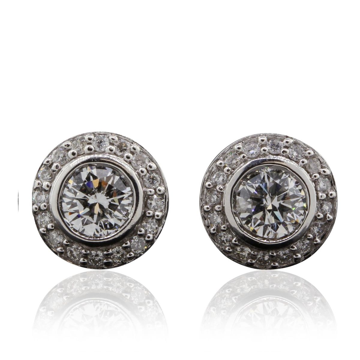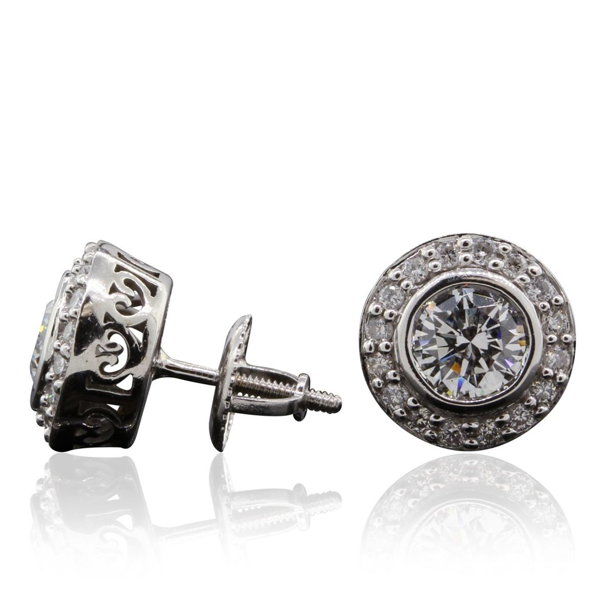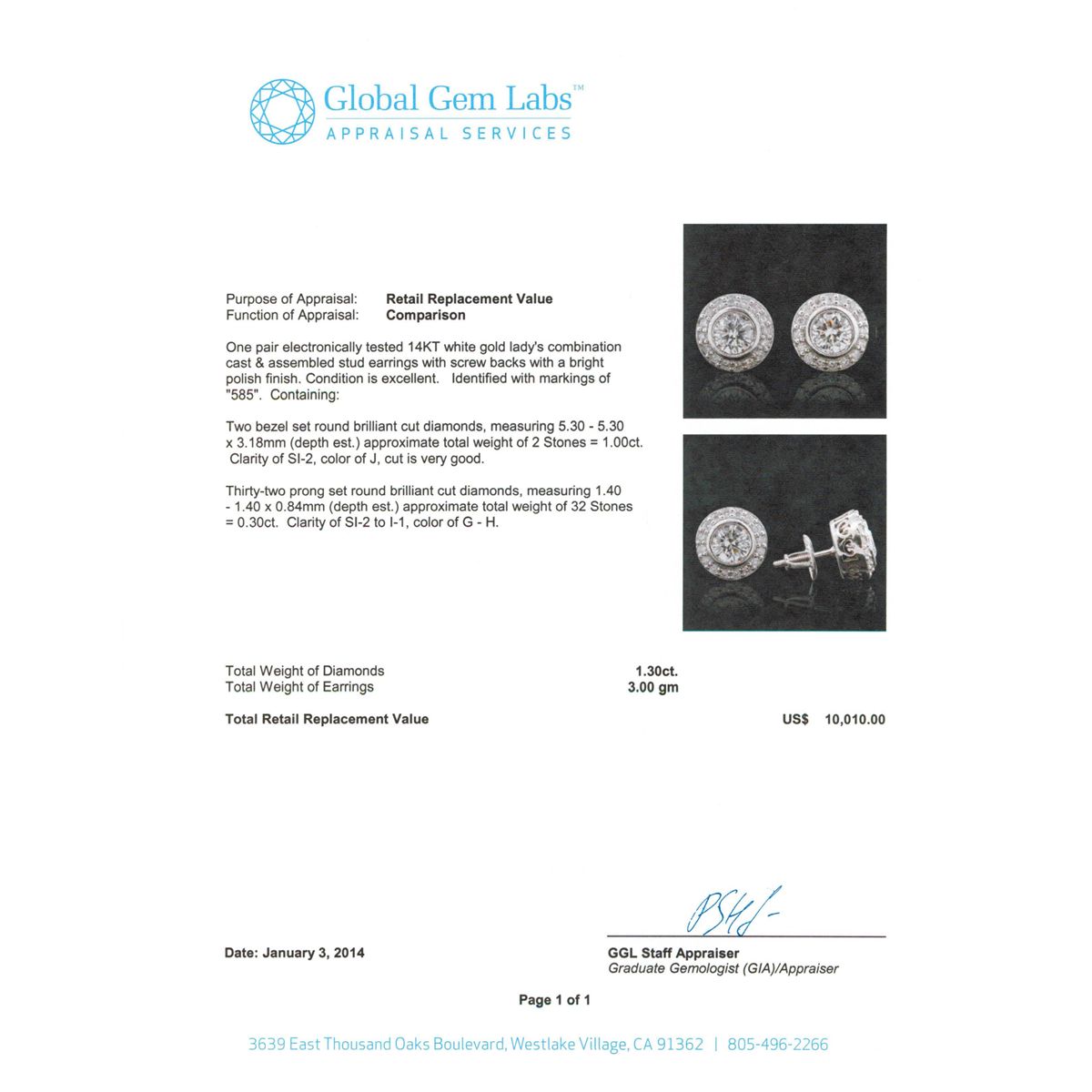 One pair electronically tested 14KT white gold Ladies combination cast & assembled stud earrings with screw backs with a bright polish finish. Identified with markings of "585". Condition is excellent. Containing: Two bezel set round brilliant cut diamonds, measuring 5.30 - 5.30 x 3.18mm (depth est.) approximate total weight of 2 Stones = 1.00ct. Clarity of SI-2, Color of J, Cut is Very Good. Thirty-Two prong set round brilliant cut diamonds, measuring 1.40 - 1.40 x 0.84mm (depth est.) approximate total weight of 32 Stones = 0.30ct. Clarity of SI-2 to I-1, Color of G - H. Total Weight of Diamonds 1.30ct. Total Weight of Earrings 3.00gm. GGL Appraised at $10,010.00.