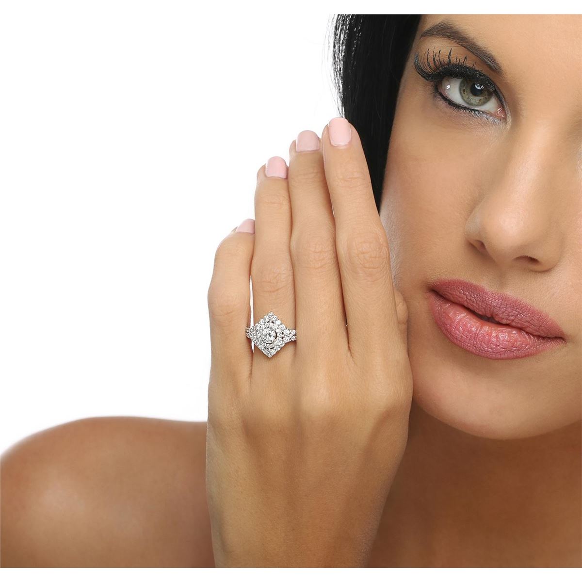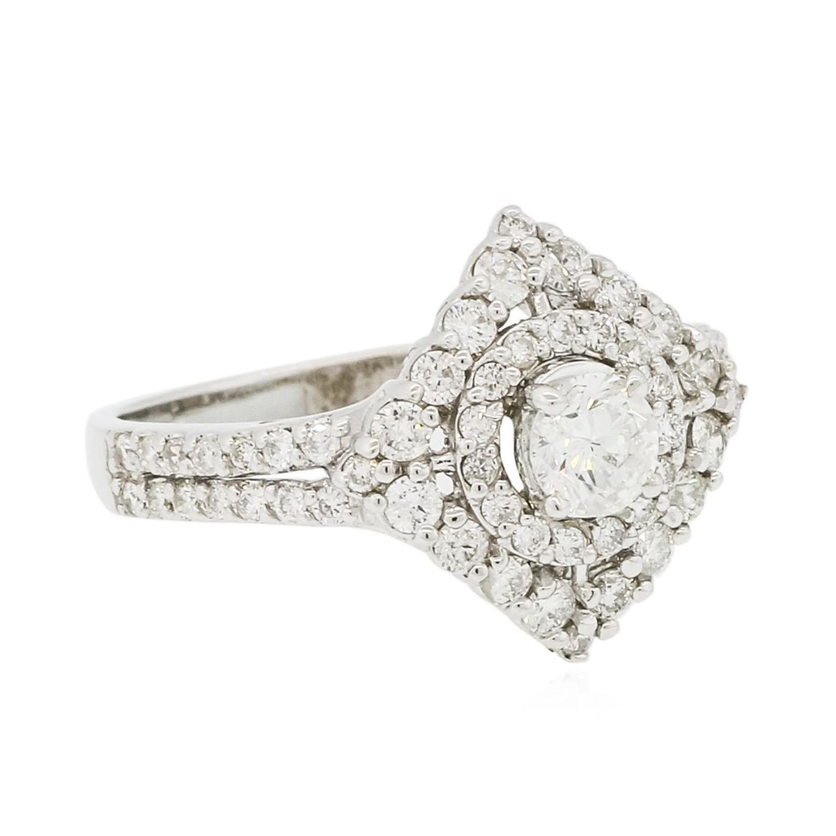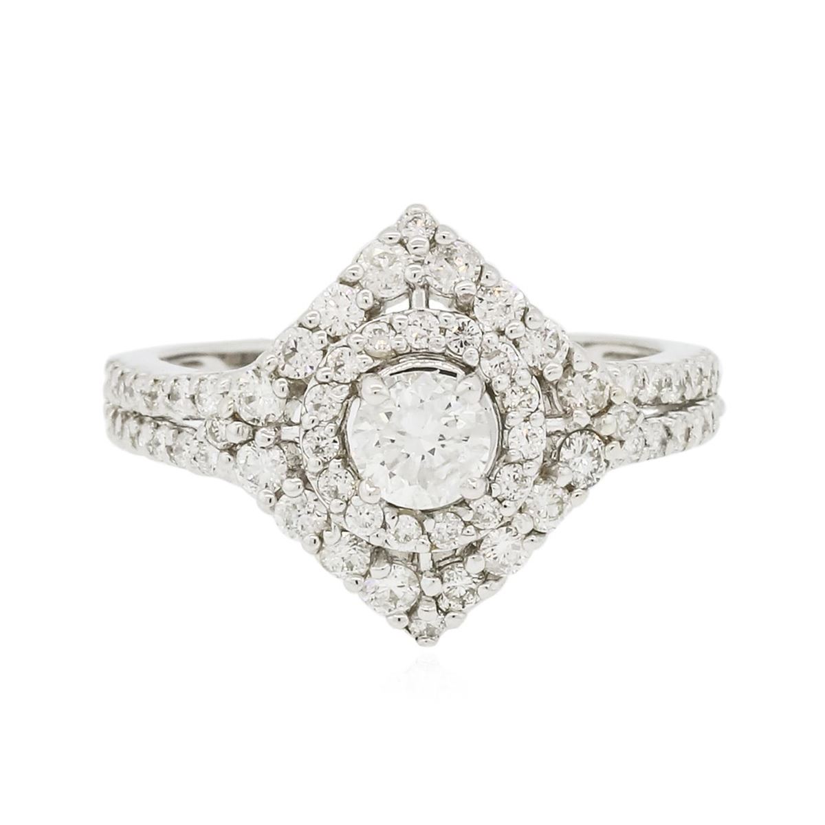 One electronically tested 14KT white gold ladies combination cast & assembled engagement ring with a bright polish finish. Condition is new. Identified with markings of "K14". Containing: One prong set round brilliant cut diamond, measuring 4.50 - 4.50 x 2.90mm (depth est.) approximate weight of 0.36ct. Clarity: SI-2. Color: J, Cut is Good. Sixty-Three prong set round brilliant cut diamonds, measuring 1.80 - 1.30 x 0.93mm (depth est.) approximate. Total Weight of 63 Stones = 0.95ct. Clarity: SI-2 to I-1. Color: I - J, Cut is Good. All diamonds are graded in the mounting, unless otherwise stated. Total Weight of Diamonds 1.31ct. Total Weight of Ring 3.70 grams. GGL Appraised at $5,905.00.