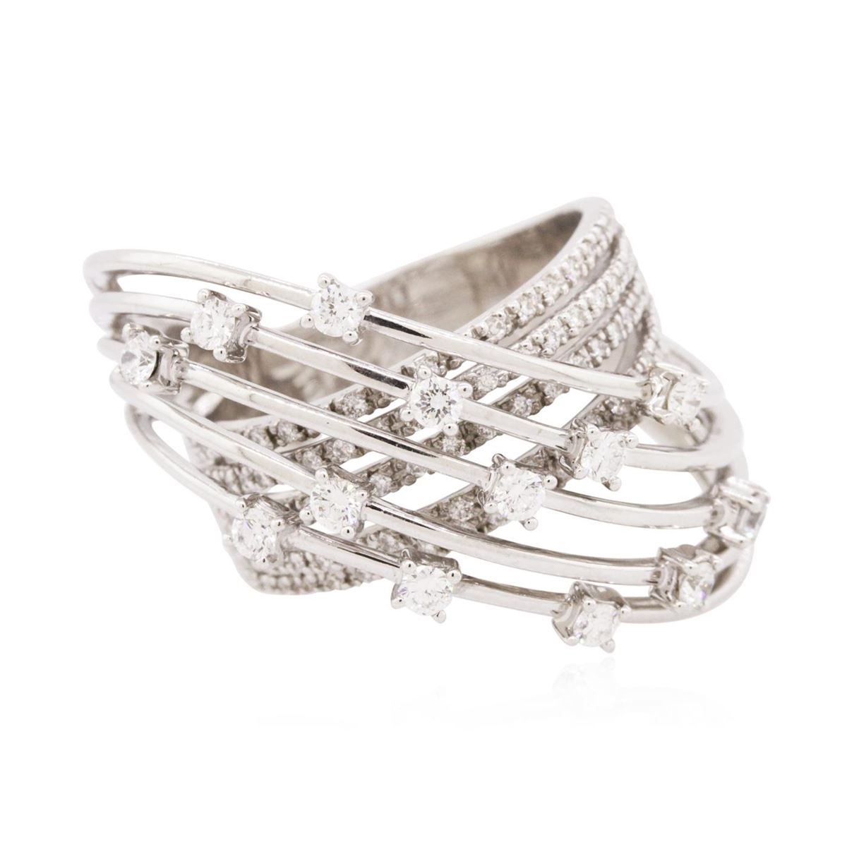 One electronically tested 14KT white gold ladies cast diamond ring with a bright polish finish. The ring features criss-crossing elevated diamond set curvatures, completed by a five and one-half millimeter wide band. Trademark is Mi. Identified with markings of "14K". Condition is new, good workmanship. Containing: Thirteen prong set round brilliant cut diamonds, measuring 2.40 - 2.30 x 1.41mm (depth est.) approximate total weight of 13 Stones = 0.71ct. Graded in the setting. Clarity: VS-2 to SI-1. Color: G - I Ninety prong set round brilliant cut diamonds, measuring 1.20 - 1.10 x 0.69mm (depth est.) approximate total weight of 90 Stones = 0.60ct. Graded in the setting. Clarity: VS-1 to SI-1. Color: G - I. Total Weight of Diamonds 1.31ct. Total Weight of Ring 15.00 grams. AIG Appraised at $7,700.00.