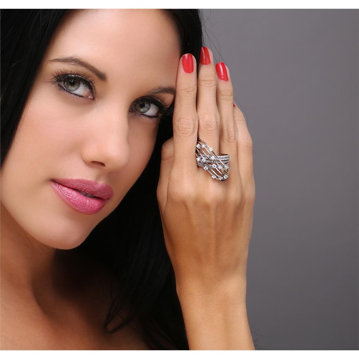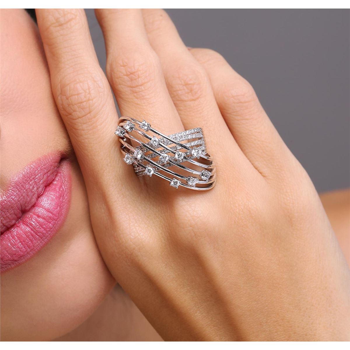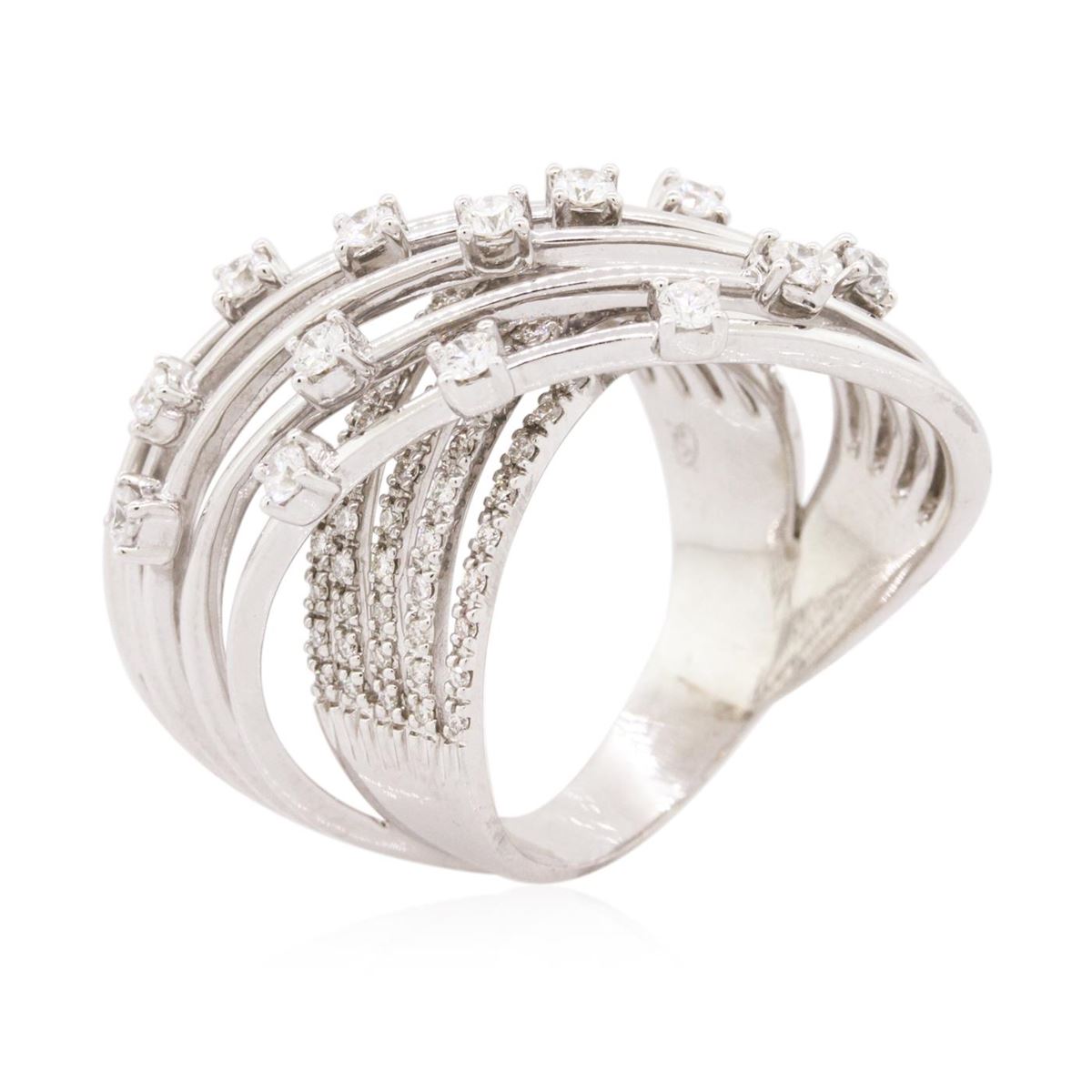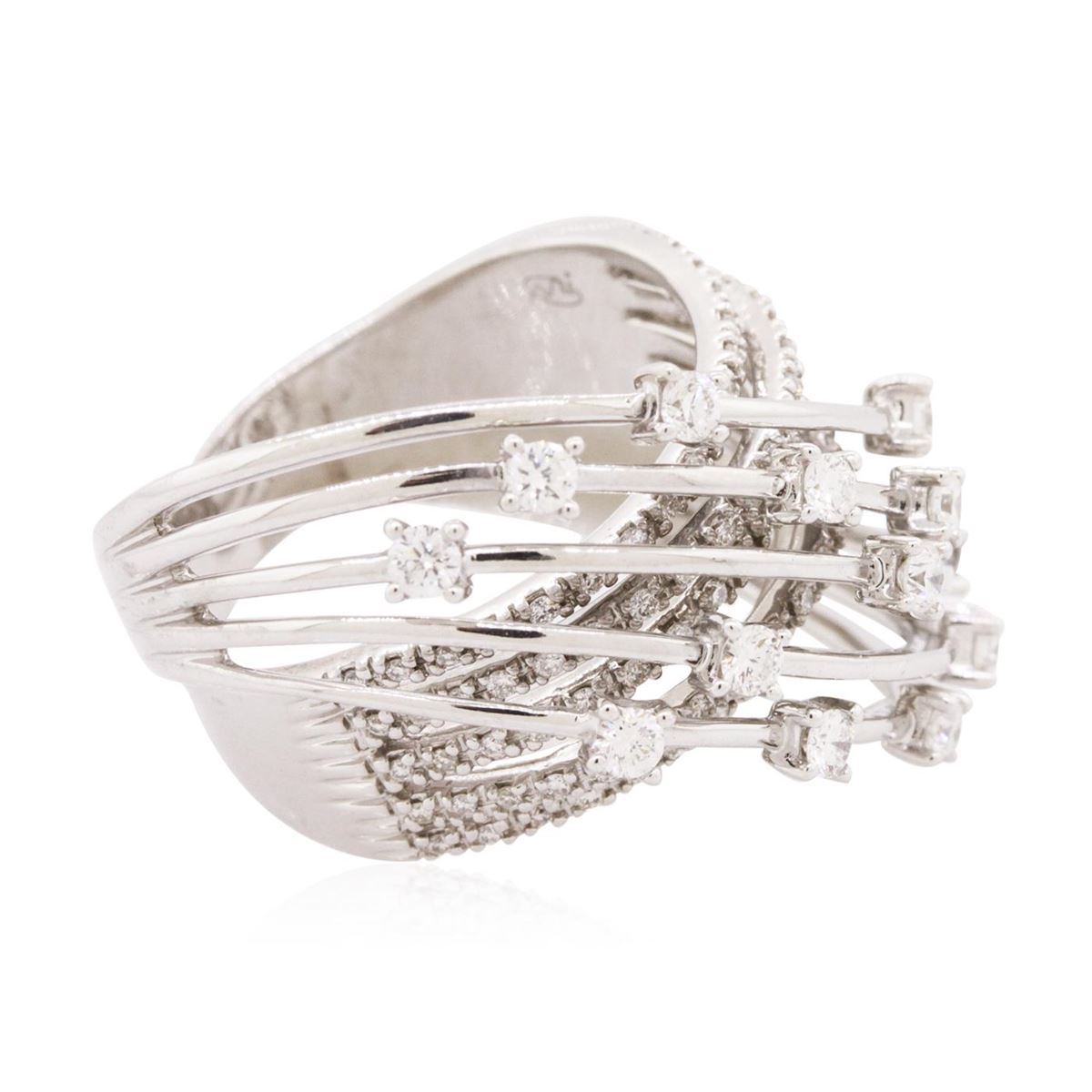 One electronically tested 14KT white gold ladies cast diamond ring with a bright polish finish. The ring features criss-crossing elevated diamond set curvatures, completed by a five and one-half millimeter wide band. Trademark is Mi. Identified with markings of "14K". Condition is new, good workmanship. Containing: Thirteen prong set round brilliant cut diamonds, measuring 2.40 - 2.30 x 1.41mm (depth est.) approximate total weight of 13 Stones = 0.71ct. Graded in the setting. Clarity: VS-2 to SI-1. Color: G - I Ninety prong set round brilliant cut diamonds, measuring 1.20 - 1.10 x 0.69mm (depth est.) approximate total weight of 90 Stones = 0.60ct. Graded in the setting. Clarity: VS-1 to SI-1. Color: G - I. Total Weight of Diamonds 1.31ct. Total Weight of Ring 15.00 grams. AIG Appraised at $7,700.00.