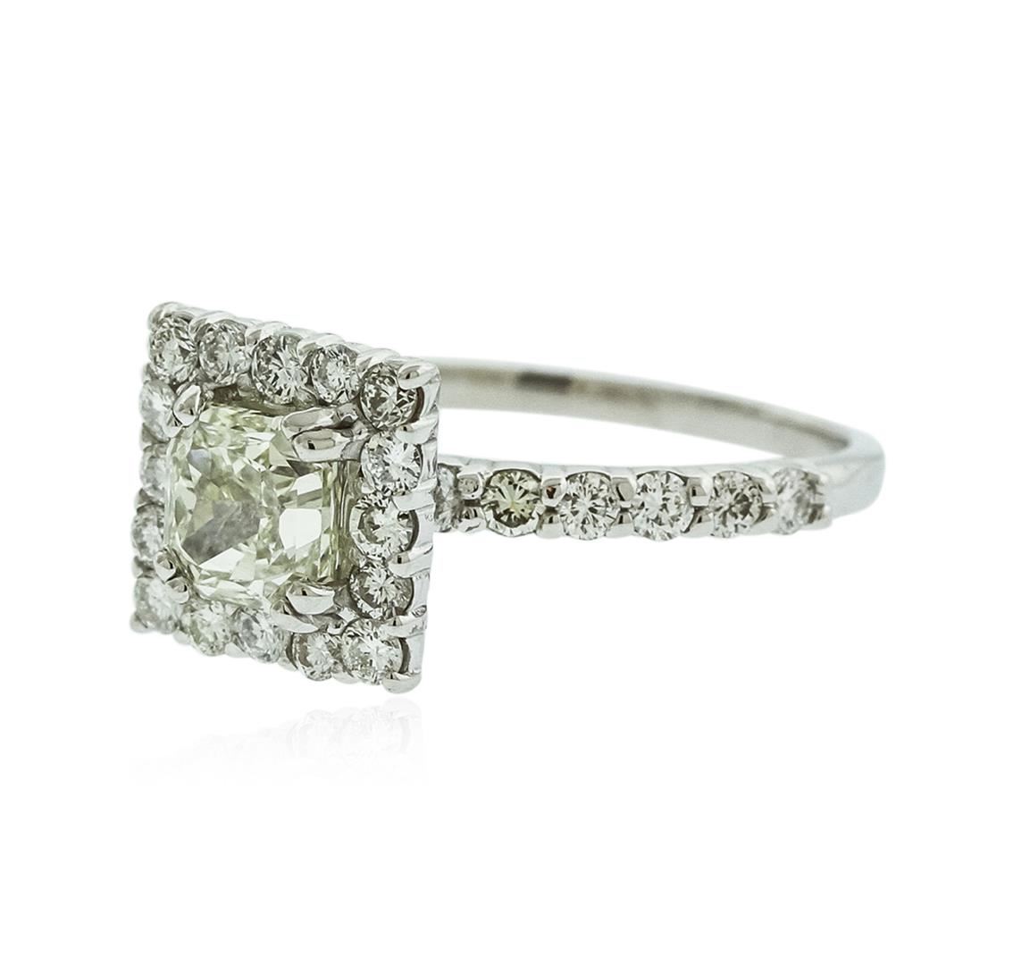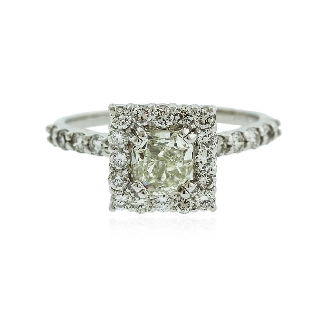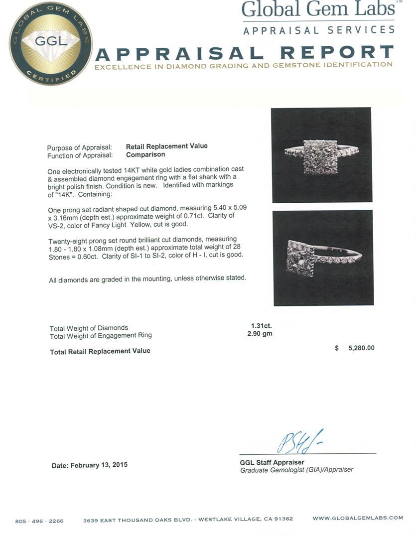 One electronically tested 14KT white gold ladies combination cast & assembled diamond engagement ring with a flat shank with a bright polish finish. Identified with markings of "14K". Condition is new. Containing: One prong set radiant shaped cut diamond, measuring 5.40 x 5.09 x 3.16mm (depth est.) approximate weight of 0.71ct. Clarity: VS-2, Cut is Good. Twenty-Eight prong set round brilliant cut diamonds, measuring 1.80 - 1.80 x 1.08mm (depth est.) approximate total weight of 28 Stones = 0.60ct. Clarity: SI-1 to SI-2. Color: H - I, Cut is Good. All diamonds are graded in the mounting, unless otherwise stated. Total Weight of Diamonds 1.31ct. Total Weight of Engagement Ring 2.90 grams. GGL Appraised at $5,280.00.