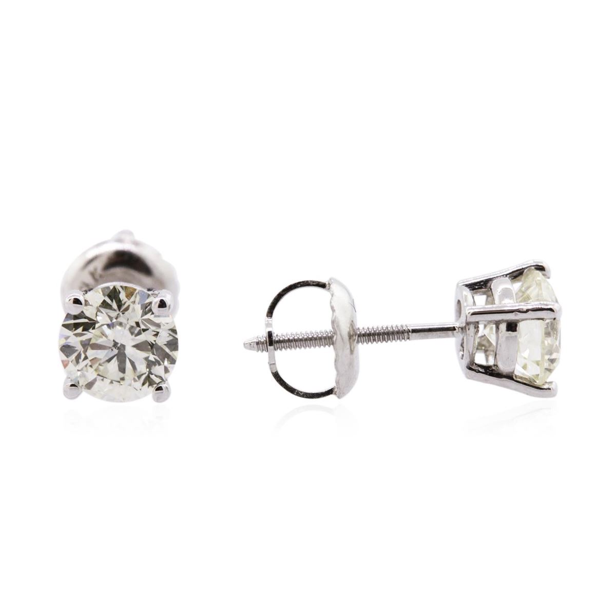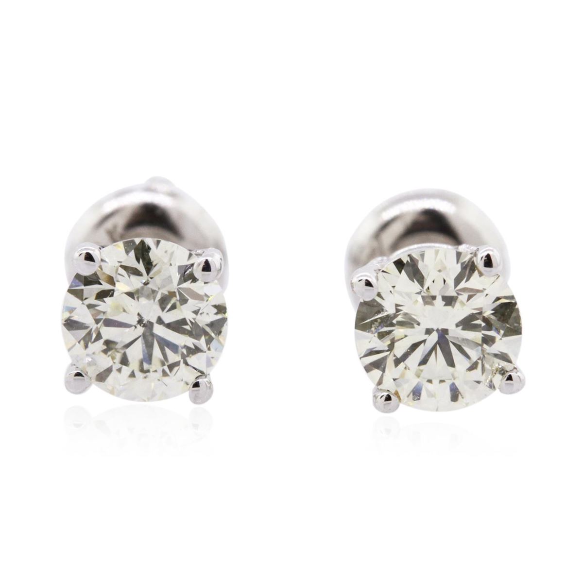 One pair electronically tested 14KT white gold cast & assembled diamond solitaire earrings with screw backs. Bright polish finish. Condition is new, good workmanship. Containing: One prong set round brilliant cut diamond, measuring 5.28 - 5.15 x 3.40mm (depth est.) approximate weight of 0.66ct with a medium blue fluorescence. Graded in the setting. Clarity: SI-2. Depth: 65.1%. Table 57.5%. One prong set round brilliant cut diamond, measuring 5.25 - 5.23 x 3.30mm (depth est.) approximate weight of 0.65ct. Graded in the setting. Clarity: SI-2. Depth: 63.0%. Table 59.2%. Total Weight of Diamonds 1.31ct. Total Weight of Earrings 0.97 grams. AIG Appraised at $4,465.00.