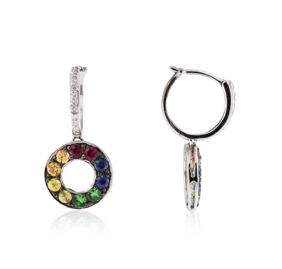 One pair of earrings featuring: 14KT white gold weighing 2.72 grams containing four blue sapphires with a total weight of 0.28ct, four yellow sapphires with a total weight of 0.26ct, four orange sapphires with a total weight of 0.26ct, four tsavorites with a total weight of 0.23ct, four rubies with a total weight of 0.28, and 18 diamonds with a total weight of 0.08ct.