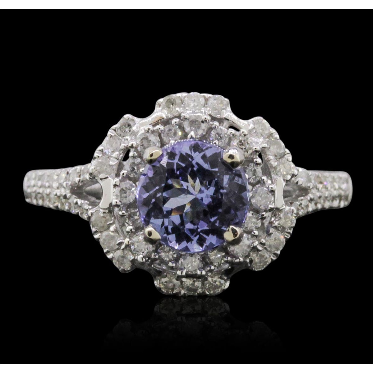 One electronically tested 14KT white gold ladies combination cast & assembled tanzanite and diamond ring with a split shank with a bright polish finish. Identified with markings of "14K". Condition is new. Containing: One prong set round modified brilliant cut natural tanzanite, measuring 6.90 - 6.90 x 4.10 mm, approximate weight of 1.31ct., clarity is eye clean, type I, medium light, very slightly grayish, violet color, (GIA V 4/3), cut is very good. Seventy prong set round brilliant cut diamonds, measuring 1.20 - 1.20 x 0.72mm (depth est.) approximate total weight of 70 Stones = 0.44ct. Clarity: I-1 to I-2. Color: H - I, Cut is Good. Colored gemstones are presumed to have been subjected to commonly used enhancement processes. All diamonds and colored gemstones are graded in the mounting, unless otherwise stated. Total Weight of Colored Stones 1.31ct. Total Weight of Diamonds 0.44ct. Total Weight of Ring 4.40 grams. GGL Appraised at $4,780.00. GGL Appraised at $17,335.00.