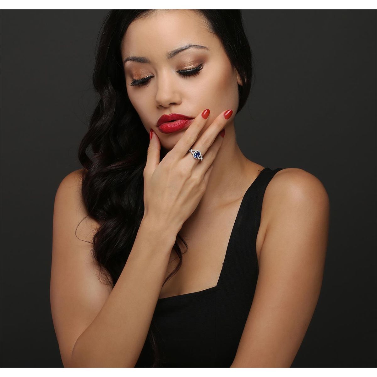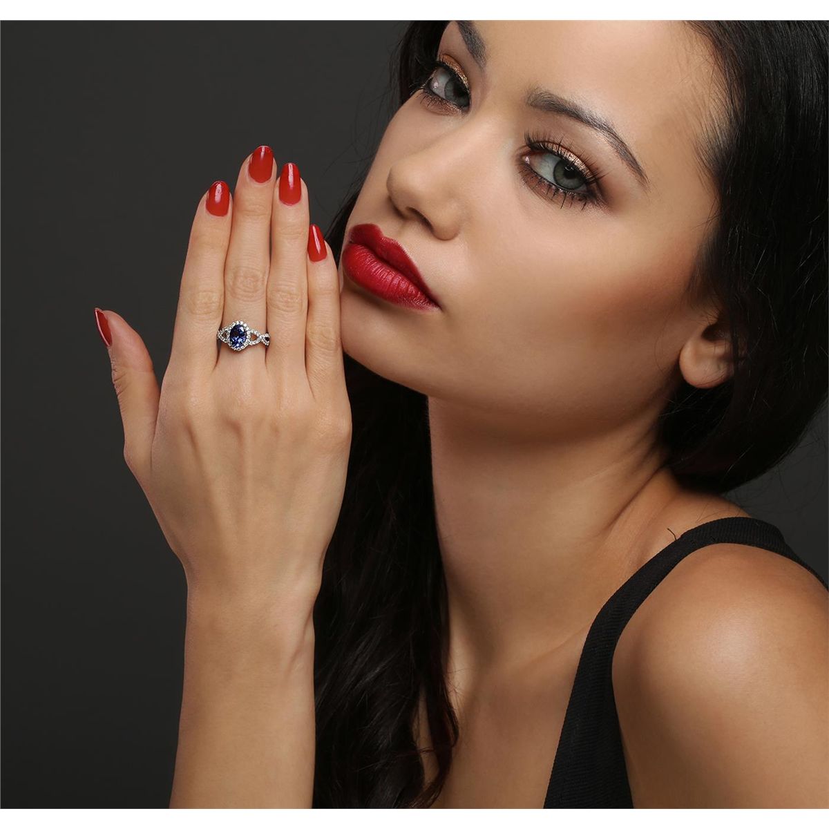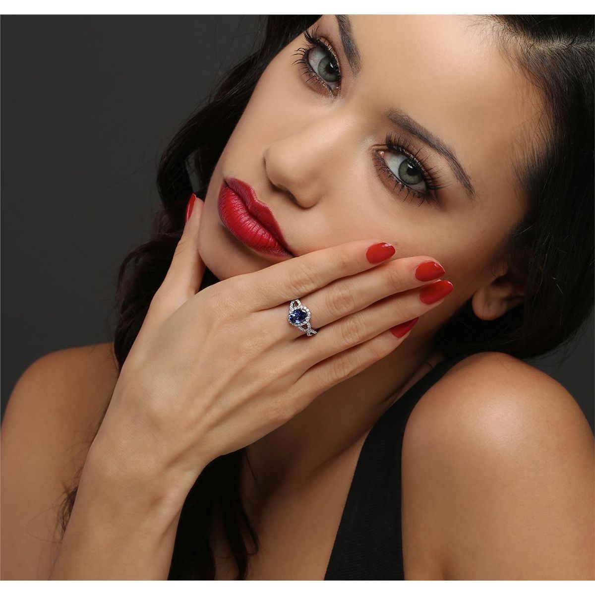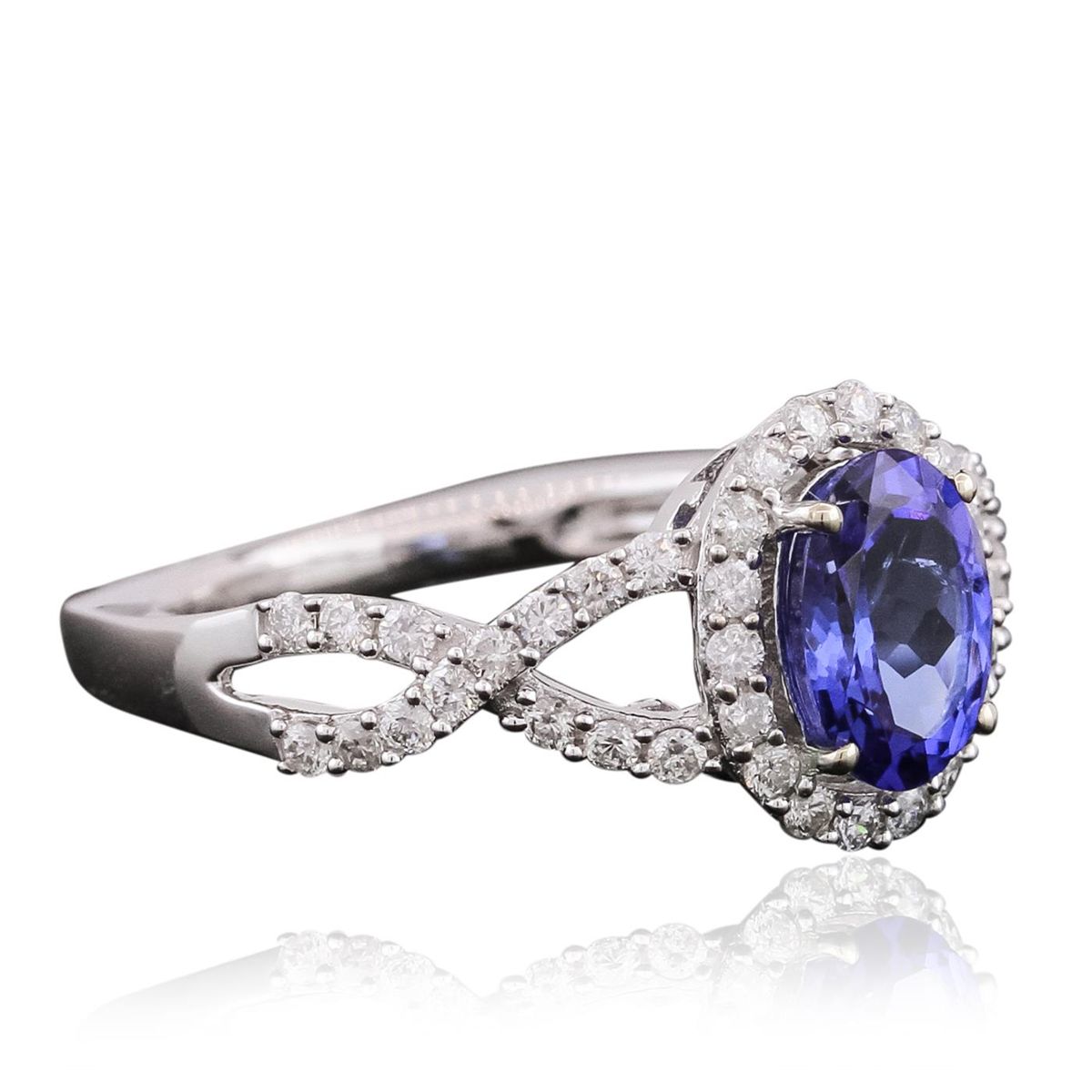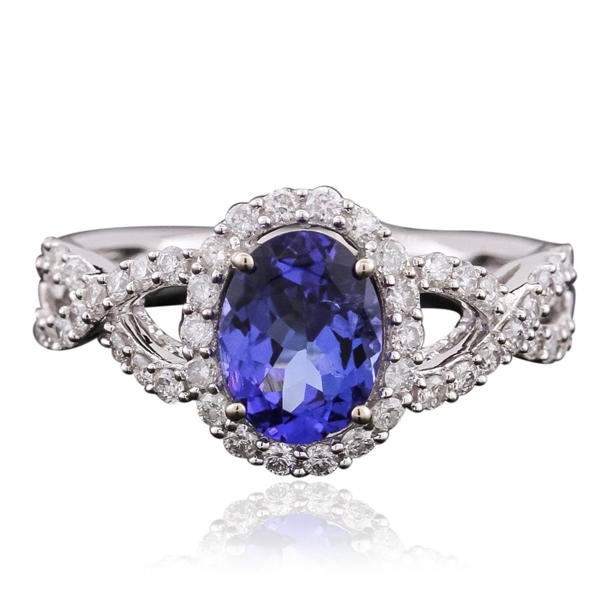 One electronically tested 14KT white gold ladies cast tanzanite and diamond ring with a bright polish finish. The featured tanzanite is set within a diamond bezel supported by intertwining diamond set shoulders, completed by a two millimeter wide band. Trademark is Orianne. Identified with markings of "14K". Condition is new, good workmanship. Containing: One prong set oval mixed cut natural tanzanite, measuring 8.10 x 6.10 x 3.65mm, 6% bulge factor, approximate weight of 1.31ct., clarity is eye clean, type I, medium dark, very slightly grayish, violetish blue color, (GIA vB 6/3), cut is good. Transmitting light with no distortion, transparent. Graded in the setting. Tanzanite is a very rare gemstone that is only found in the country of Tanzania. Originally discovered in 1967. Tiffany & Company, named the stone Tanzanite. It is found in the Usumburu Mountains that border the Umba Valley of northern Tanzania. Tanzanite occurs in gray, brown, violet, blue, reddish-purple, & green. The gem is interesting because of its exceptional pleochroism. Rotated in different directions a tanzanite will exhibit multiple changes of color. Tanzanite has a low tolerance to ultrasonic cleaning, and should not be cleaned using this method. Forty-Six prong set round brilliant cut diamonds, measuring 1.30 - 1.20 x 0.75mm (depth est.) approximate total weight of 46 Stones = 0.42ct. Graded in the setting. Clarity: I-1 to I-2. Color: G - I. Total Weight of Colored Stones 1.31ct. Total Weight of Diamonds 0.42ct. Total Weight of Ring 3.42 grams. AIG Appraised at $4,310.00.