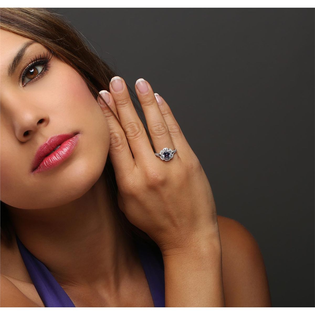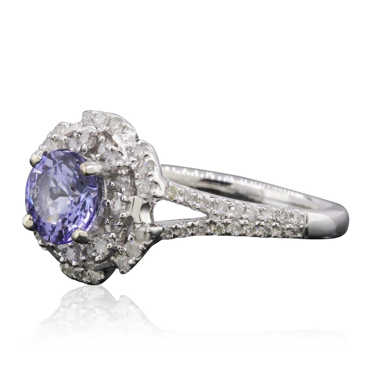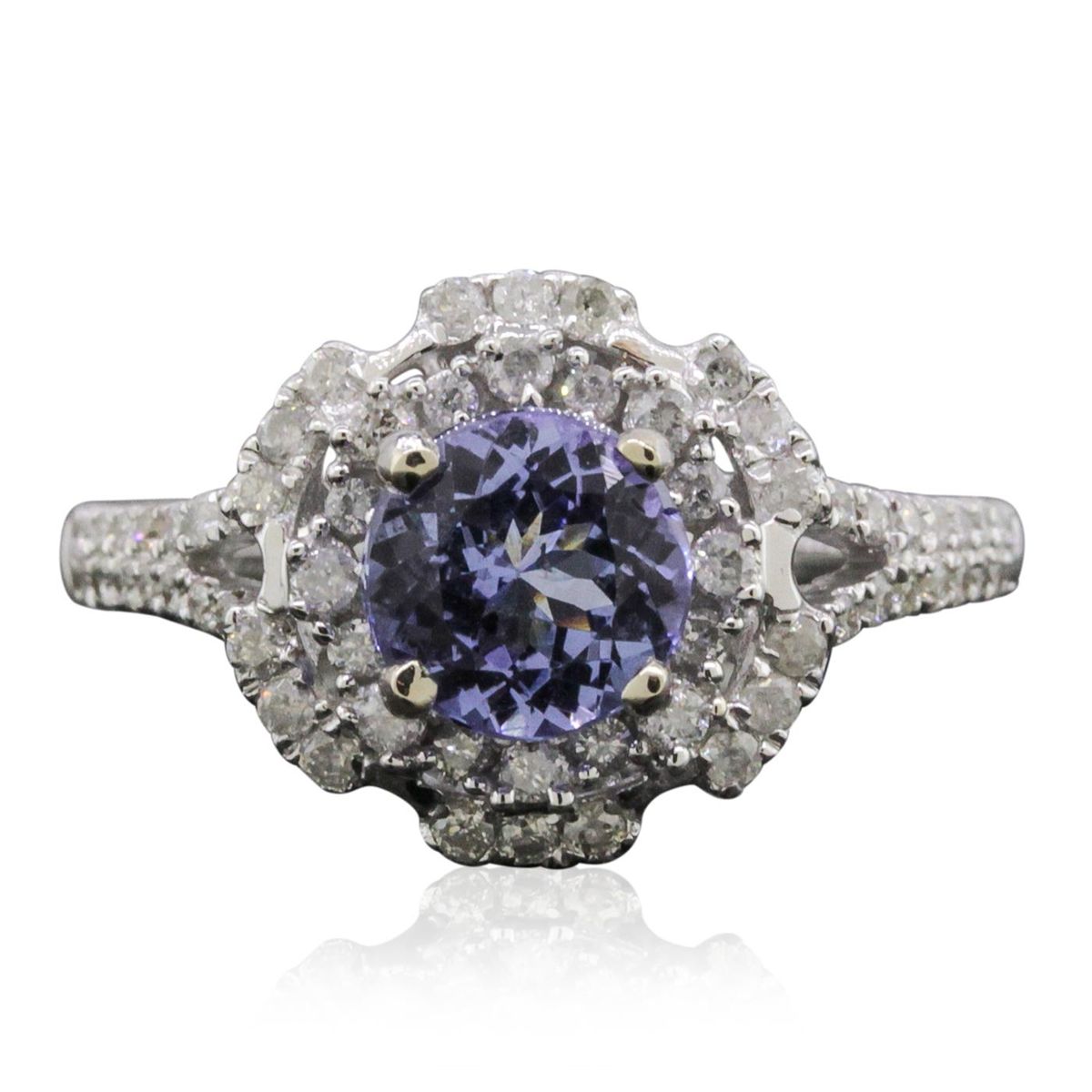 One electronically tested 14KT white gold ladies combination cast & assembled tanzanite and diamond ring with a split shank with a bright polish finish. Identified with markings of "14K". Condition is new. Containing: One prong set round modified brilliant cut natural tanzanite, measuring 6.90 - 6.90 x 4.10 mm, approximate weight of 1.31ct., clarity is eye clean, type I, medium light, very slightly grayish, violet color, (GIA V 4/3), cut is very good. Seventy prong set round brilliant cut diamonds, measuring 1.20 - 1.20 x 0.72mm (depth est.) approximate total weight of 70 Stones = 0.44ct. Clarity: I-1 to I-2. Color: H - I, Cut is Good. Colored gemstones are presumed to have been subjected to commonly used enhancement processes. All diamonds and colored gemstones are graded in the mounting, unless otherwise stated. Total Weight of Colored Stones 1.31ct. Total Weight of Diamonds 0.44ct. Total Weight of Ring 4.40 grams. GGL Appraised at $4,780.00.